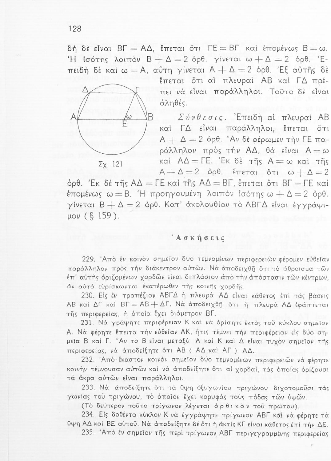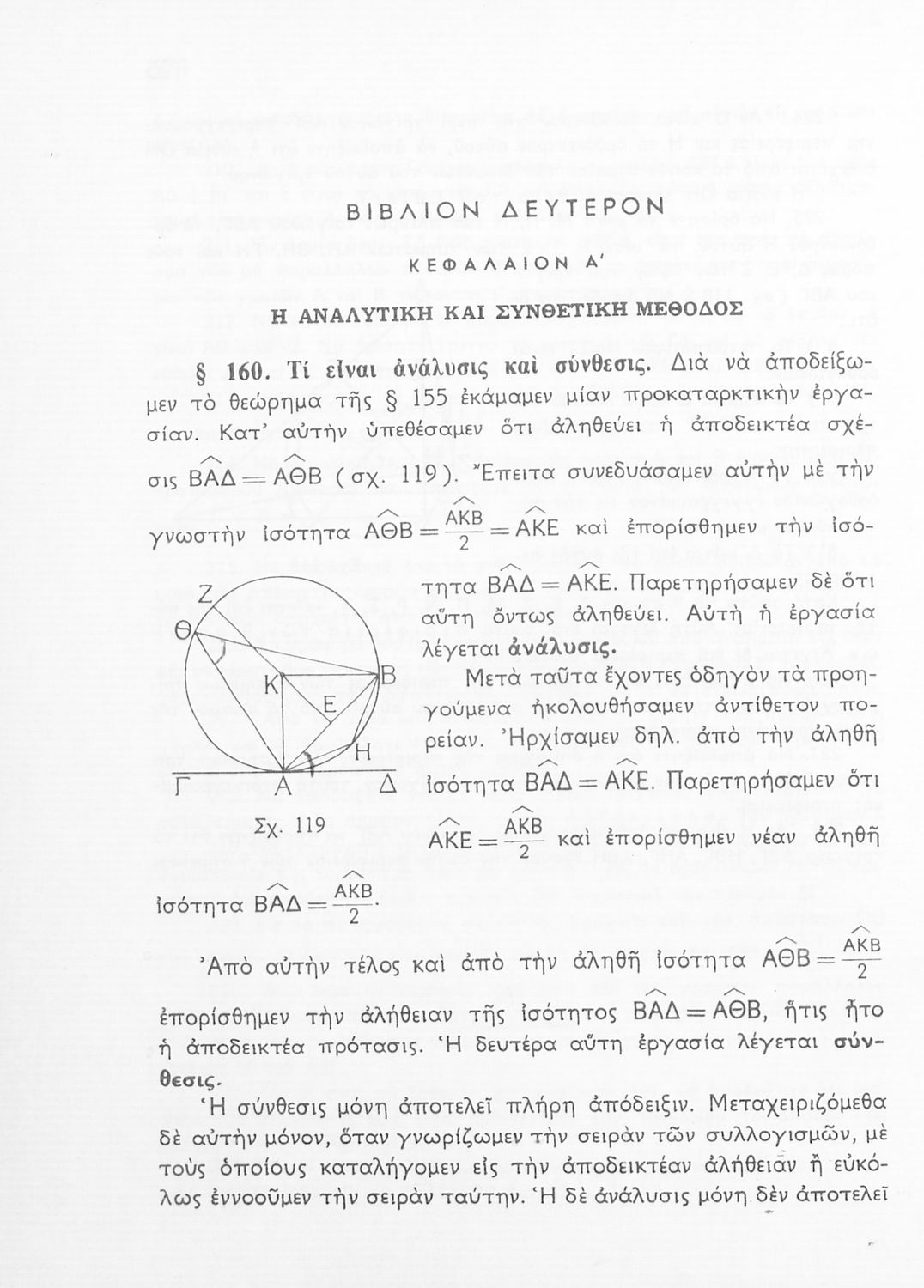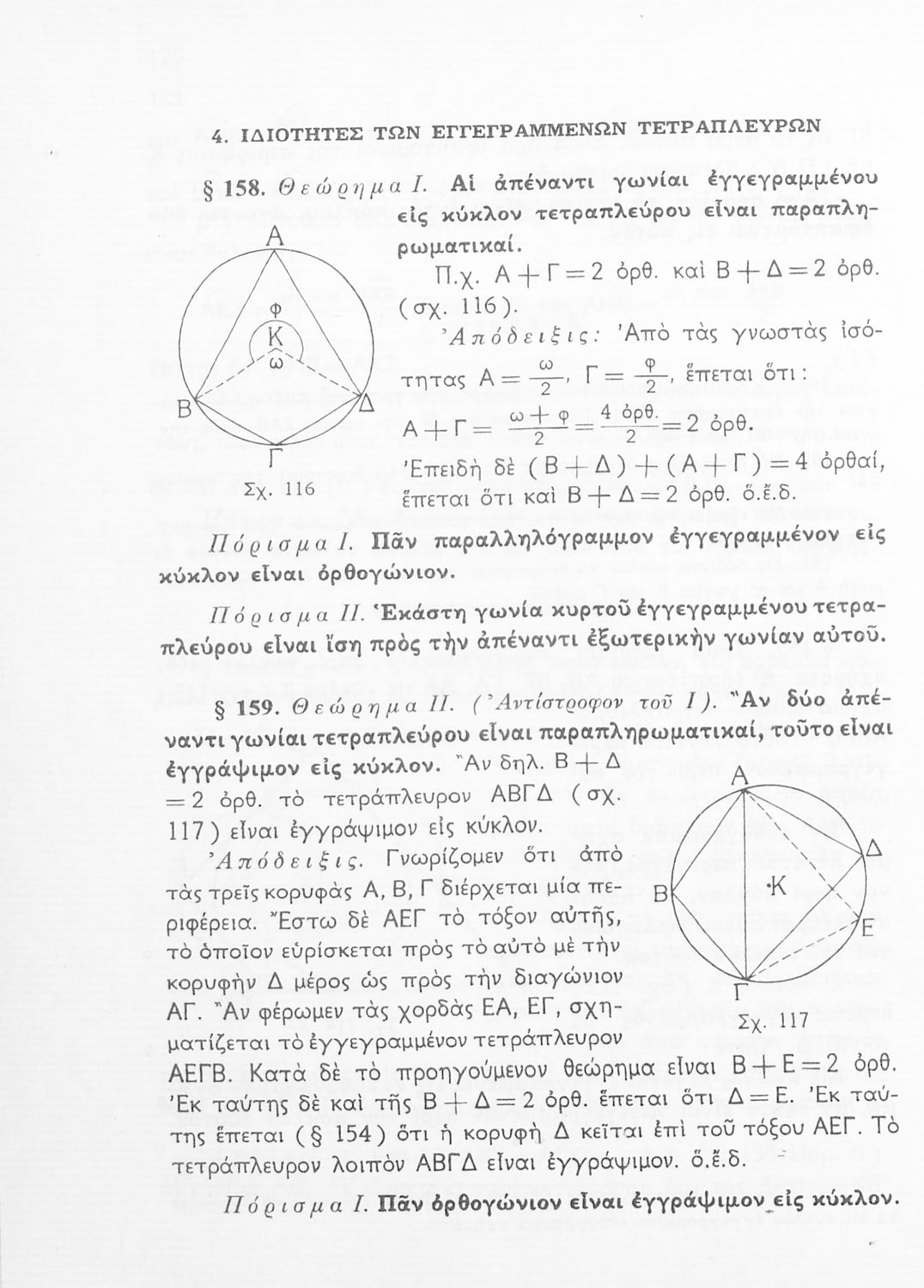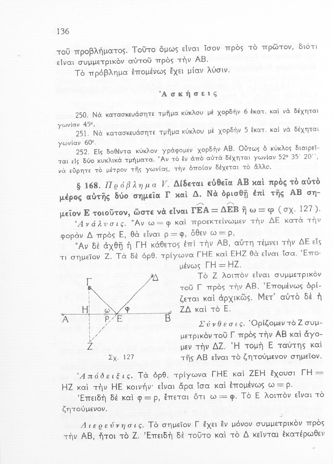 Σχολικό εγχειρίδιο Γεωμετρίας για τις Γ΄, Δ΄, Ε΄, ΣΤ΄ Γυμνασίου που εστιάζει στα βασικά θεωρήματα και ιδιότητες των γεωμετρικών σχημάτων. Φέρει το σύμβολο της δικτατορίας.
