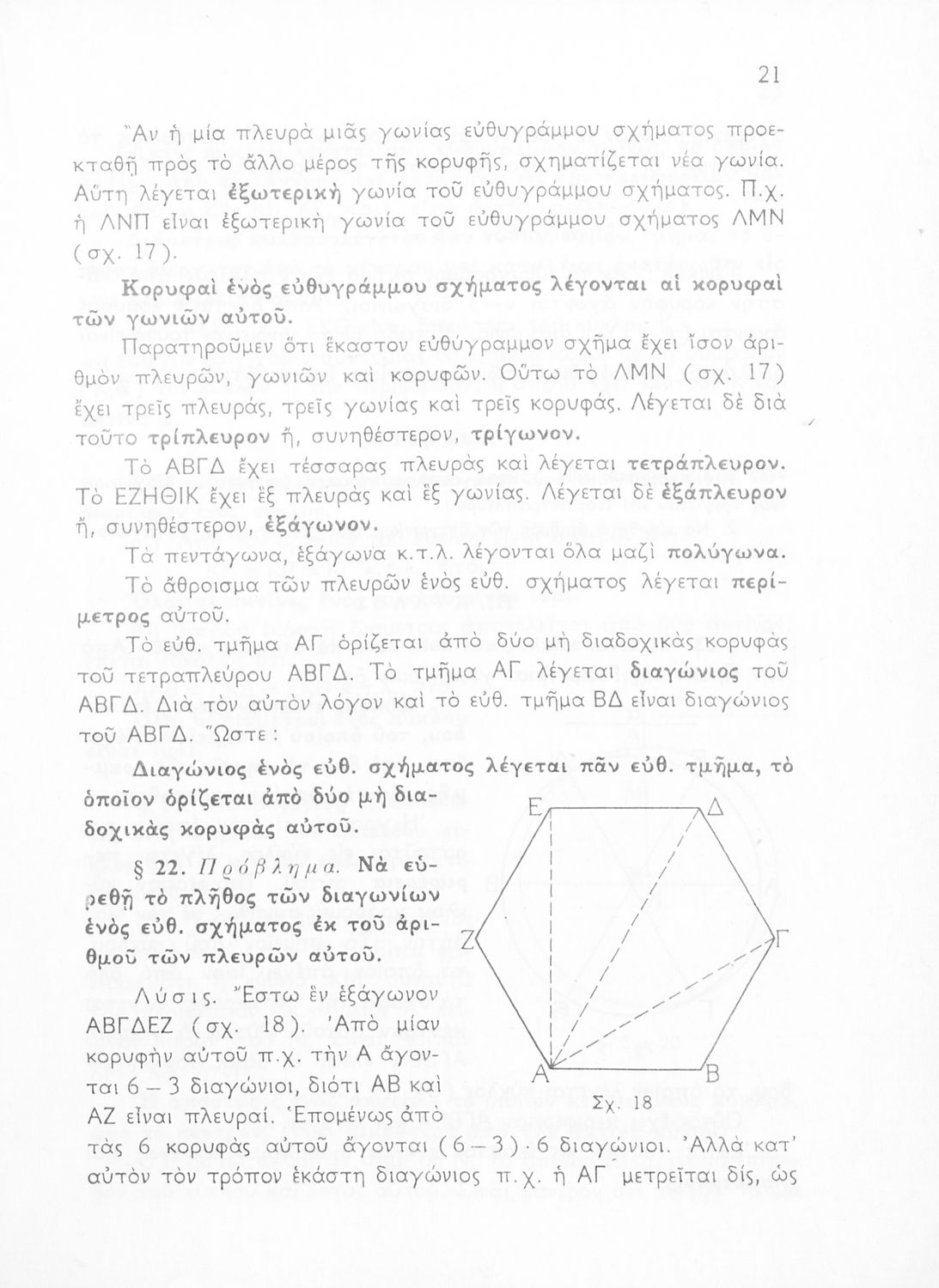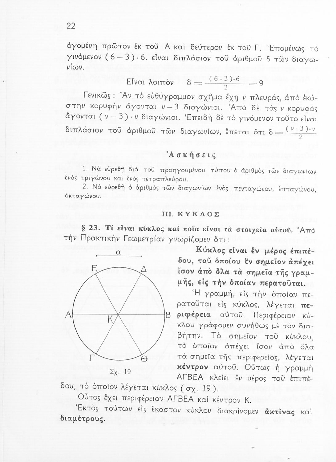Σχολικό εγχειρίδιο Γεωμετρίας για τις Γ΄, Δ΄, Ε΄, ΣΤ΄ Γυμνασίου που περιλαμβάνει θεωρία και ασκήσεις και είναι χωρισμένο σε Επιπεδομετρία και Στερεομετρία.