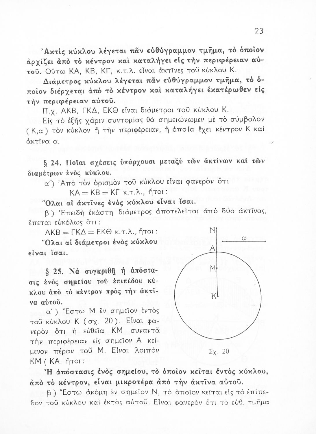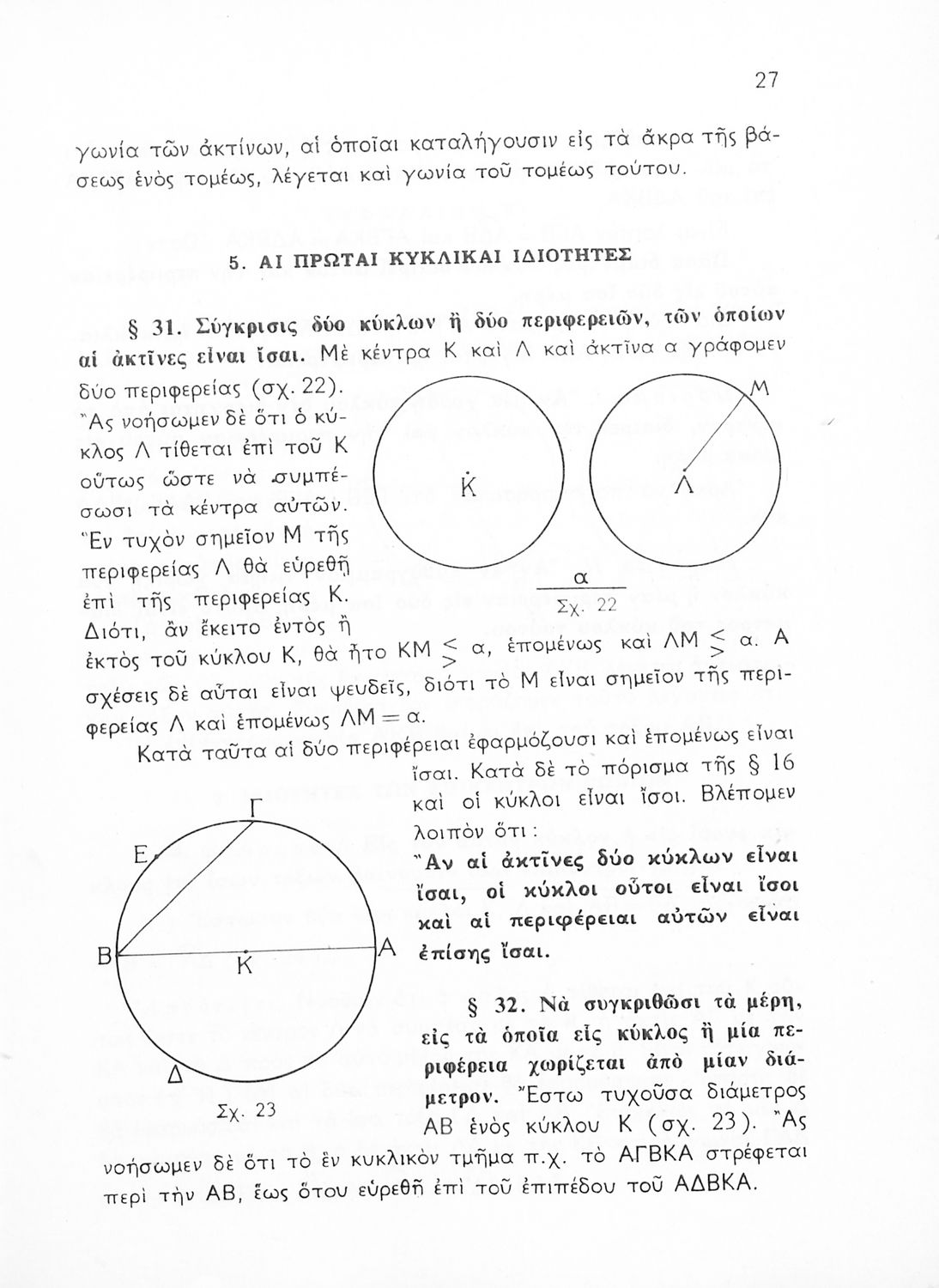 Σχολικό εγχειρίδιο Γεωμετρίας για τις Γ΄, Δ΄, Ε΄, ΣΤ΄ Γυμνασίου που περιλαμβάνει θεωρία και ασκήσεις και είναι χωρισμένο σε Επιπεδομετρία και Στερεομετρία. Φέρει το σύμβολο της δικτατορίας.