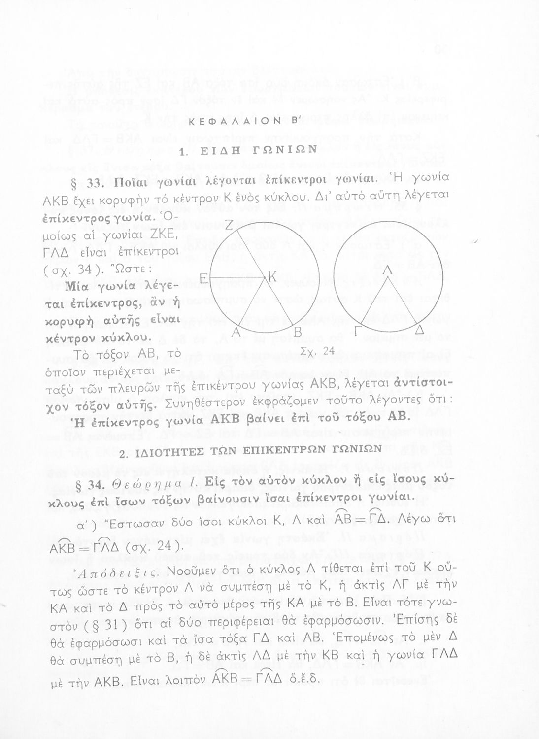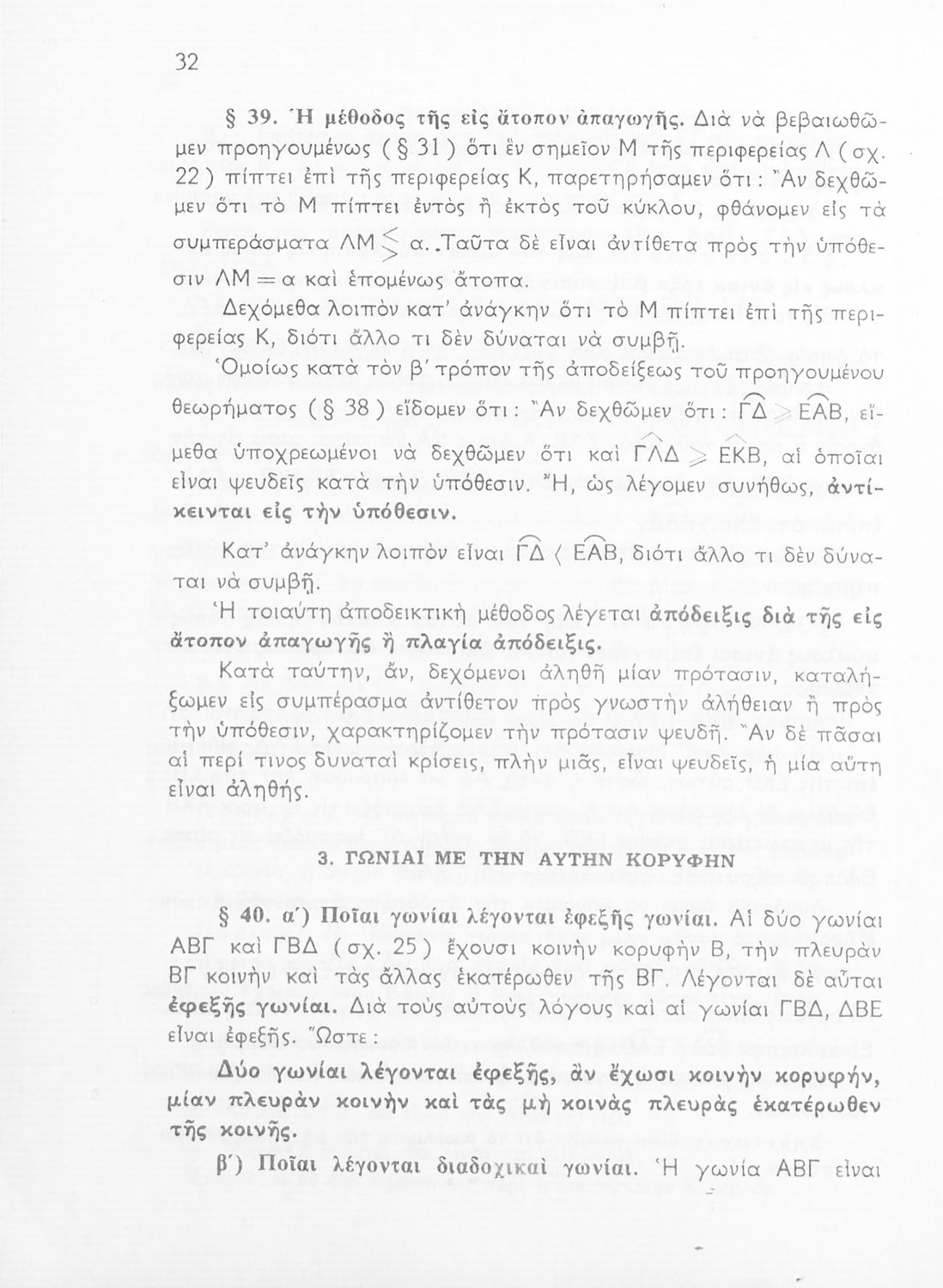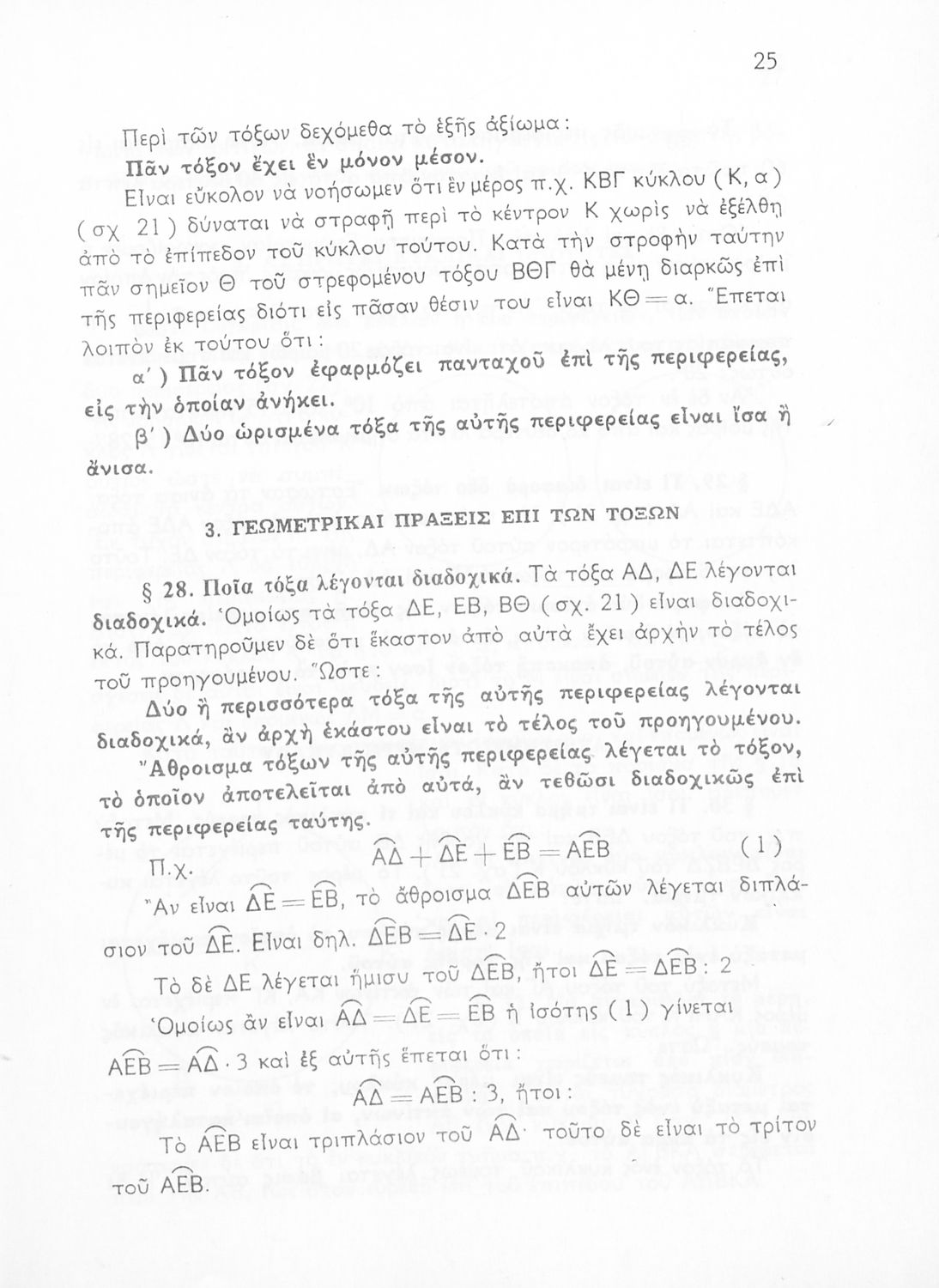Σχολικό εγχειρίδιο Γεωμετρίας για τις Γ΄, Δ΄, Ε΄, ΣΤ΄ Γυμνασίου που εστιάζει στα βασικά θεωρήματα και ιδιότητες των γεωμετρικών σχημάτων. Φέρει το σύμβολο της δικτατορίας.