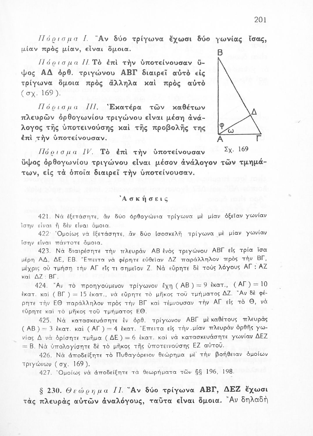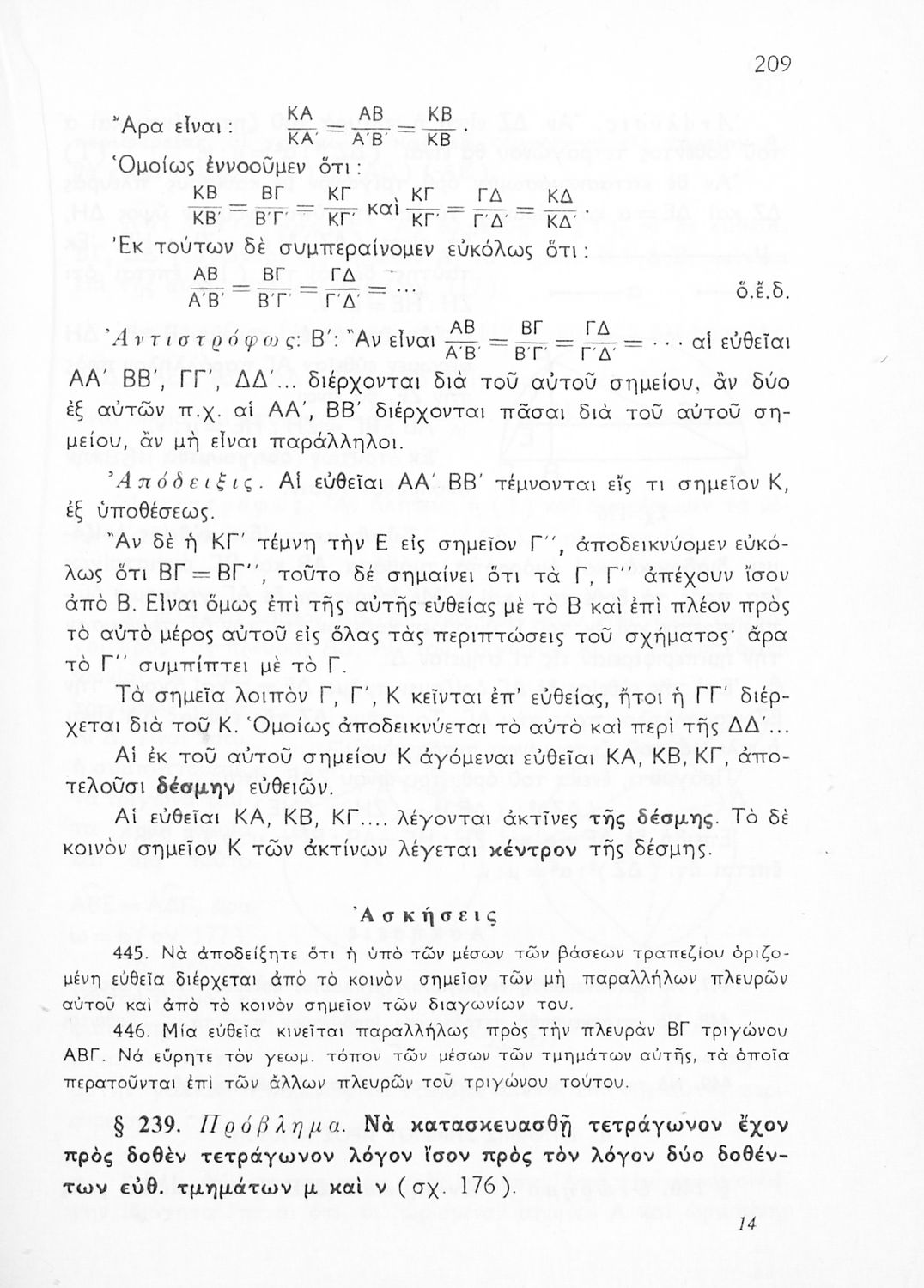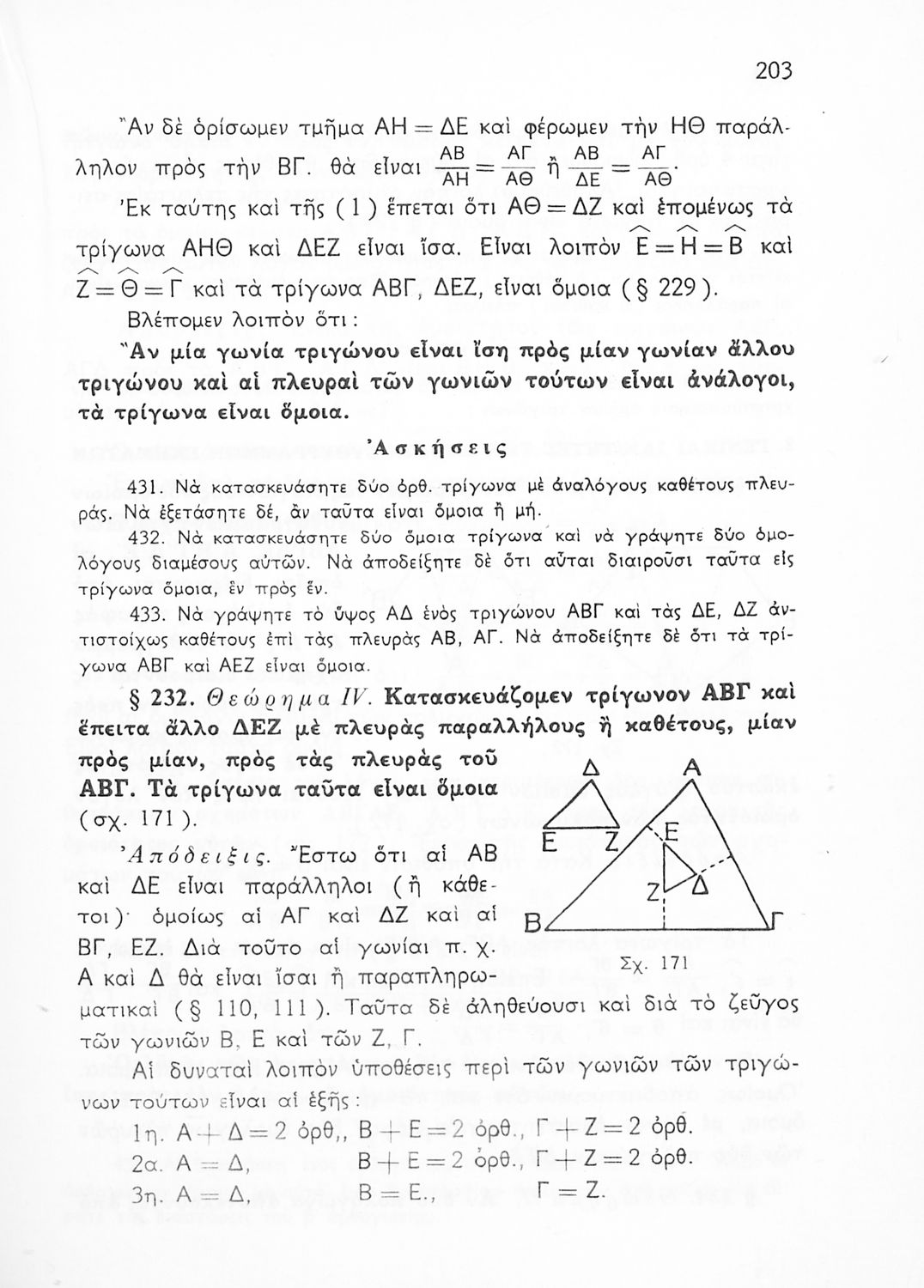 Σχολικό εγχειρίδιο Γεωμετρίας για τις Γ΄, Δ΄, Ε΄, ΣΤ΄ Γυμνασίου που εστιάζει στα βασικά θεωρήματα και ιδιότητες των γεωμετρικών σχημάτων. Φέρει το σύμβολο της δικτατορίας.
