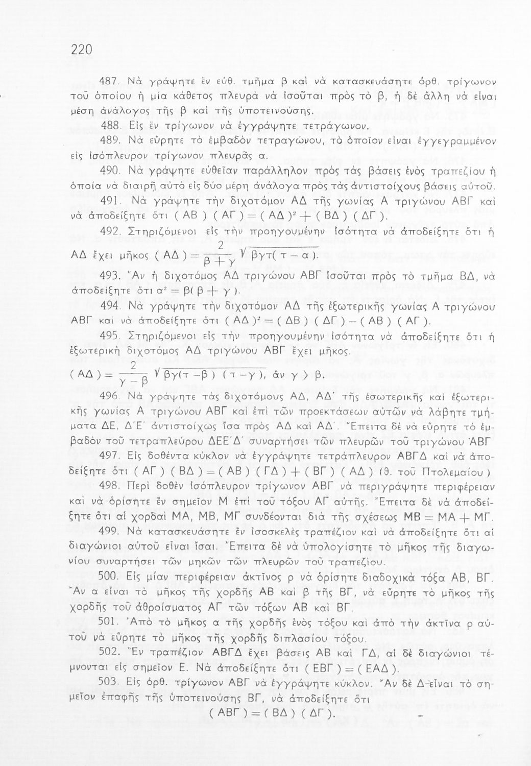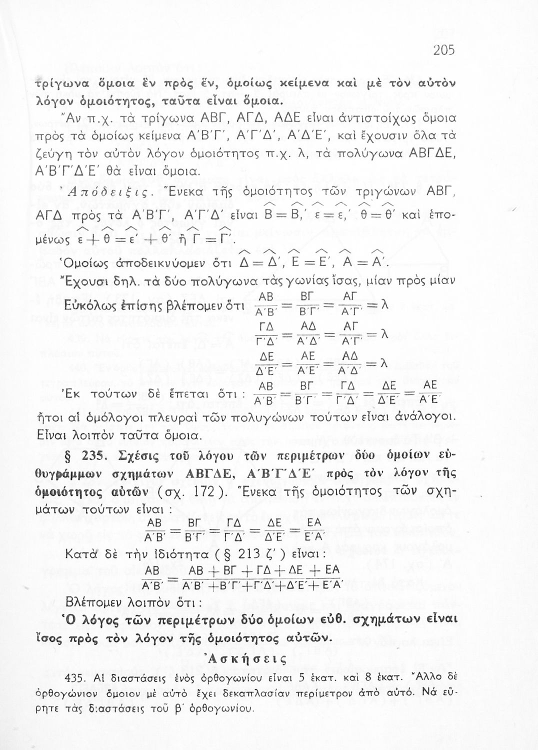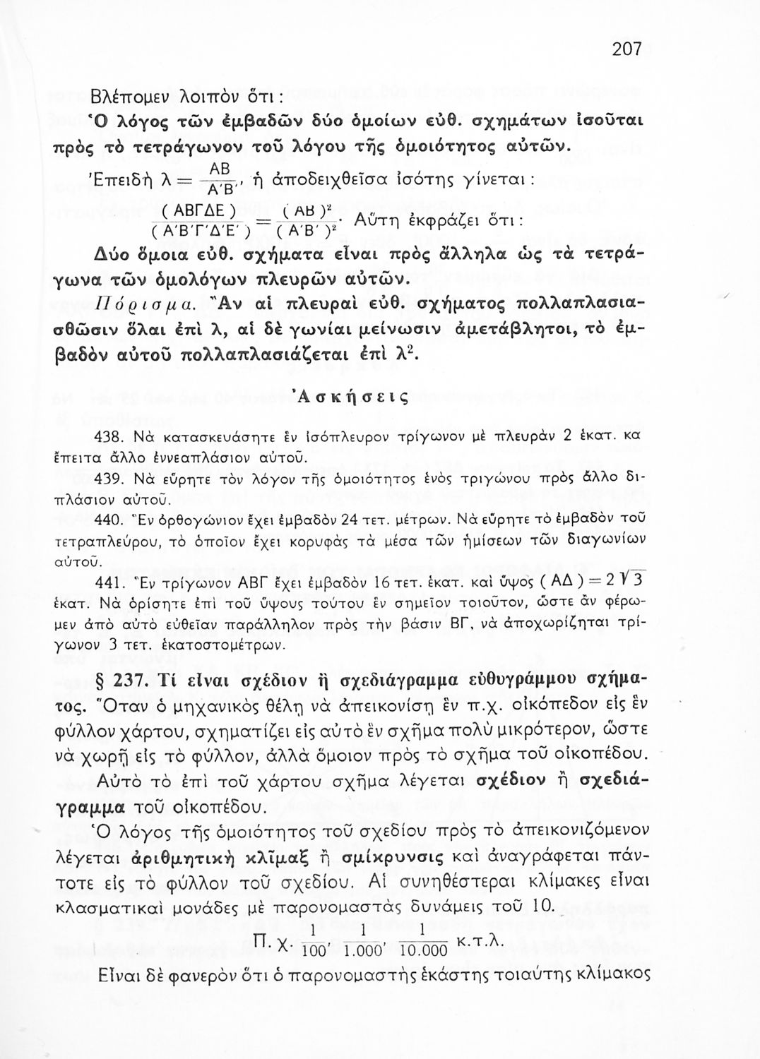 Σχολικό εγχειρίδιο Γεωμετρίας για τις Γ΄, Δ΄, Ε΄, ΣΤ΄ Γυμνασίου που περιλαμβάνει θεωρία και ασκήσεις και είναι χωρισμένο σε Επιπεδομετρία και Στερεομετρία.
