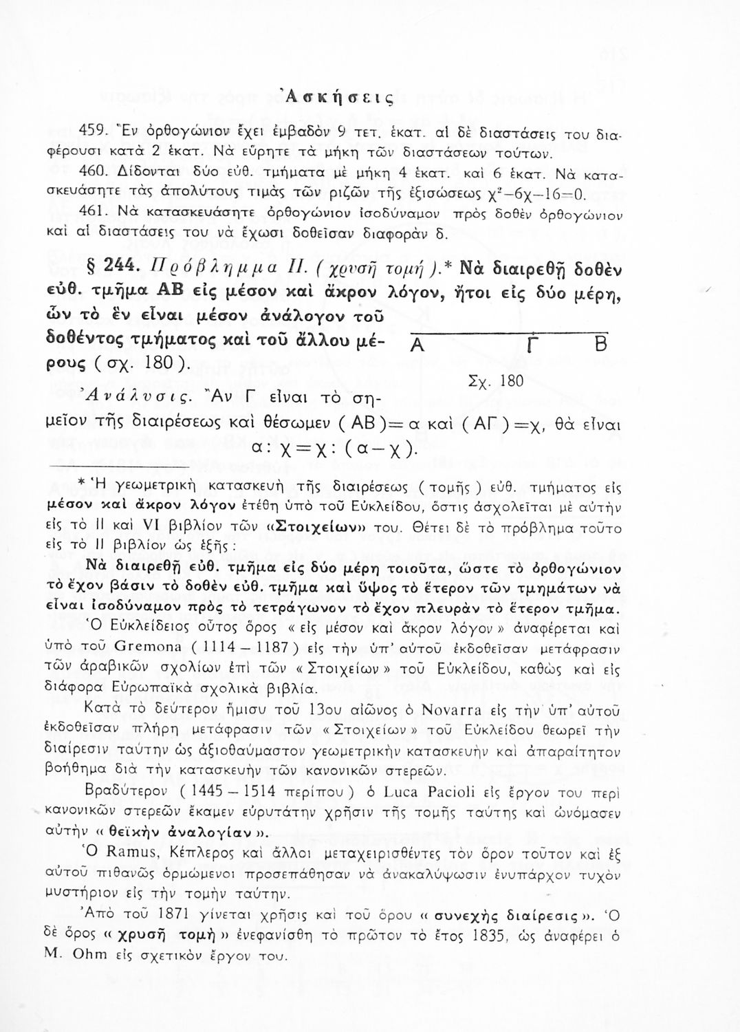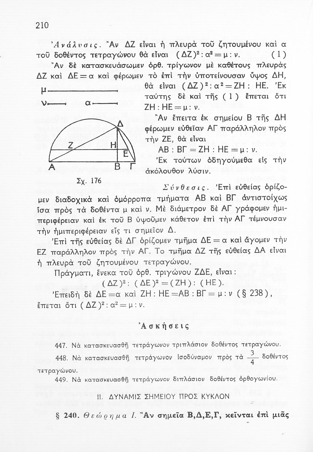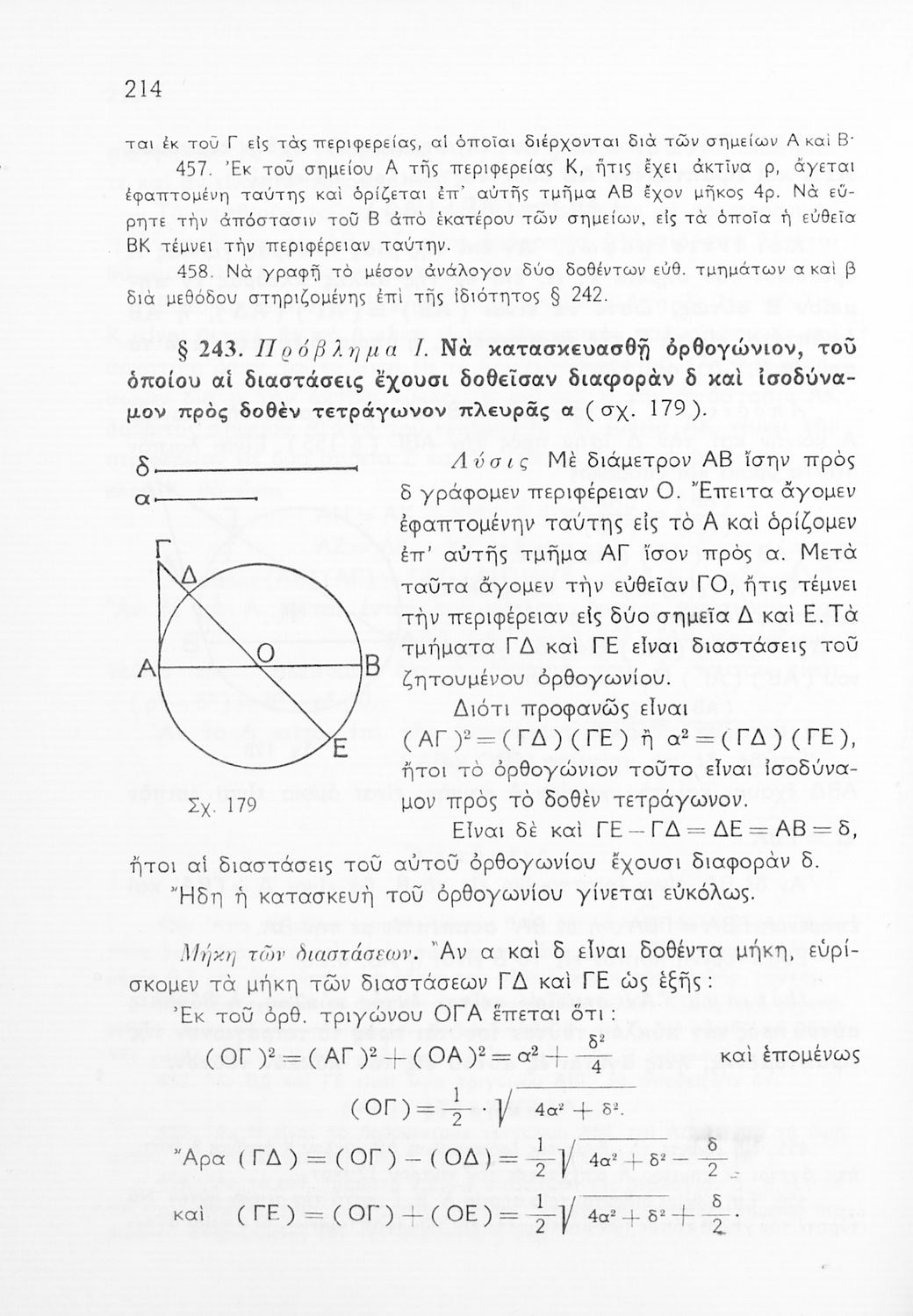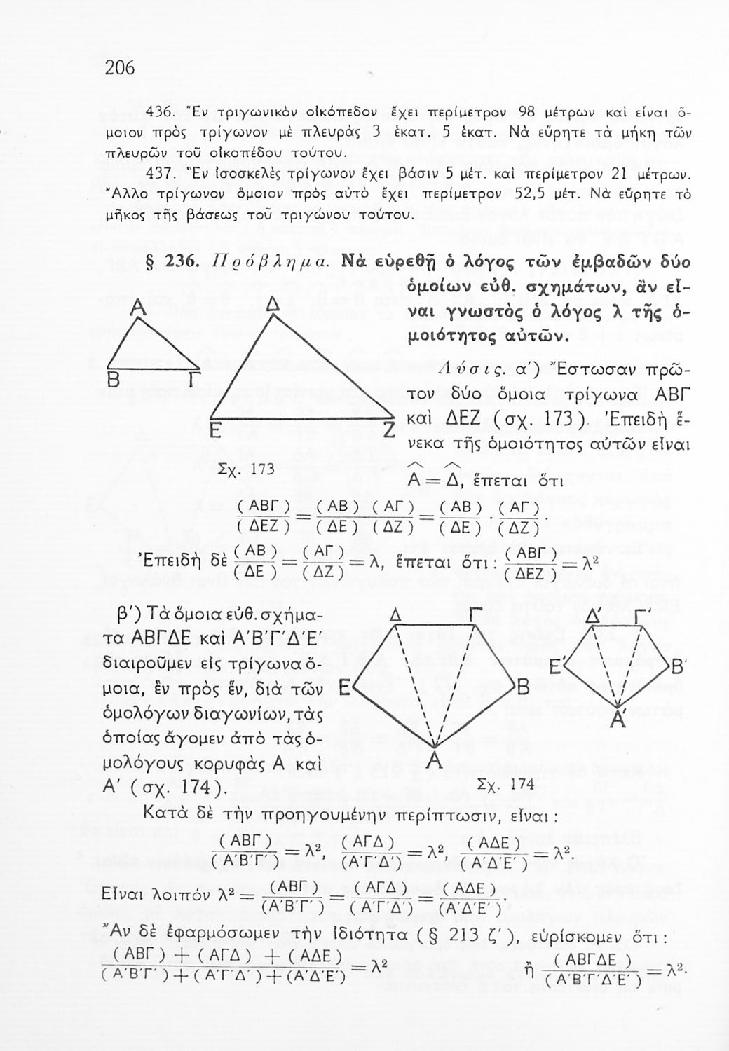 Σχολικό εγχειρίδιο Γεωμετρίας για τις Γ΄, Δ΄, Ε΄, ΣΤ΄ Γυμνασίου που περιλαμβάνει θεωρία και ασκήσεις και είναι χωρισμένο σε Επιπεδομετρία και Στερεομετρία. Φέρει το σύμβολο της δικτατορίας.