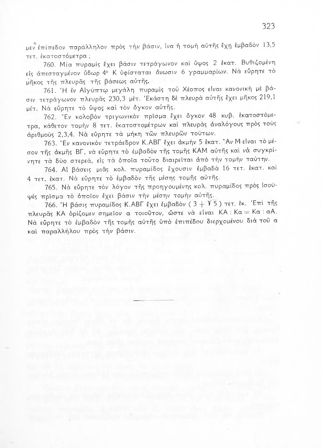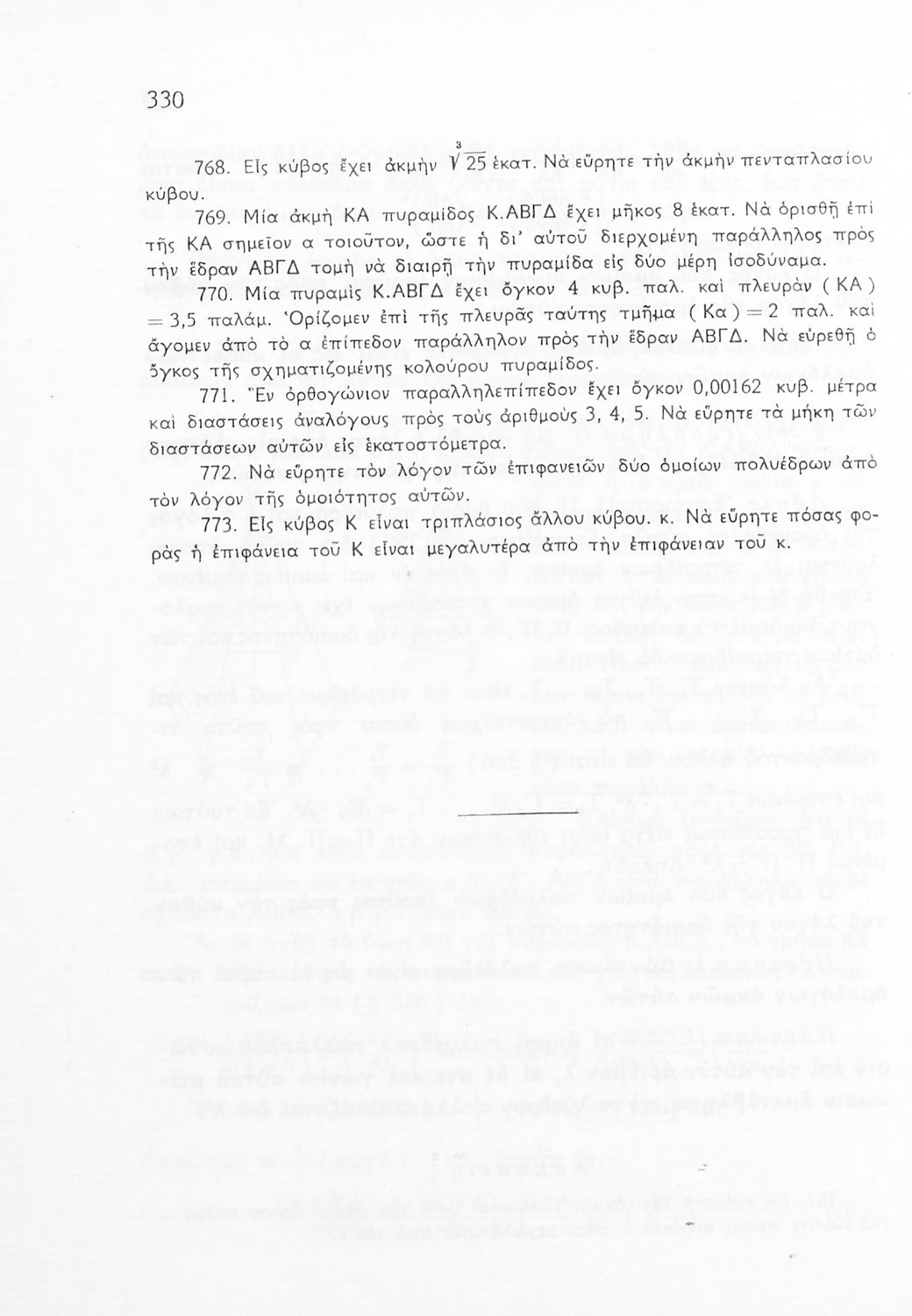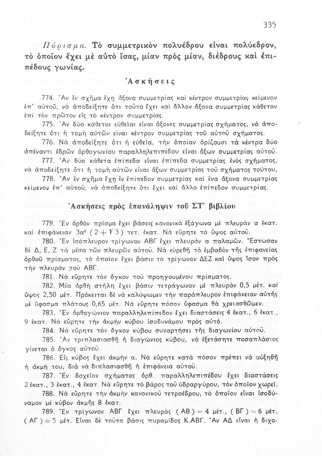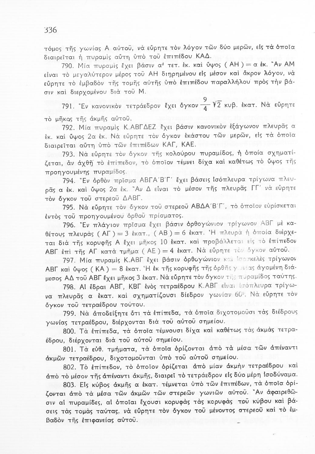 Σχολικό εγχειρίδιο Γεωμετρίας για τις Γ΄, Δ΄, Ε΄, ΣΤ΄ Γυμνασίου που περιλαμβάνει θεωρία και ασκήσεις και είναι χωρισμένο σε Επιπεδομετρία και Στερεομετρία. Φέρει το σύμβολο της δικτατορίας.