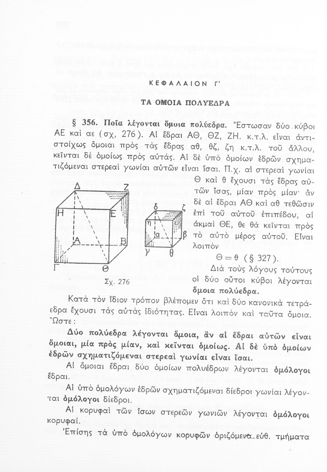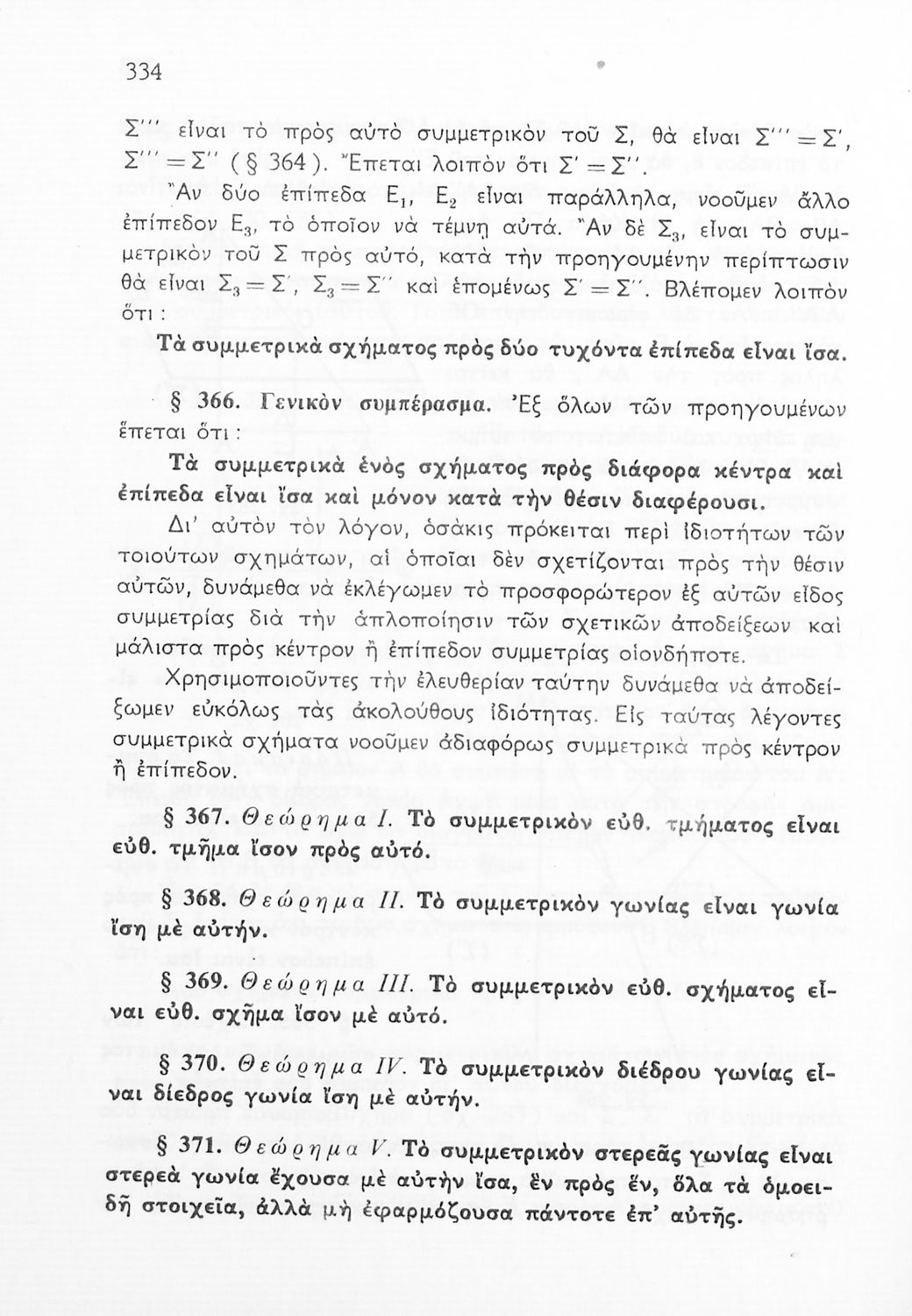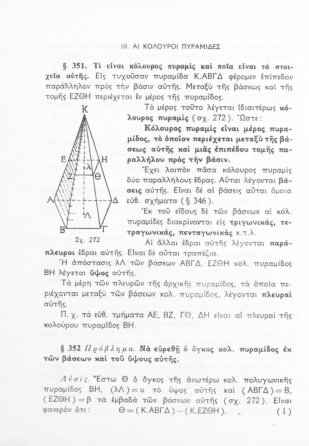 Σχολικό εγχειρίδιο Γεωμετρίας για τις Γ΄, Δ΄, Ε΄, ΣΤ΄ Γυμνασίου που περιλαμβάνει θεωρία και ασκήσεις και είναι χωρισμένο σε Επιπεδομετρία και Στερεομετρία. Φέρει το σύμβολο της δικτατορίας.