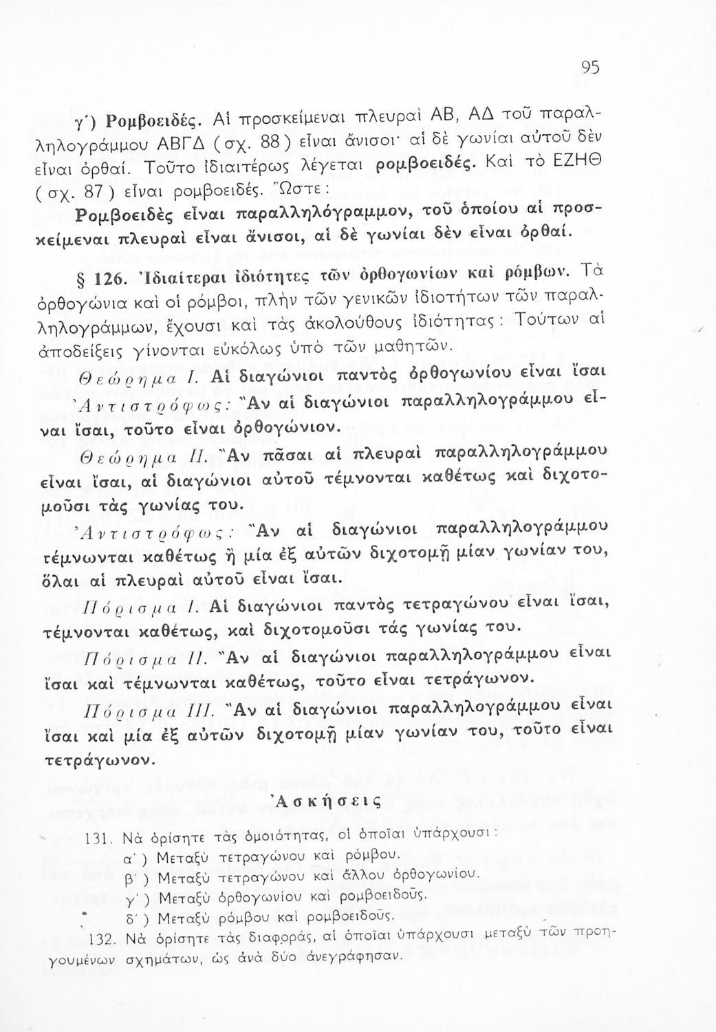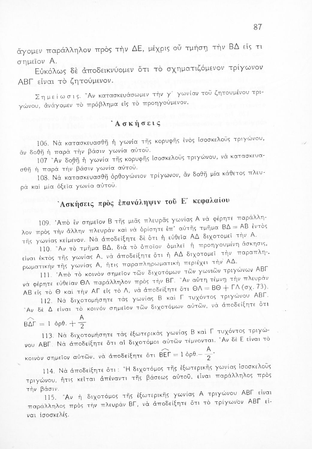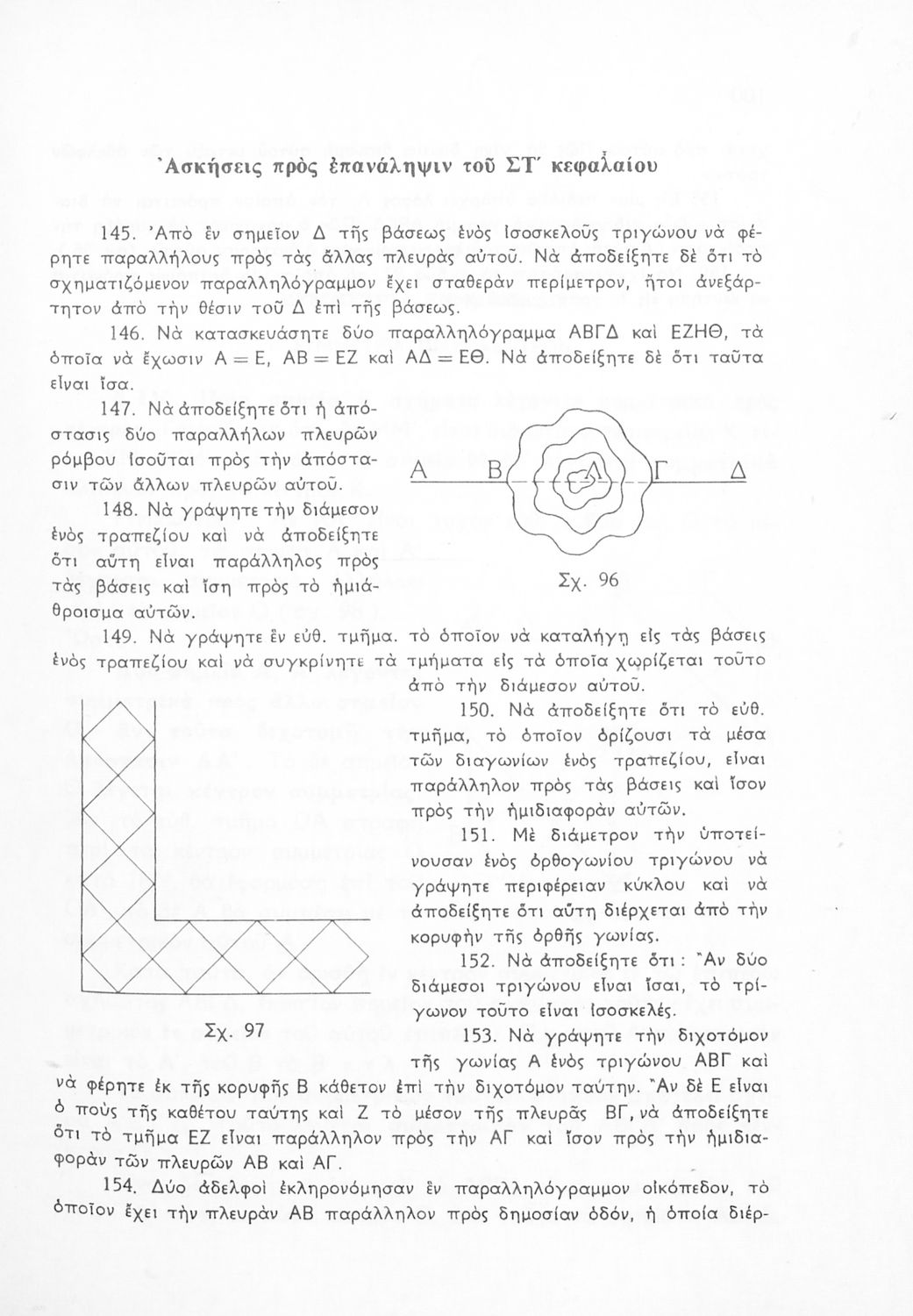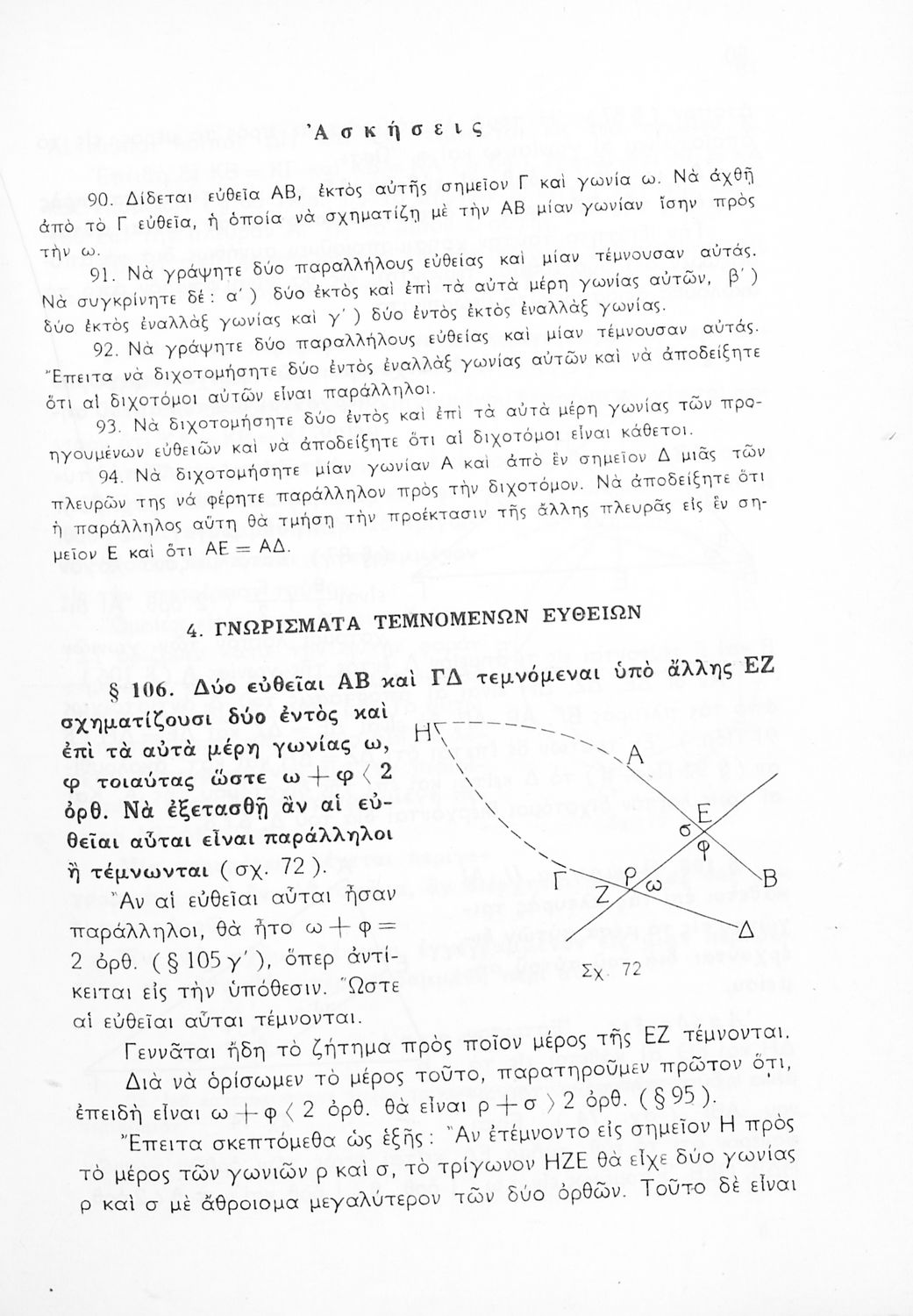 Σχολικό εγχειρίδιο Γεωμετρίας για τις Γ΄, Δ΄, Ε΄, ΣΤ΄ Γυμνασίου που εστιάζει στα βασικά θεωρήματα και ιδιότητες των γεωμετρικών σχημάτων. Φέρει το σύμβολο της δικτατορίας.