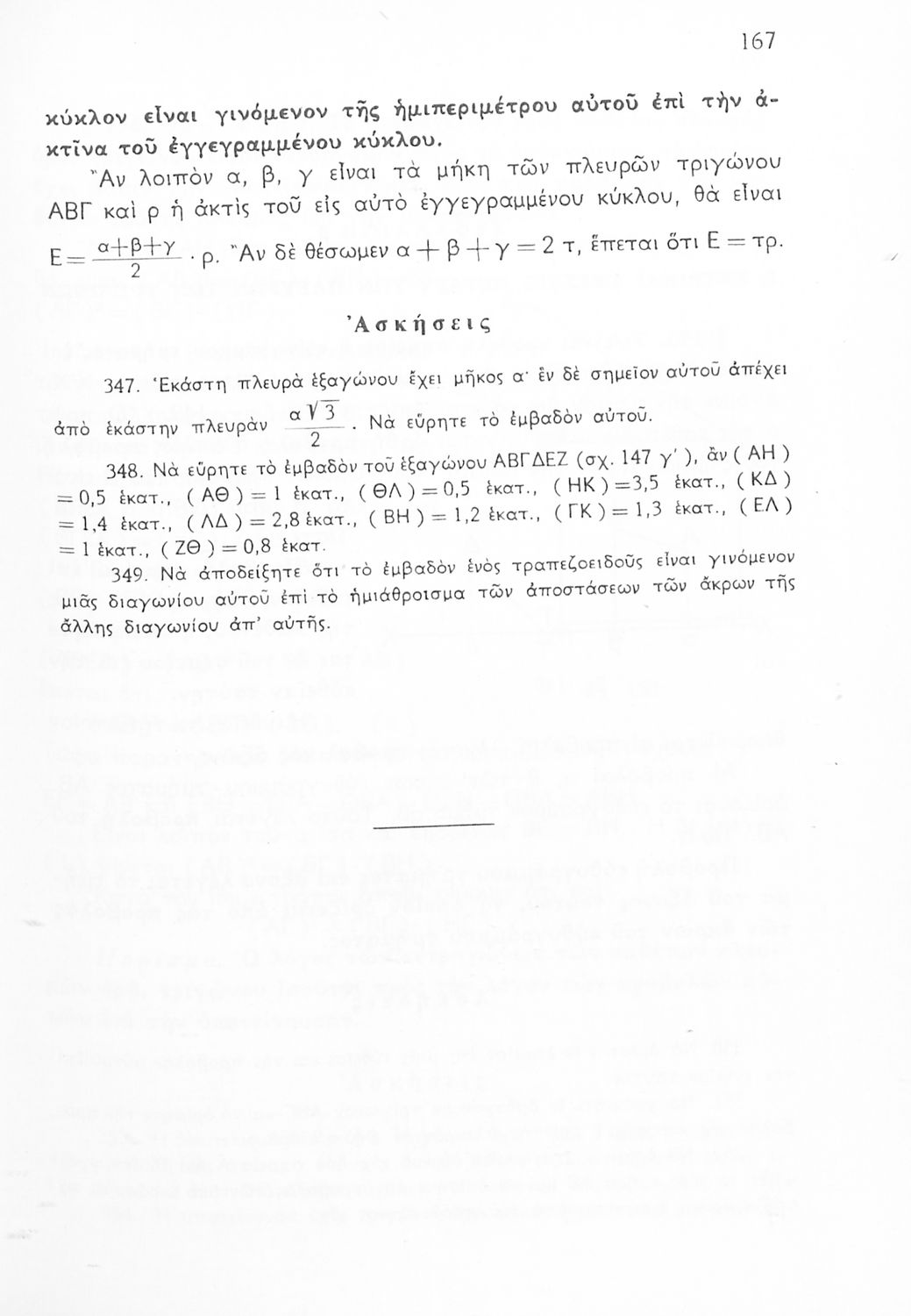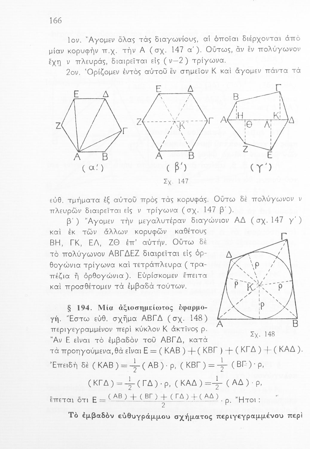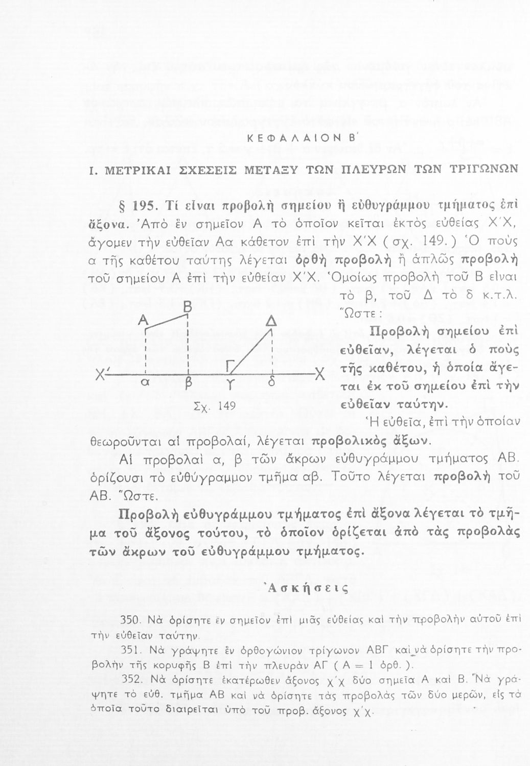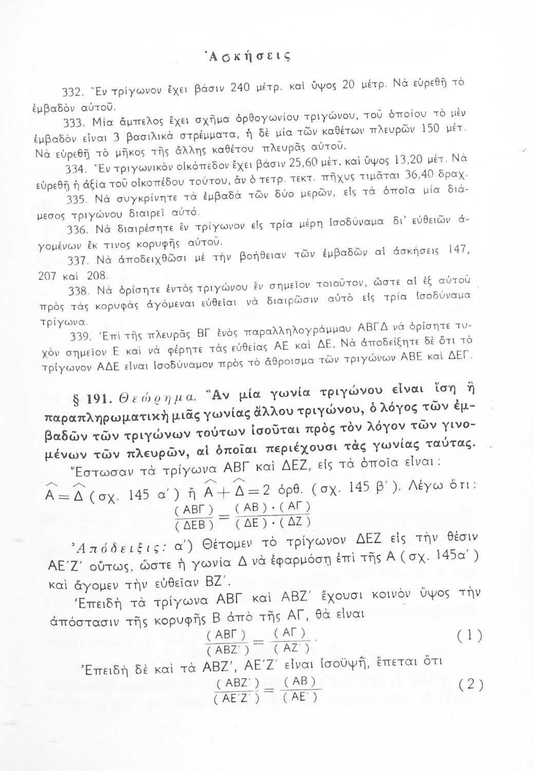 Σχολικό εγχειρίδιο Γεωμετρίας για τις Γ΄, Δ΄, Ε΄, ΣΤ΄ Γυμνασίου που περιλαμβάνει θεωρία και ασκήσεις και είναι χωρισμένο σε Επιπεδομετρία και Στερεομετρία. Φέρει το σύμβολο της δικτατορίας.