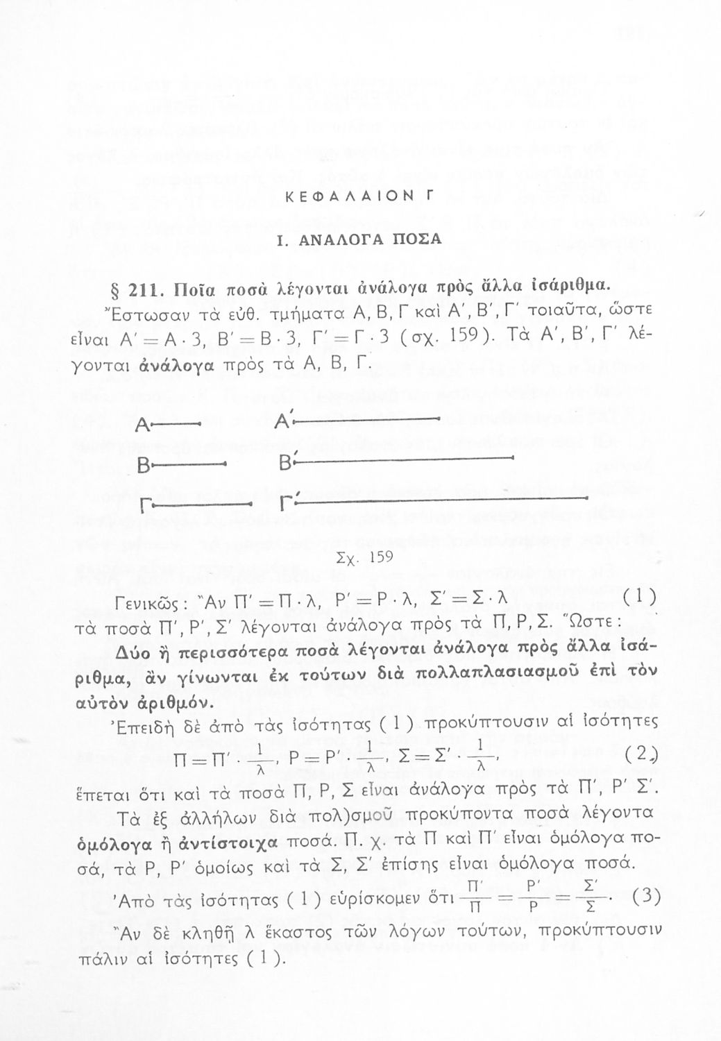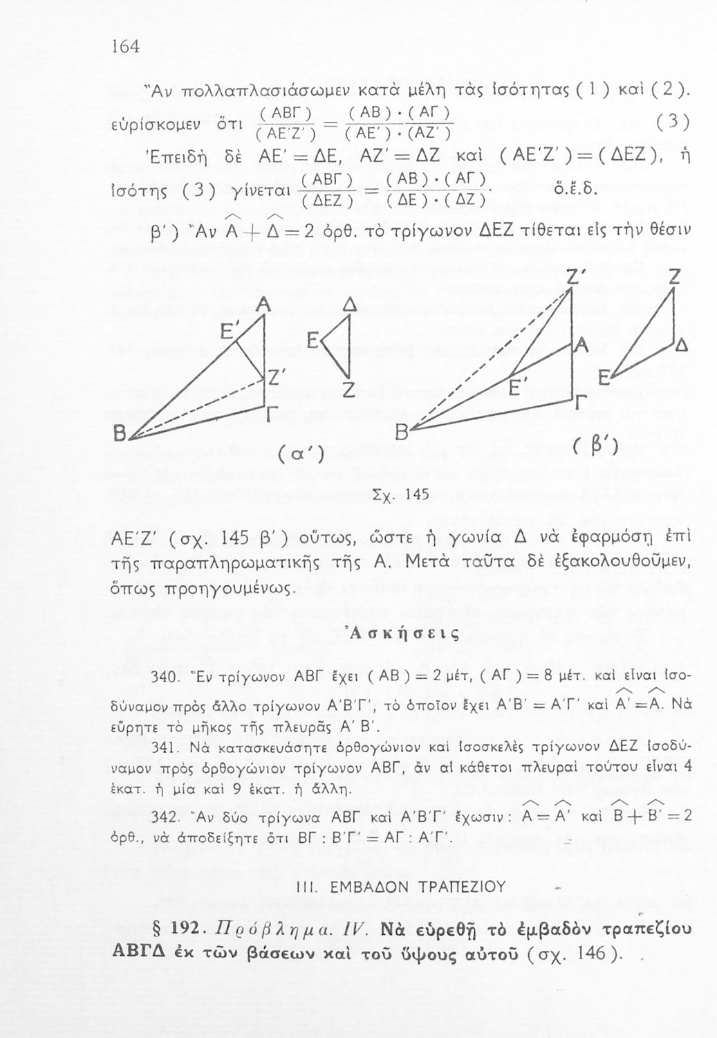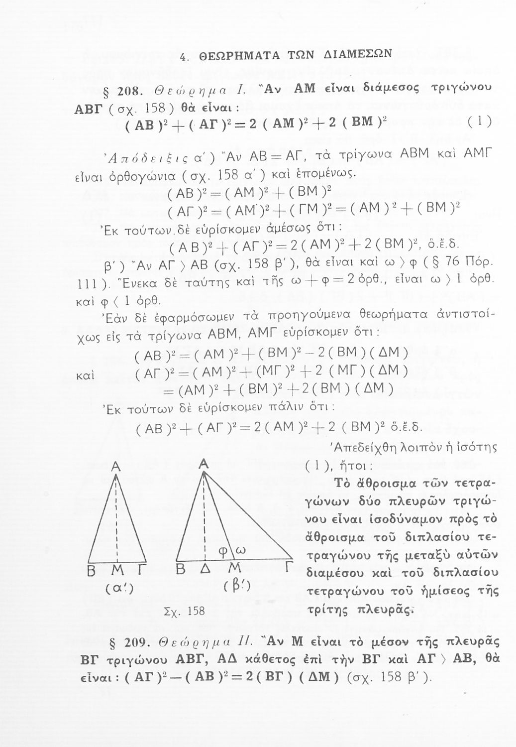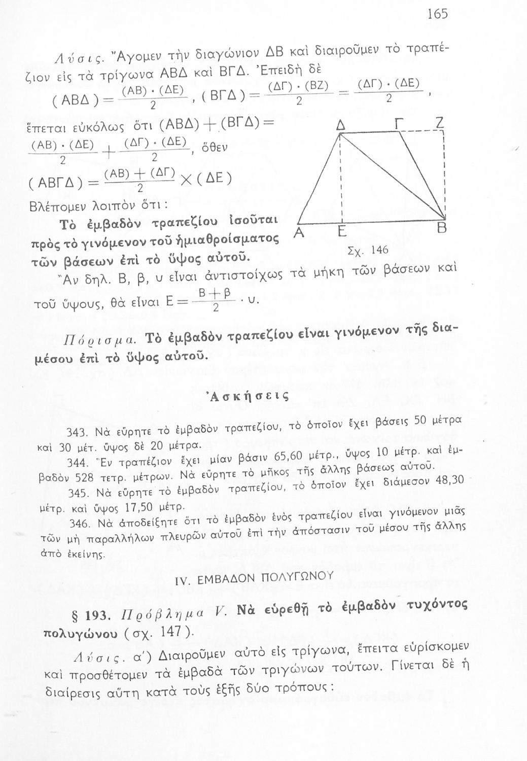 Σχολικό εγχειρίδιο Γεωμετρίας για τις Γ΄, Δ΄, Ε΄, ΣΤ΄ Γυμνασίου που περιλαμβάνει θεωρία και ασκήσεις και είναι χωρισμένο σε Επιπεδομετρία και Στερεομετρία. Φέρει το σύμβολο της δικτατορίας.