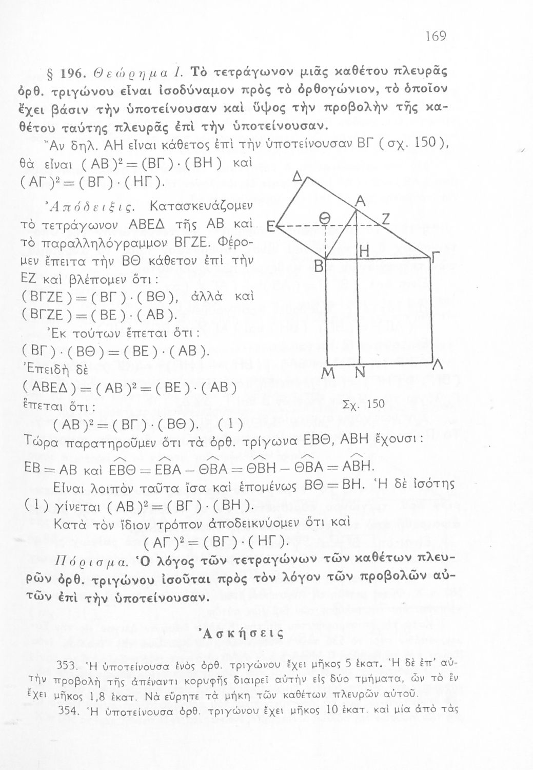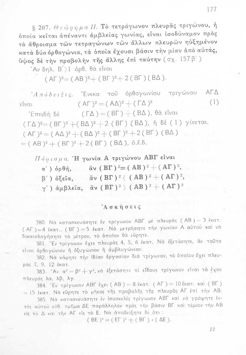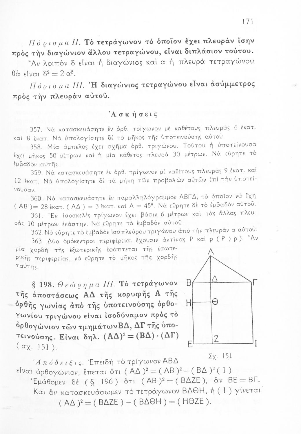 Σχολικό εγχειρίδιο Γεωμετρίας για τις Γ΄, Δ΄, Ε΄, ΣΤ΄ Γυμνασίου που εστιάζει στα βασικά θεωρήματα και ιδιότητες των γεωμετρικών σχημάτων. Φέρει το σύμβολο της δικτατορίας.
