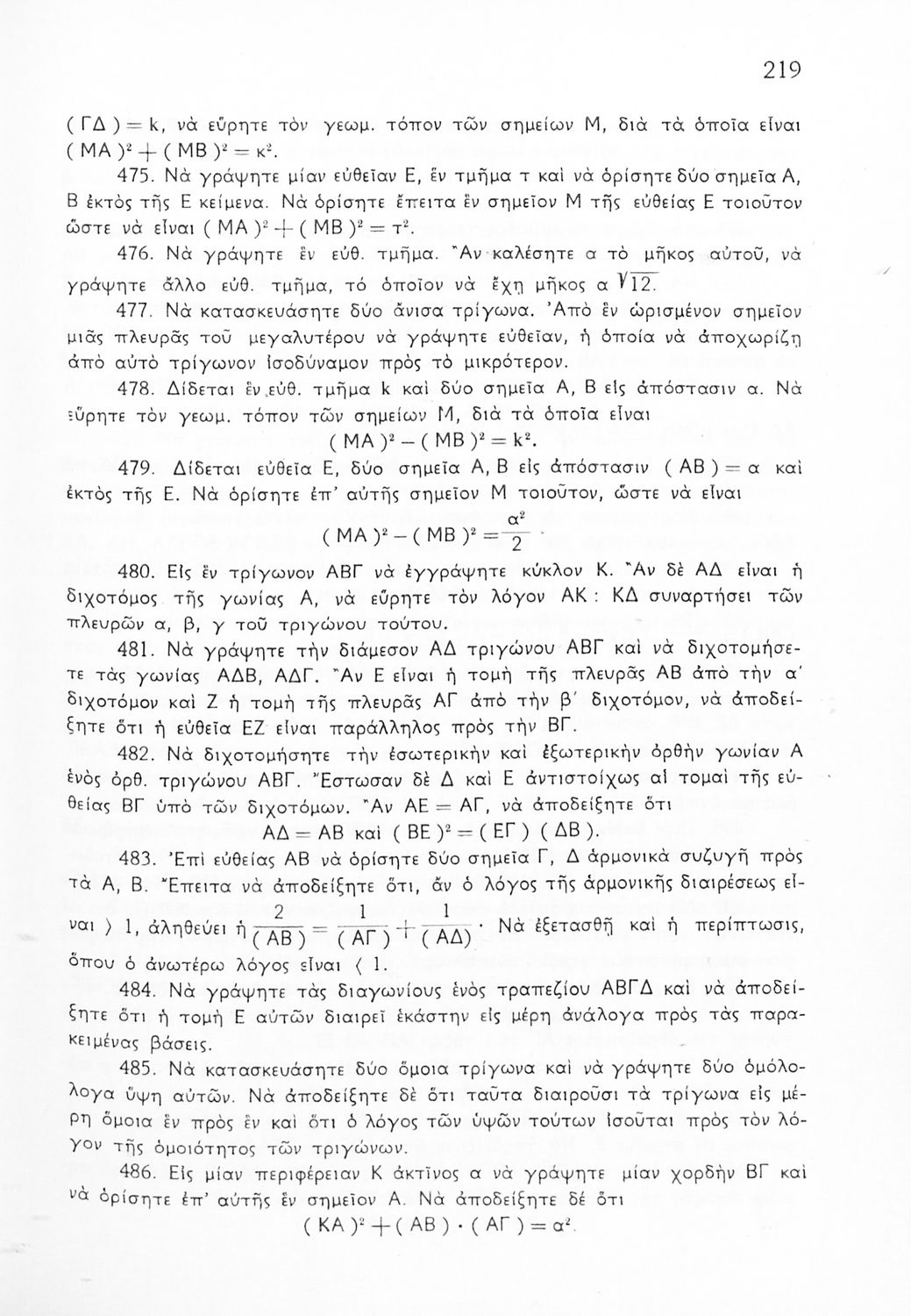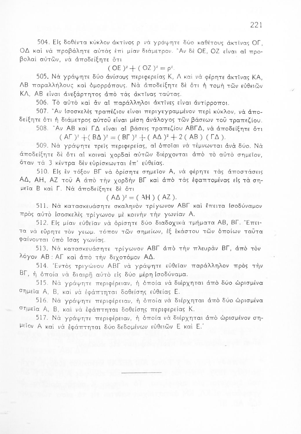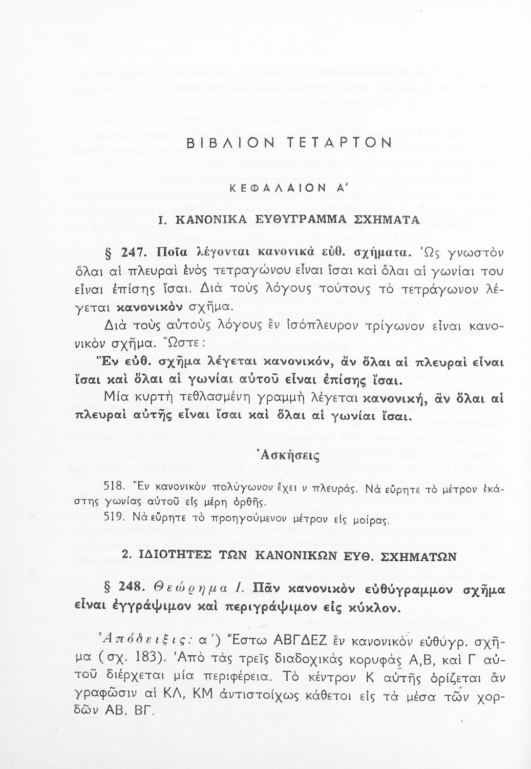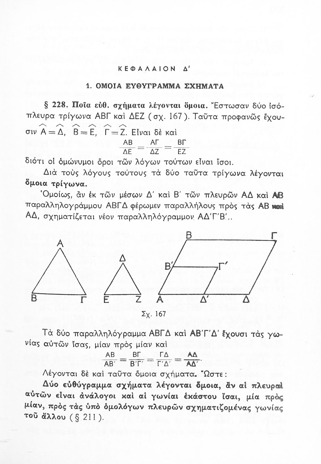 Σχολικό εγχειρίδιο Γεωμετρίας για τις Γ΄, Δ΄, Ε΄, ΣΤ΄ Γυμνασίου που εστιάζει στα βασικά θεωρήματα και ιδιότητες των γεωμετρικών σχημάτων. Φέρει το σύμβολο της δικτατορίας.