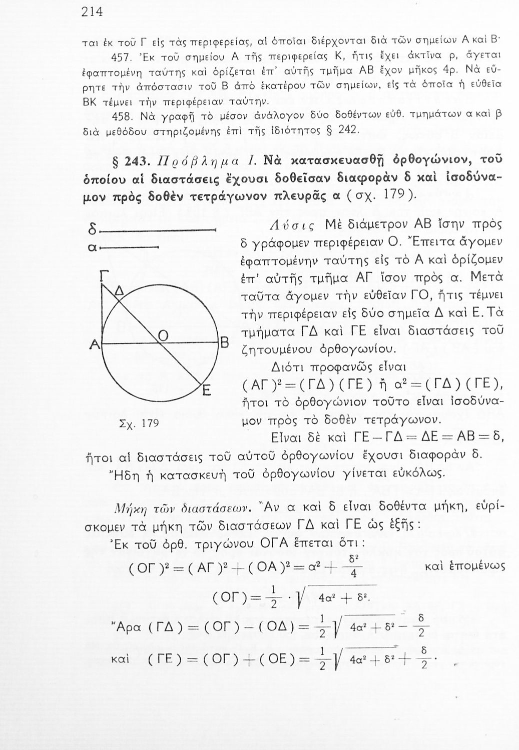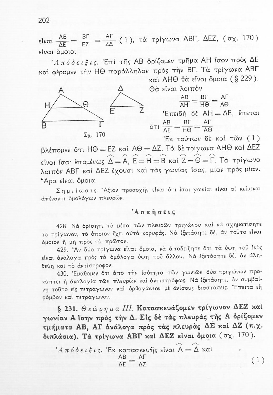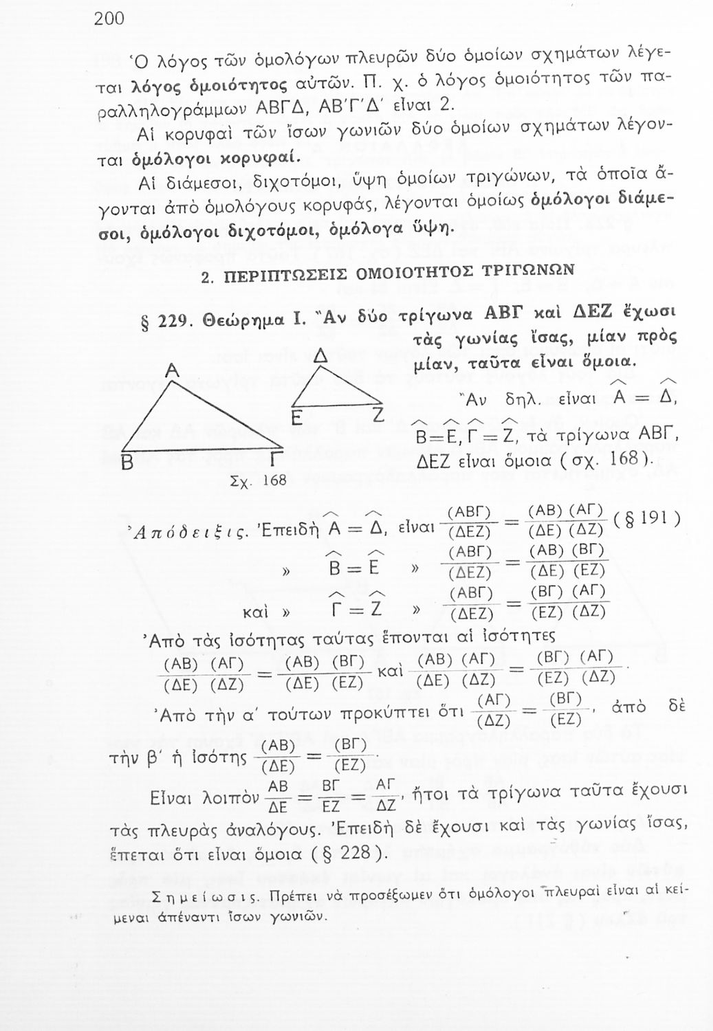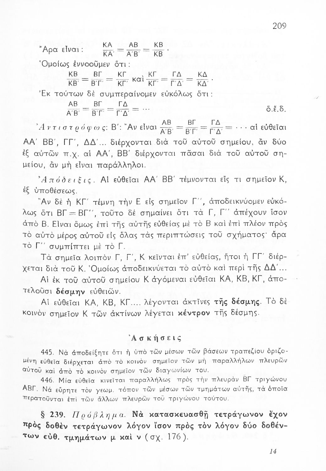 Σχολικό εγχειρίδιο Γεωμετρίας για τις Γ΄, Δ΄, Ε΄, ΣΤ΄ Γυμνασίου που εστιάζει στα βασικά θεωρήματα και ιδιότητες των γεωμετρικών σχημάτων. Φέρει το σύμβολο της δικτατορίας.