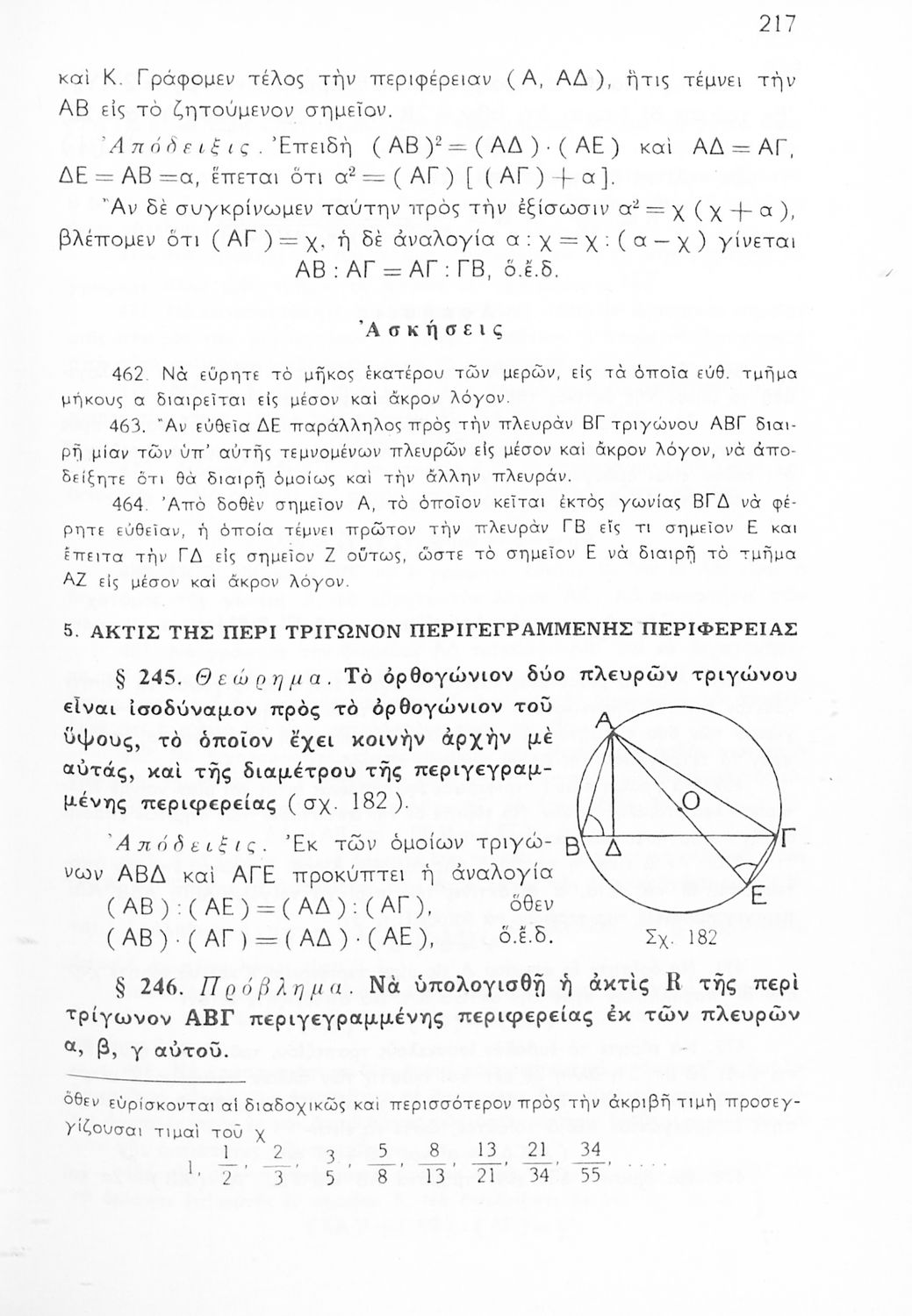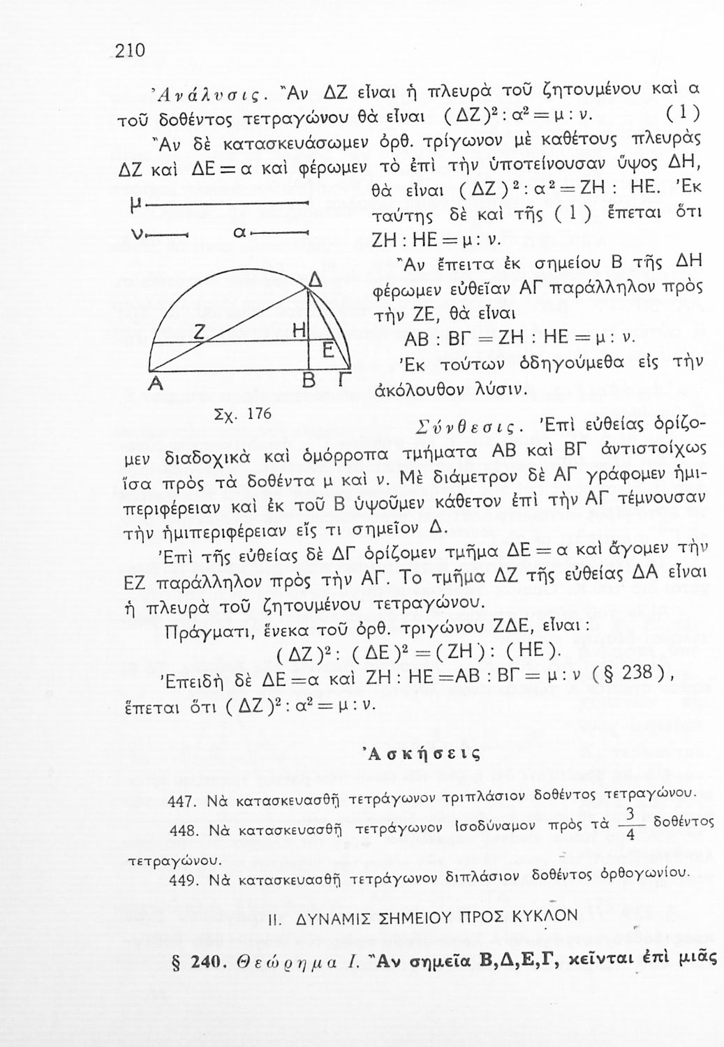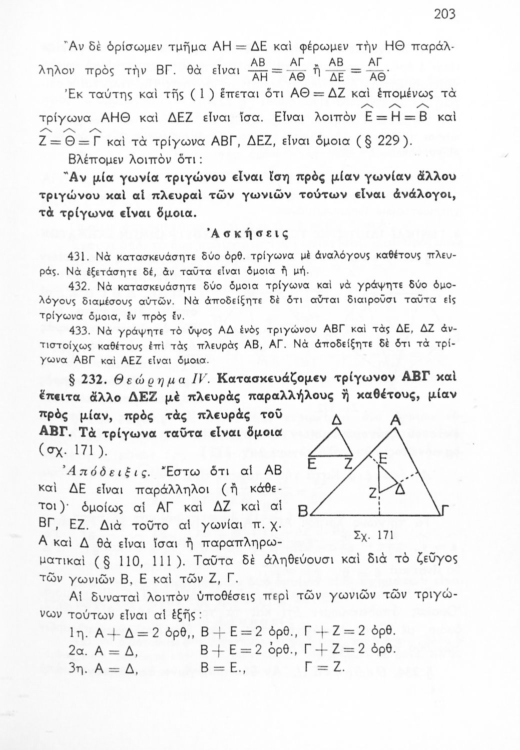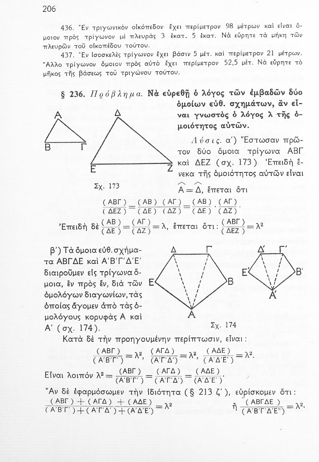 Σχολικό εγχειρίδιο Γεωμετρίας για τις Γ΄, Δ΄, Ε΄, ΣΤ΄ Γυμνασίου που εστιάζει στα βασικά θεωρήματα και ιδιότητες των γεωμετρικών σχημάτων. Φέρει το σύμβολο της δικτατορίας.