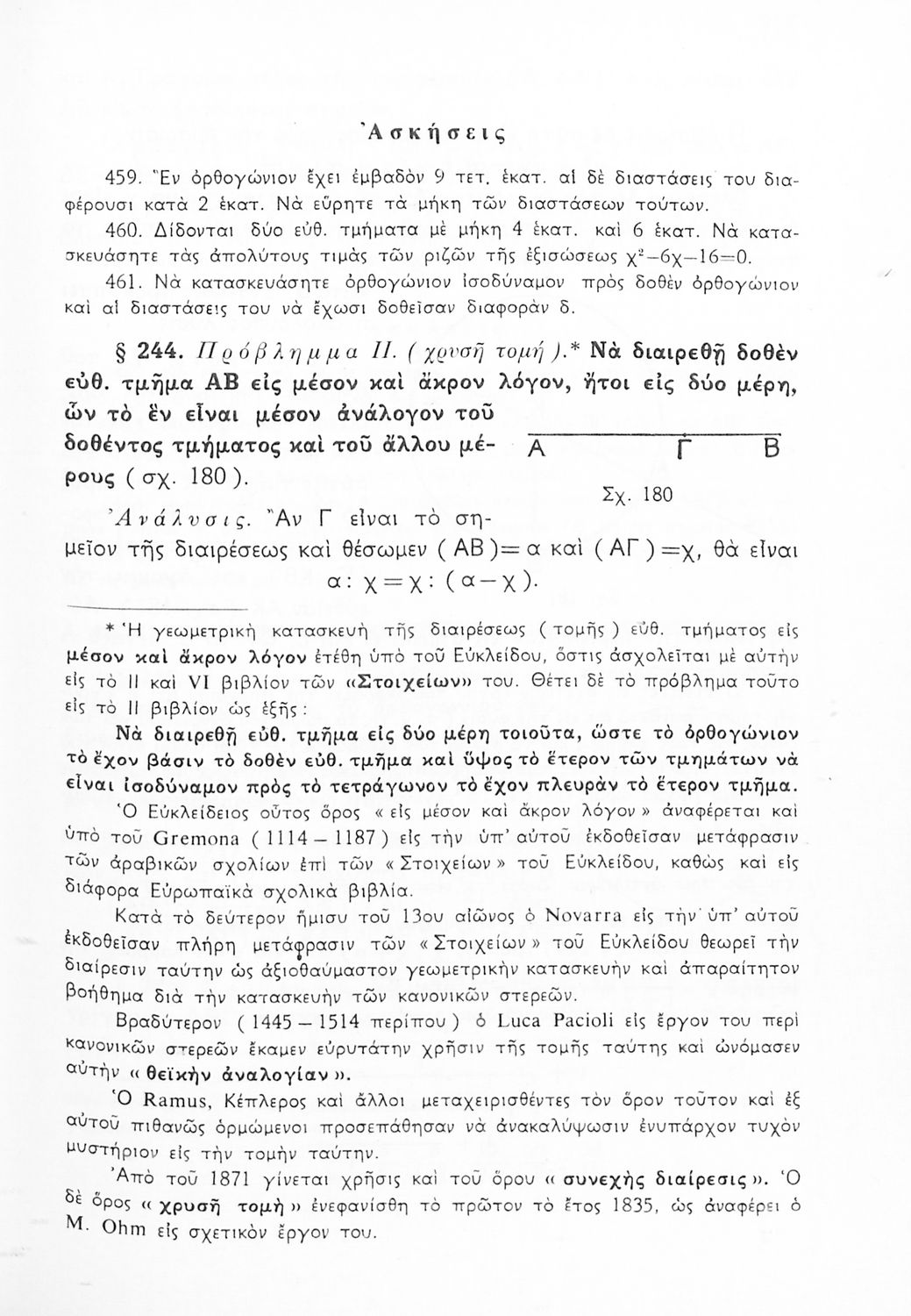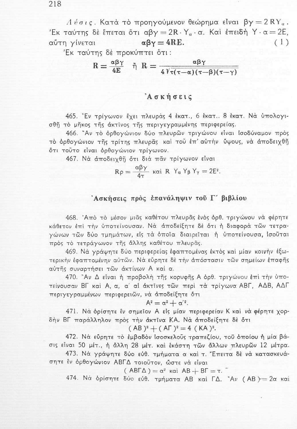 Σχολικό εγχειρίδιο Γεωμετρίας για τις Γ΄, Δ΄, Ε΄, ΣΤ΄ Γυμνασίου που περιλαμβάνει θεωρία και ασκήσεις και είναι χωρισμένο σε Επιπεδομετρία και Στερεομετρία. Φέρει το σύμβολο της δικτατορίας.