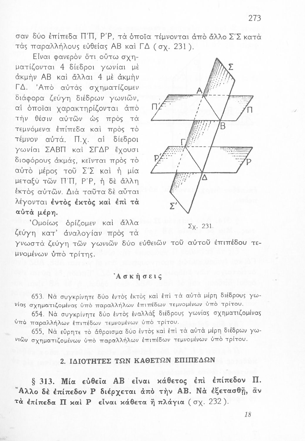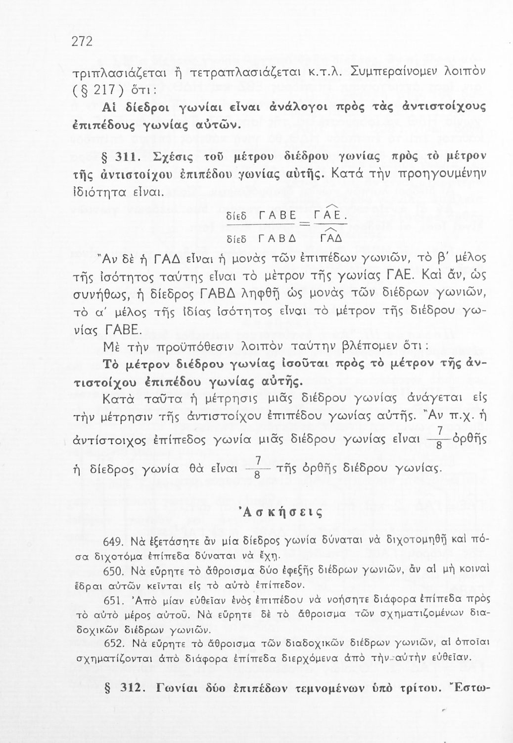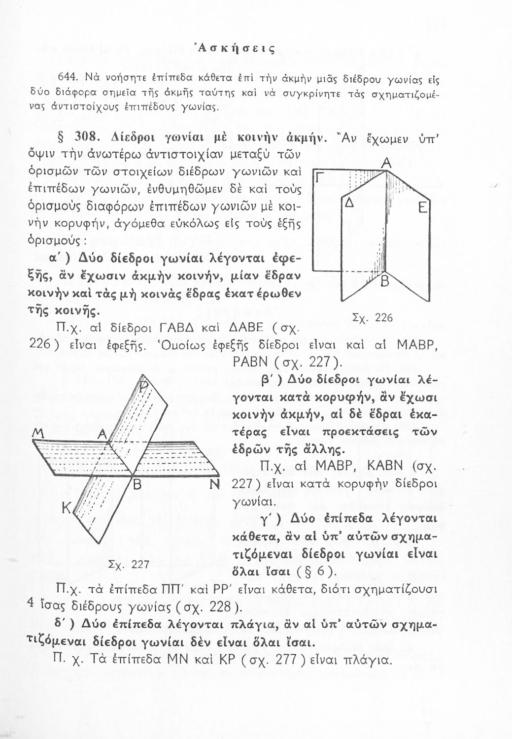 Σχολικό εγχειρίδιο Γεωμετρίας για τις Γ΄, Δ΄, Ε΄, ΣΤ΄ Γυμνασίου που περιλαμβάνει θεωρία και ασκήσεις και είναι χωρισμένο σε Επιπεδομετρία και Στερεομετρία.