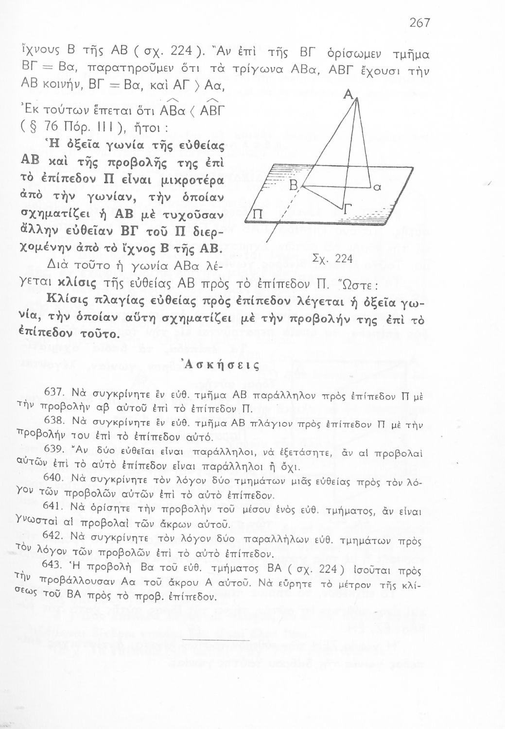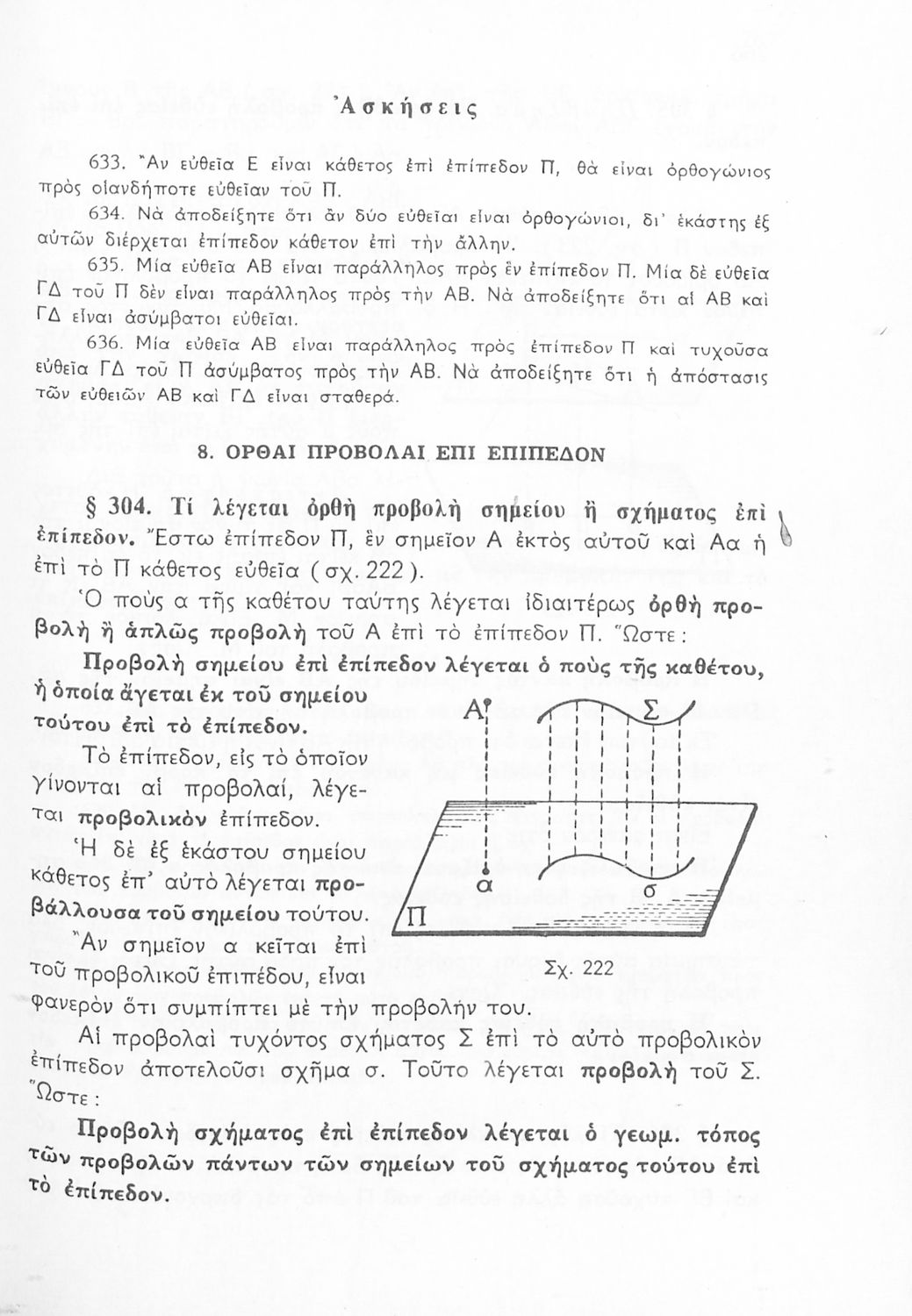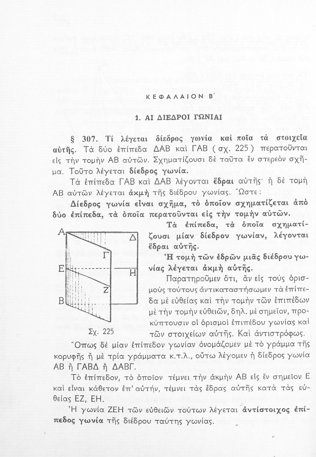 Σχολικό εγχειρίδιο Γεωμετρίας για τις Γ΄, Δ΄, Ε΄, ΣΤ΄ Γυμνασίου που περιλαμβάνει θεωρία και ασκήσεις και είναι χωρισμένο σε Επιπεδομετρία και Στερεομετρία. Φέρει το σύμβολο της δικτατορίας.