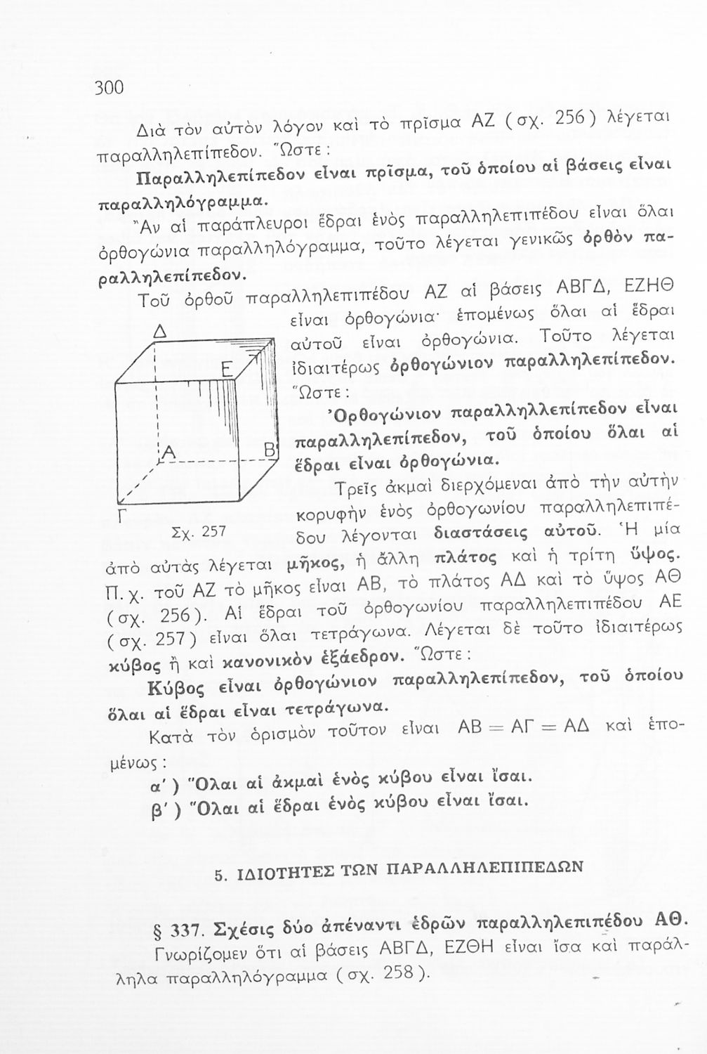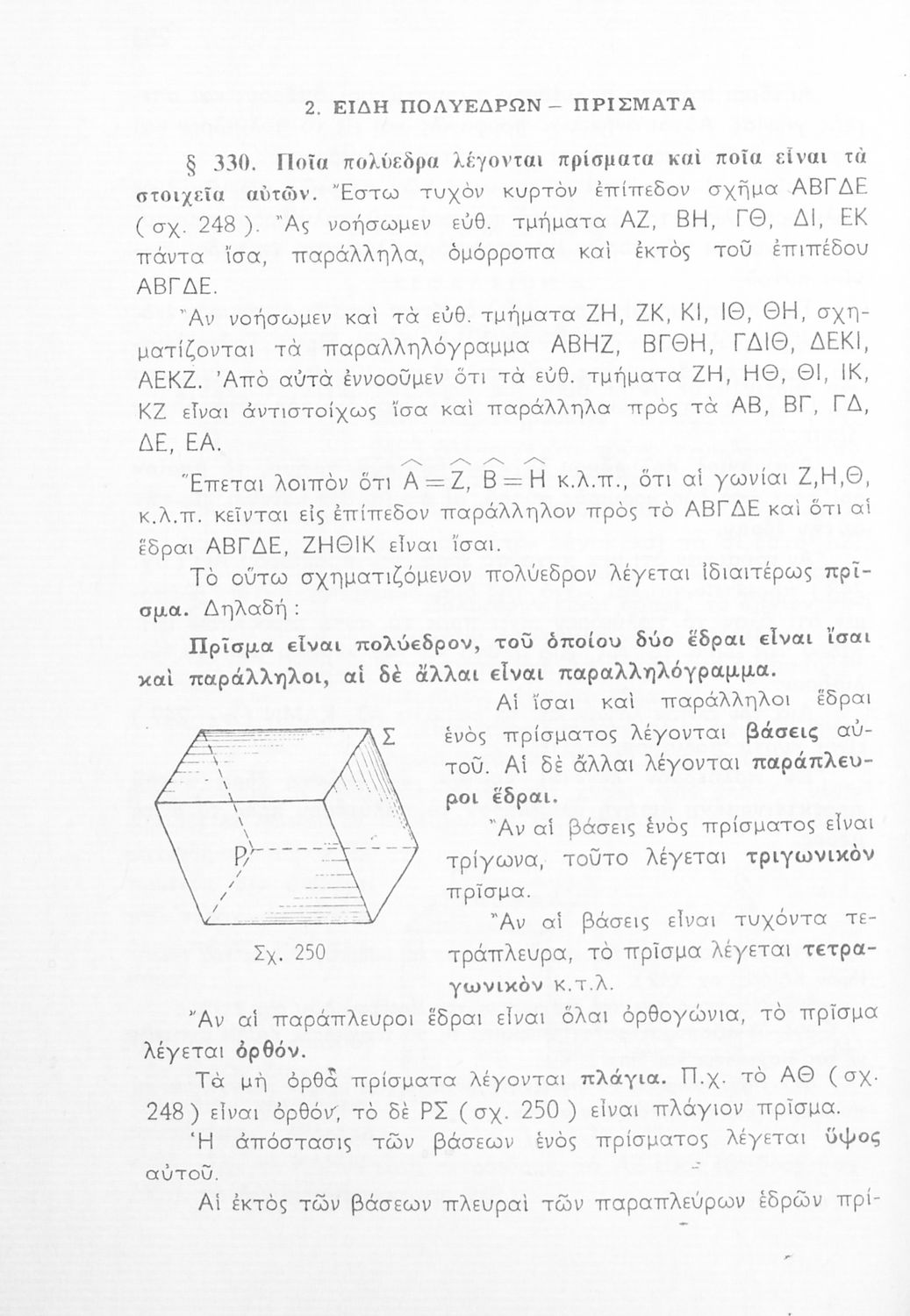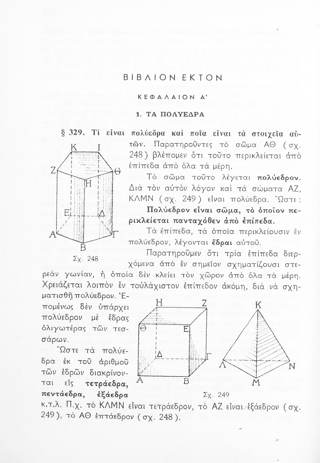 Σχολικό εγχειρίδιο Γεωμετρίας για τις Γ΄, Δ΄, Ε΄, ΣΤ΄ Γυμνασίου που περιλαμβάνει θεωρία και ασκήσεις και είναι χωρισμένο σε Επιπεδομετρία και Στερεομετρία. Φέρει το σύμβολο της δικτατορίας.