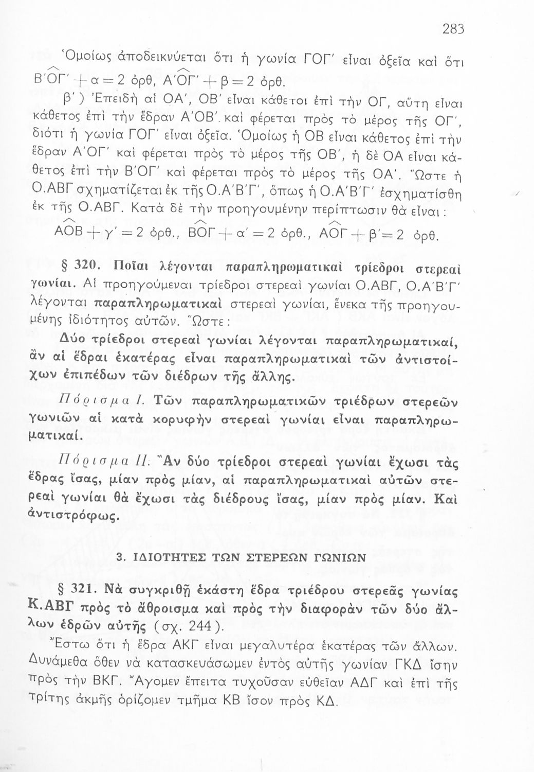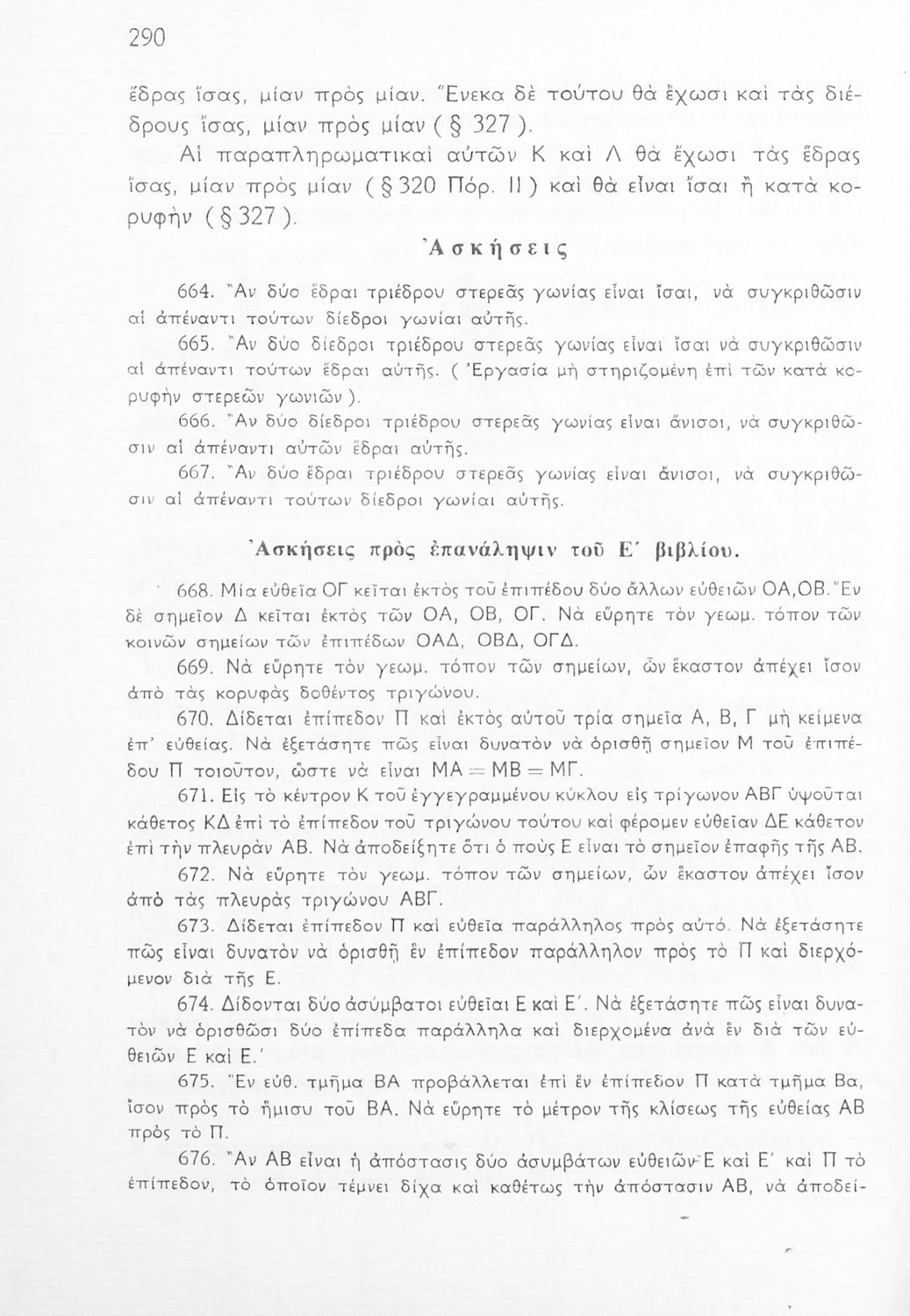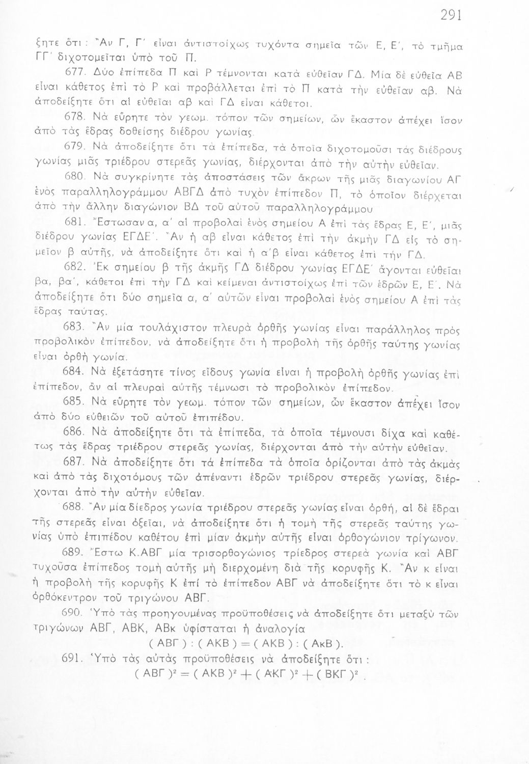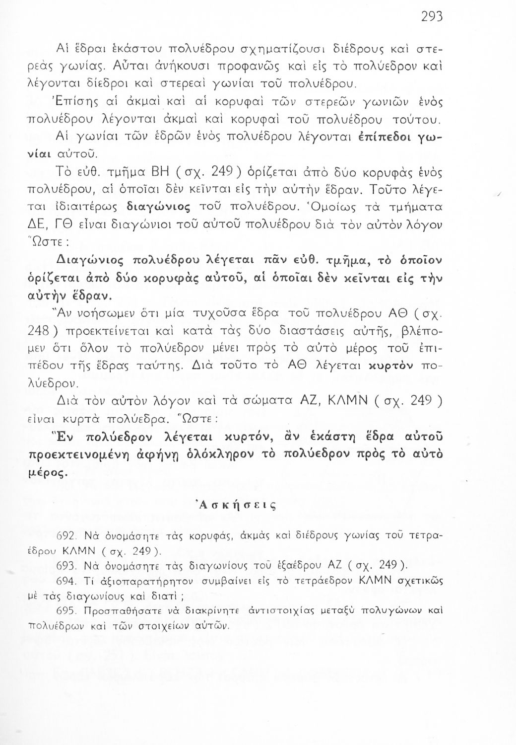 Σχολικό εγχειρίδιο Γεωμετρίας για τις Γ΄, Δ΄, Ε΄, ΣΤ΄ Γυμνασίου που περιλαμβάνει θεωρία και ασκήσεις και είναι χωρισμένο σε Επιπεδομετρία και Στερεομετρία.