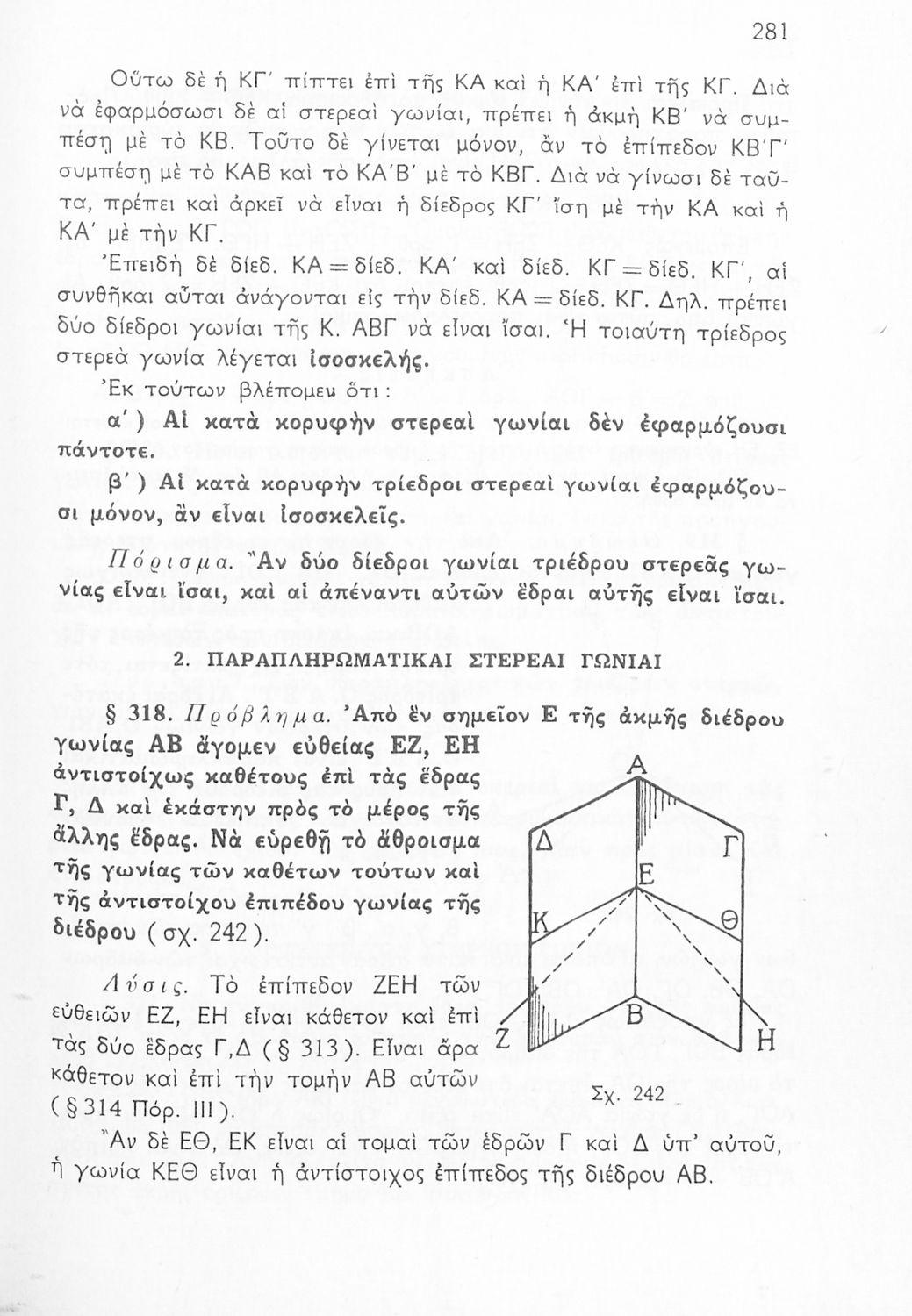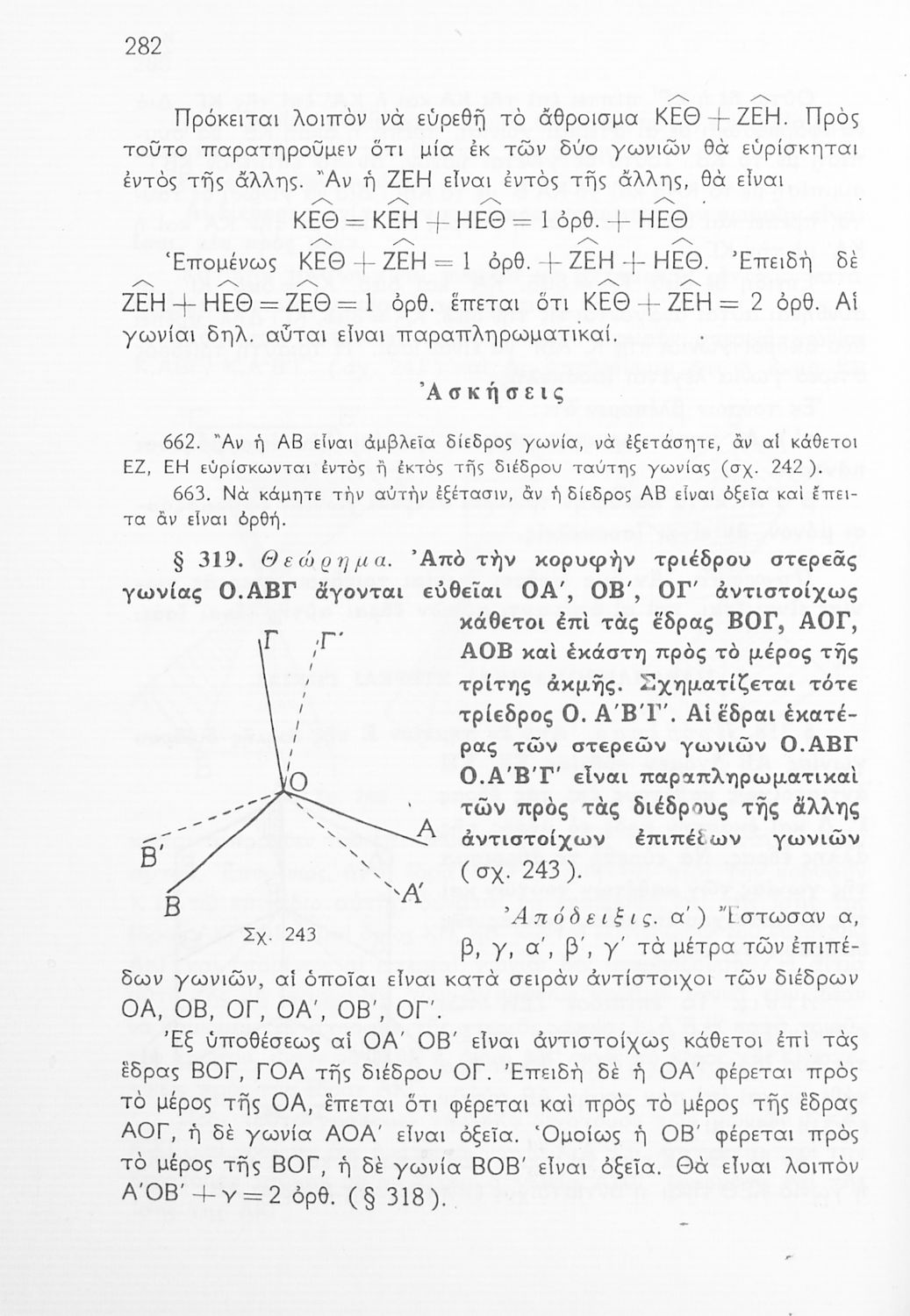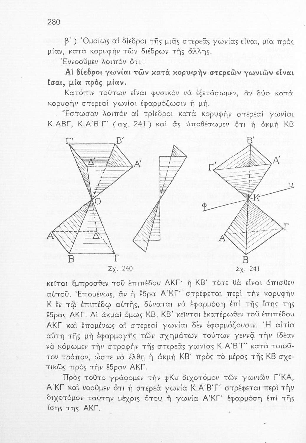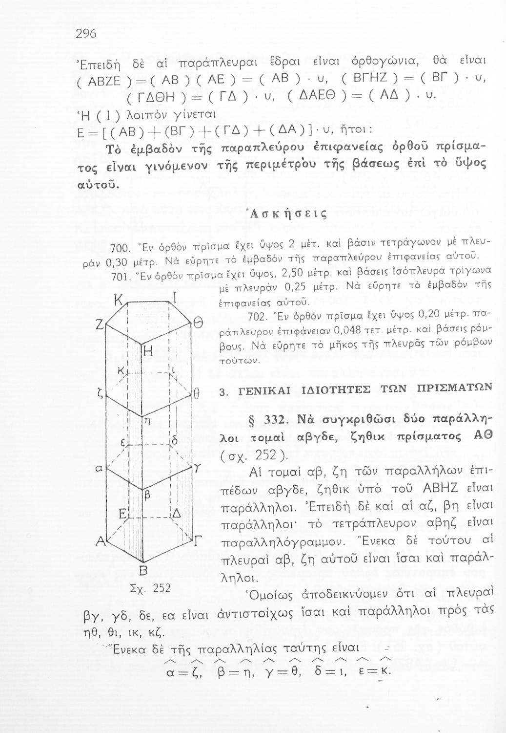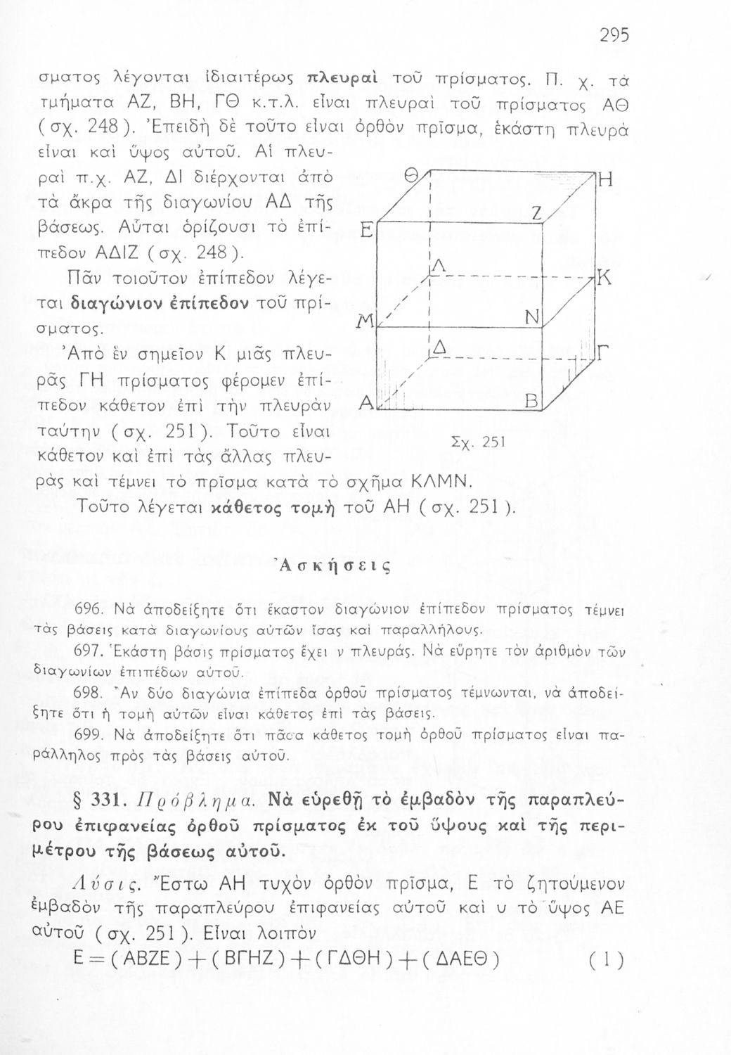 Σχολικό εγχειρίδιο Γεωμετρίας για τις Γ΄, Δ΄, Ε΄, ΣΤ΄ Γυμνασίου που περιλαμβάνει θεωρία και ασκήσεις και είναι χωρισμένο σε Επιπεδομετρία και Στερεομετρία.