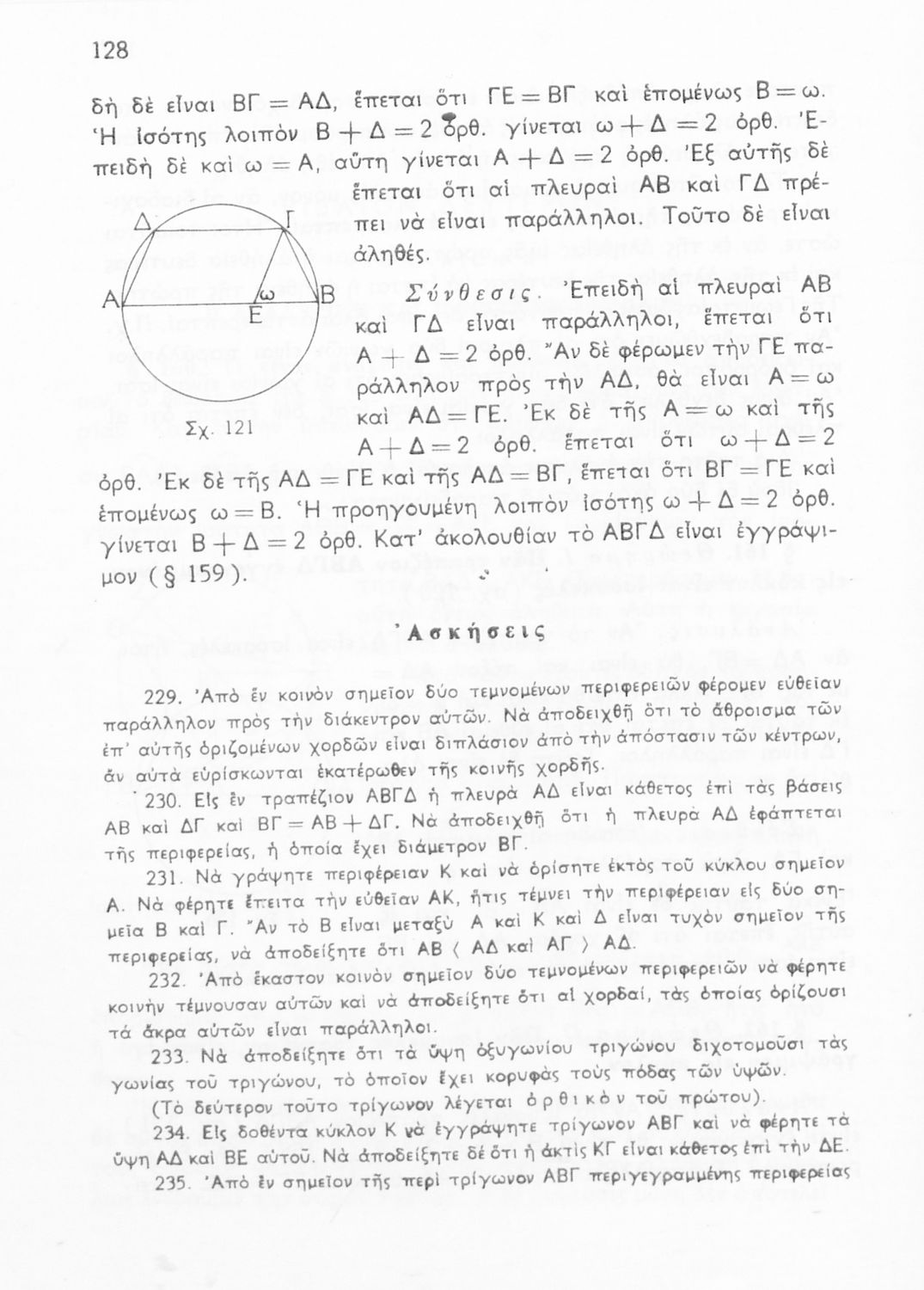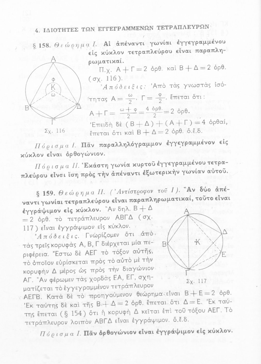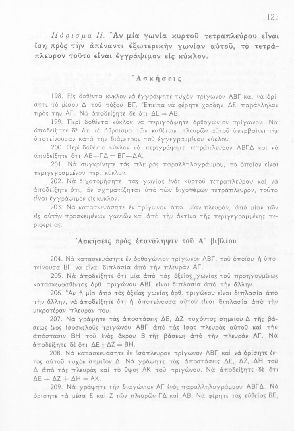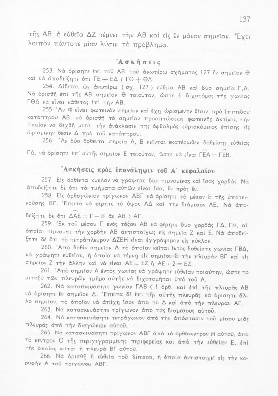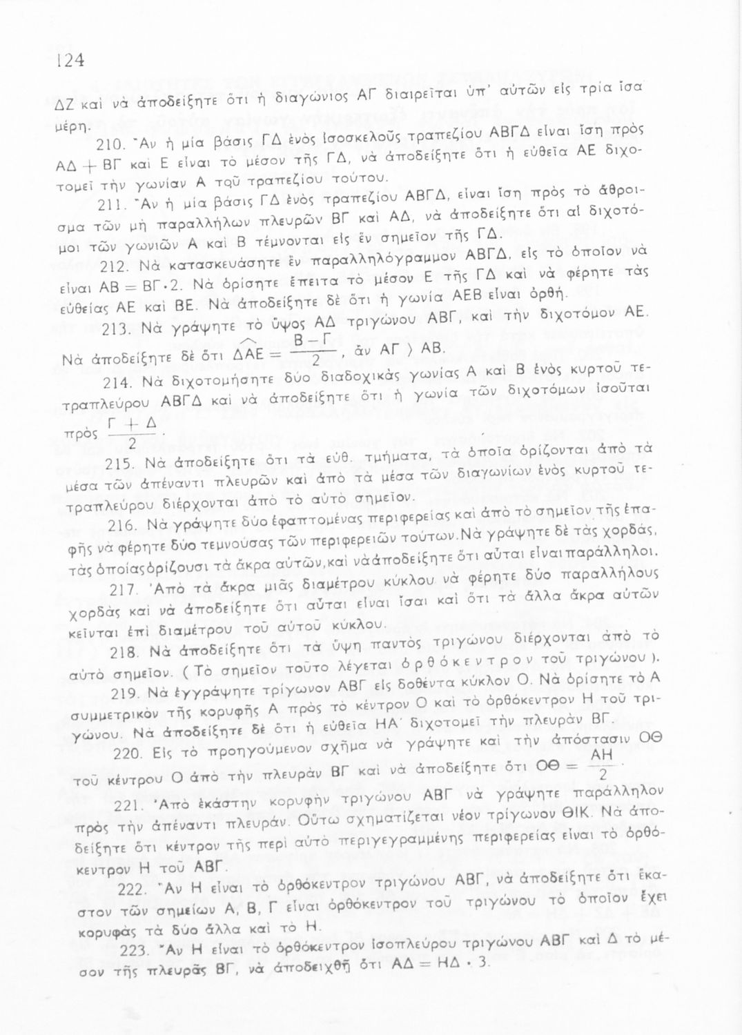 Σχολικό εγχειρίδιο Γεωμετρίας για τις Γ΄, Δ΄, Ε΄, ΣΤ΄ Γυμνασίου που εστιάζει στα βασικά θεωρήματα και ιδιότητες των γεωμετρικών σχημάτων. Φέρει το σύμβολο της δικτατορίας.