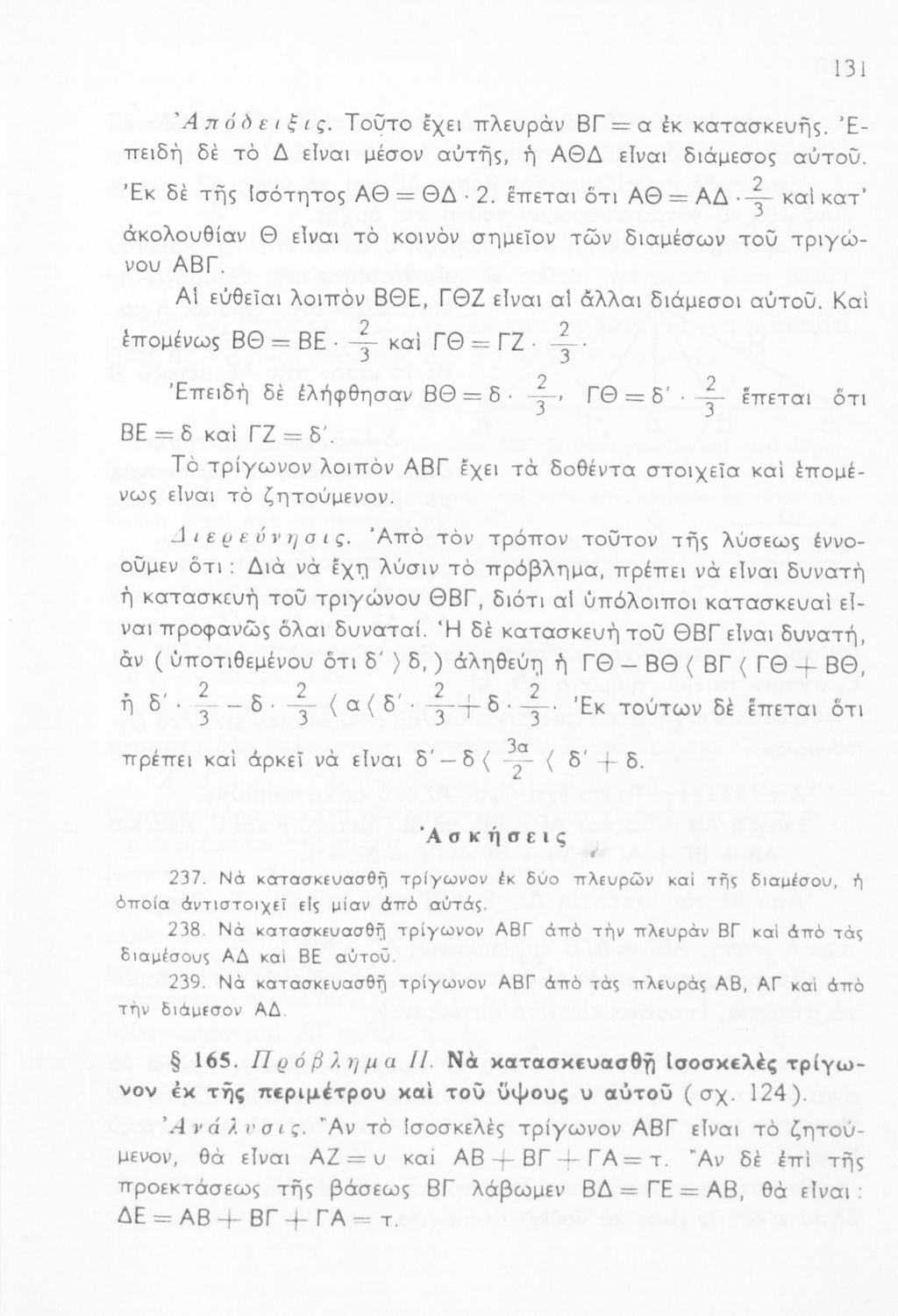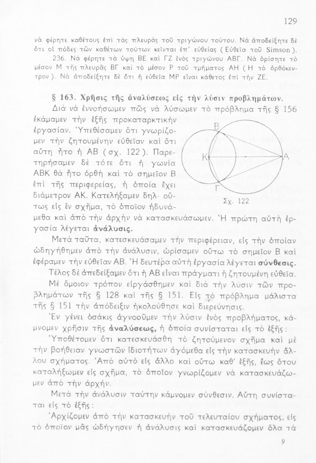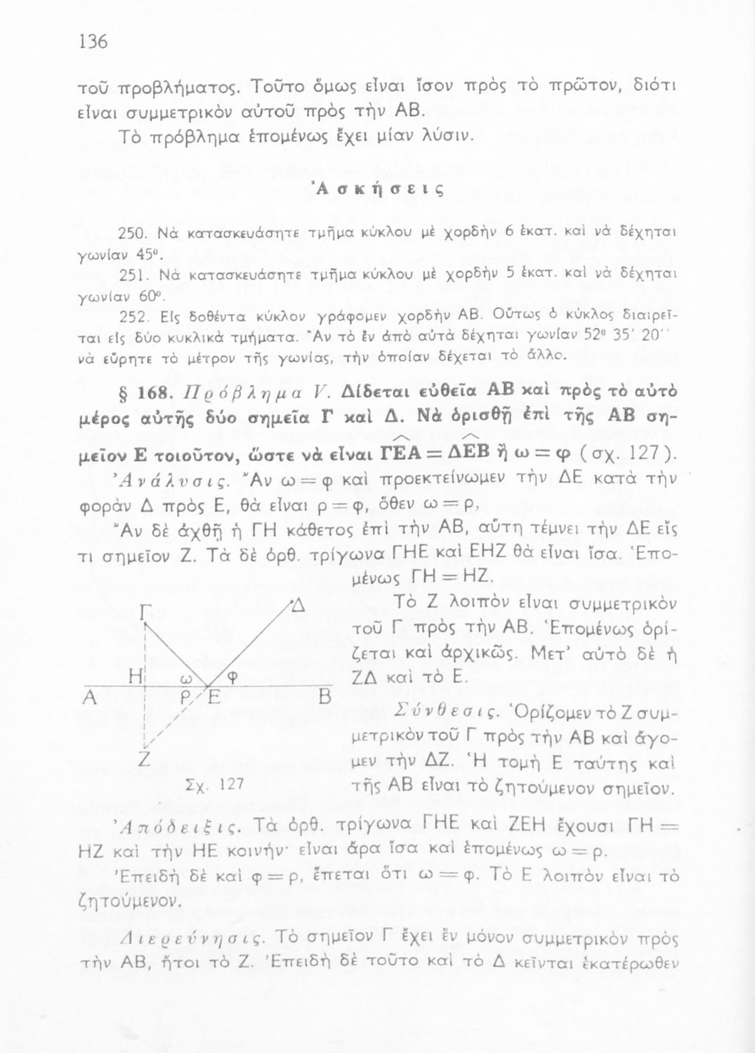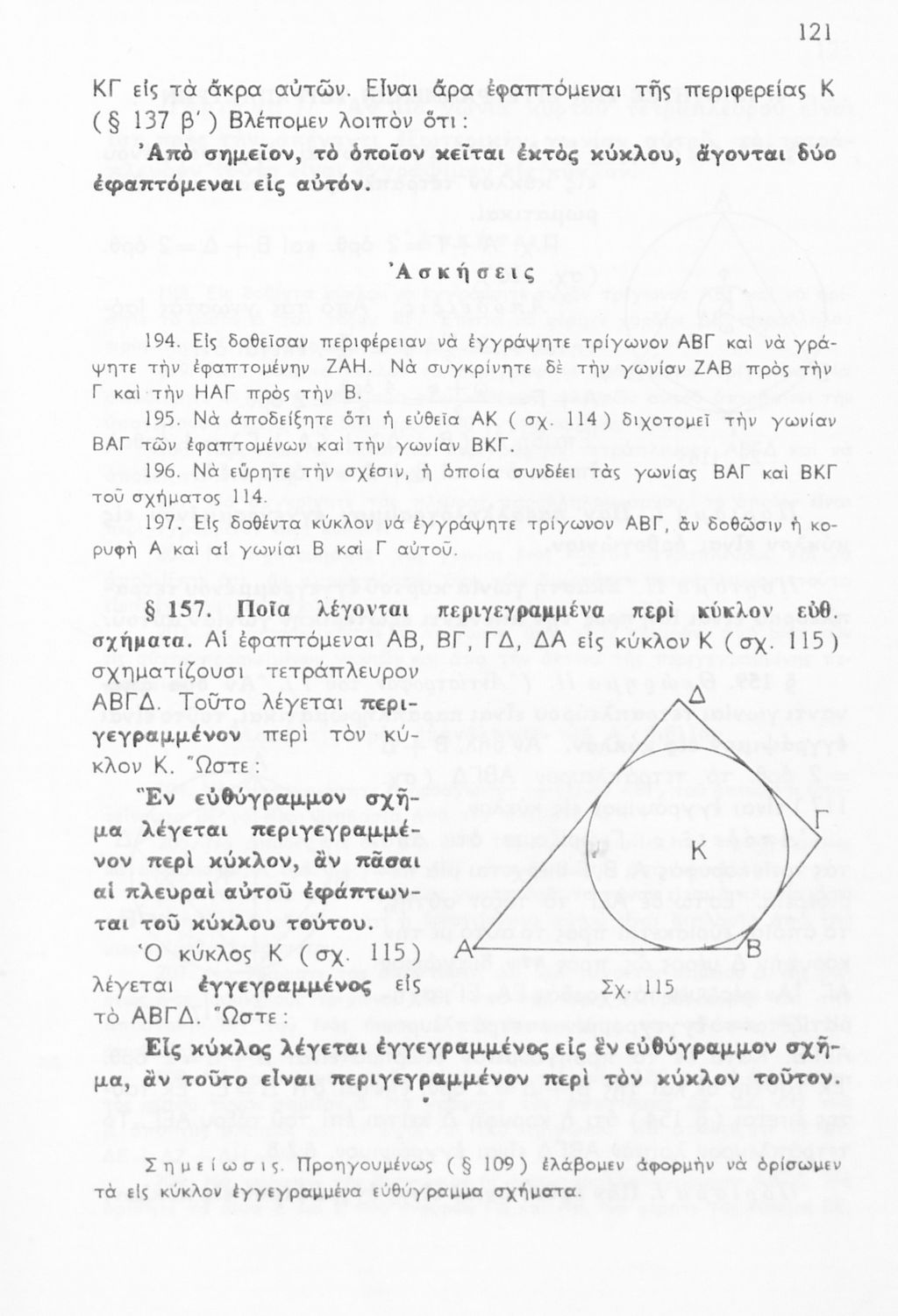 Σχολικό εγχειρίδιο Γεωμετρίας για τις Γ΄, Δ΄, Ε΄, ΣΤ΄ Γυμνασίου που εστιάζει στα βασικά θεωρήματα και ιδιότητες των γεωμετρικών σχημάτων. Φέρει το σύμβολο της δικτατορίας.