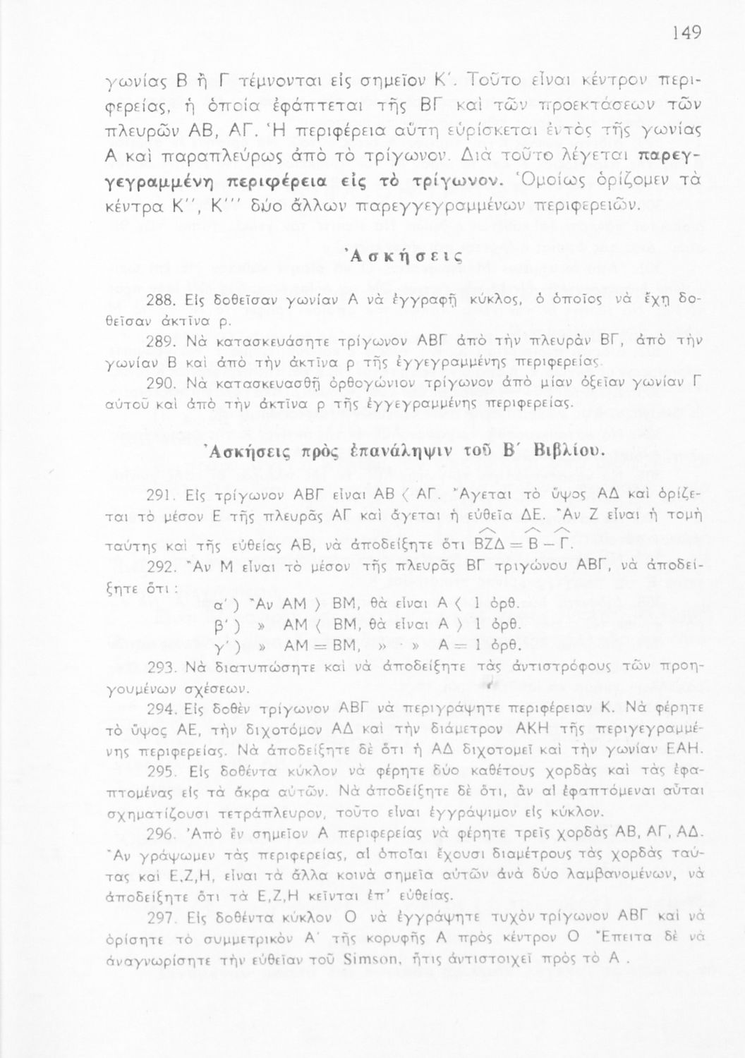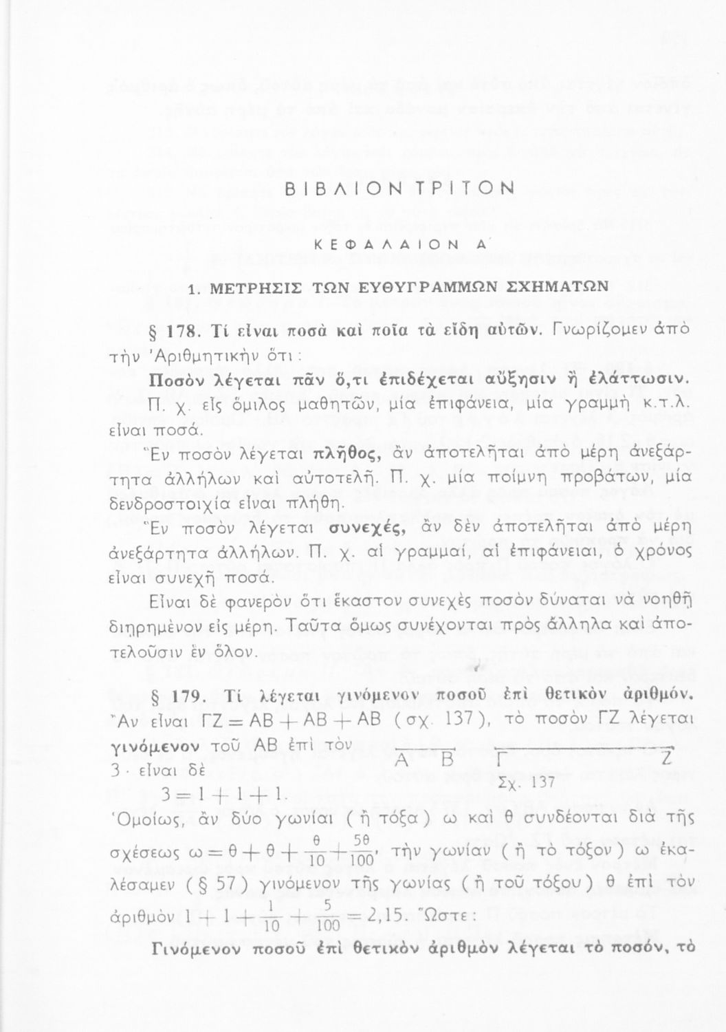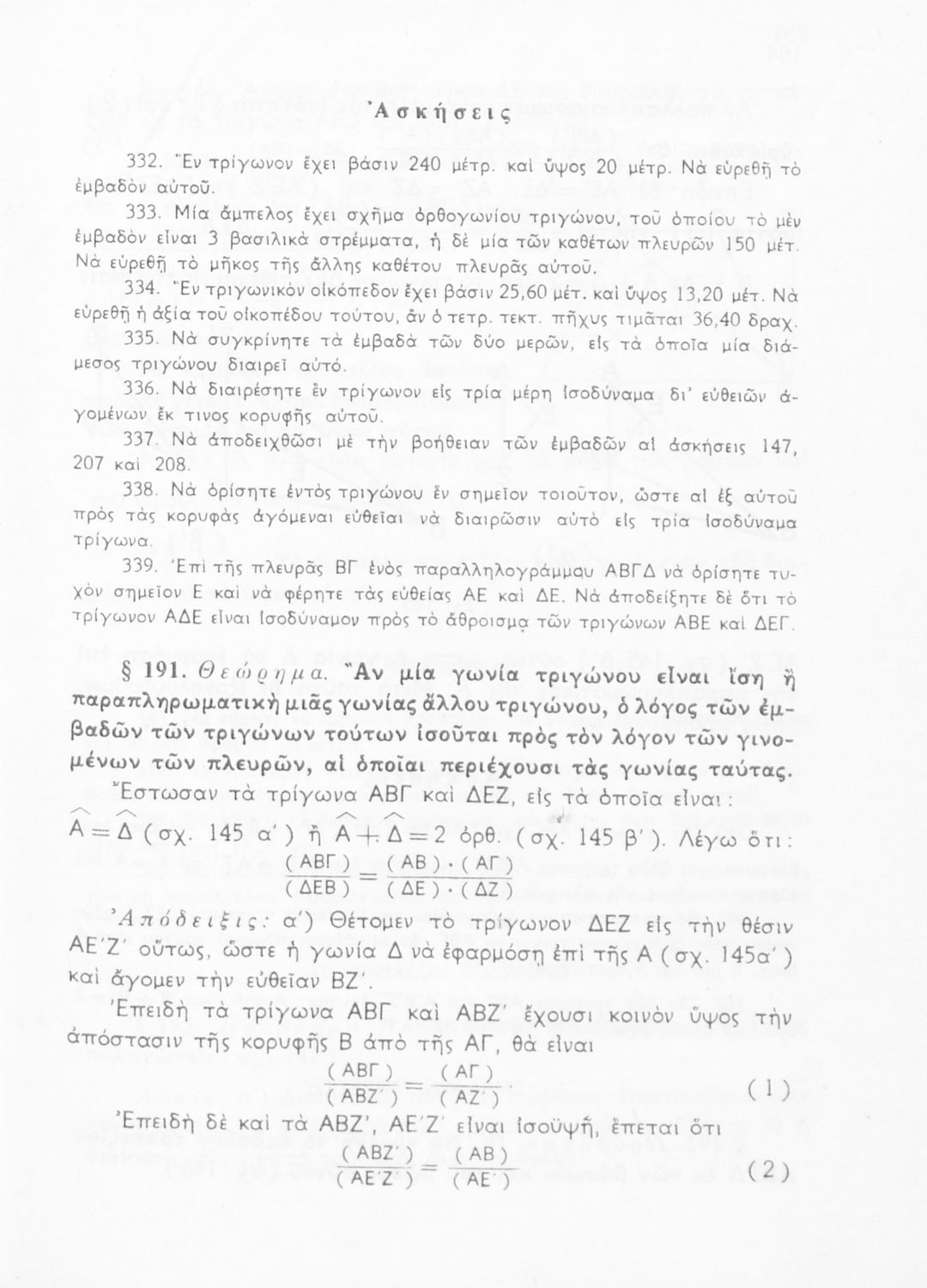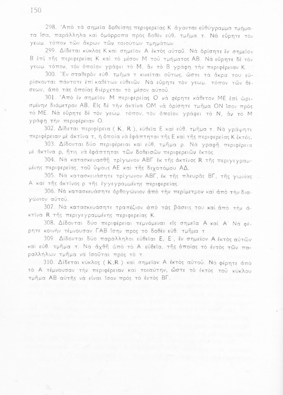 Σχολικό εγχειρίδιο Γεωμετρίας για τις Γ΄, Δ΄, Ε΄, ΣΤ΄ Γυμνασίου που περιλαμβάνει θεωρία και ασκήσεις και είναι χωρισμένο σε Επιπεδομετρία και Στερεομετρία. Φέρει το σύμβολο της δικτατορίας.