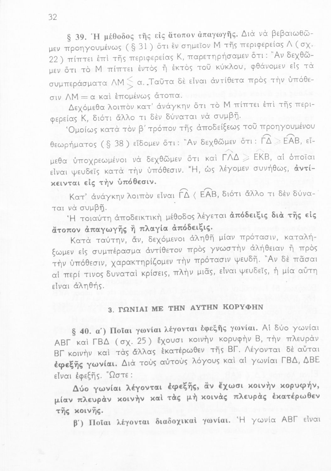 Σχολικό εγχειρίδιο Γεωμετρίας για τις Γ΄, Δ΄, Ε΄, ΣΤ΄ Γυμνασίου που περιλαμβάνει θεωρία και ασκήσεις και είναι χωρισμένο σε Επιπεδομετρία και Στερεομετρία.