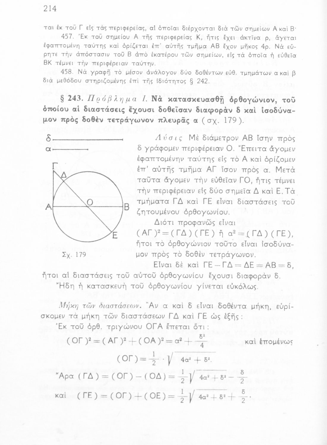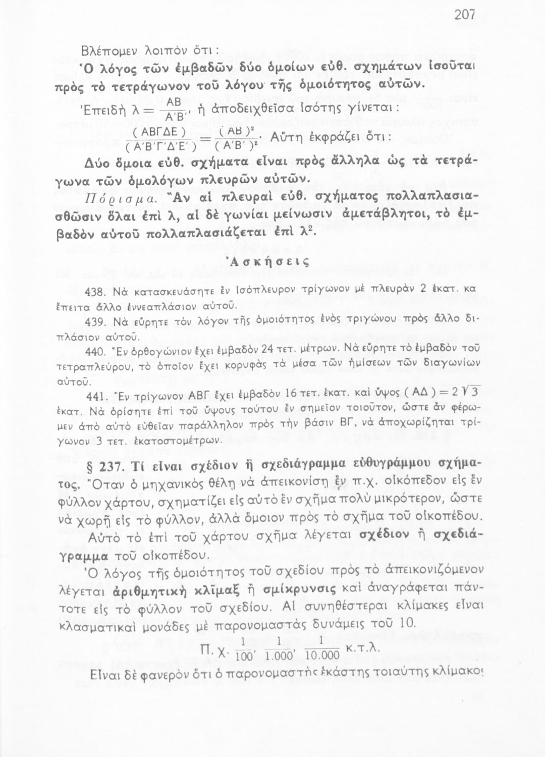 Σχολικό εγχειρίδιο Γεωμετρίας για τις Γ΄, Δ΄, Ε΄, ΣΤ΄ Γυμνασίου που εστιάζει στα βασικά θεωρήματα και ιδιότητες των γεωμετρικών σχημάτων. Φέρει το σύμβολο της δικτατορίας.