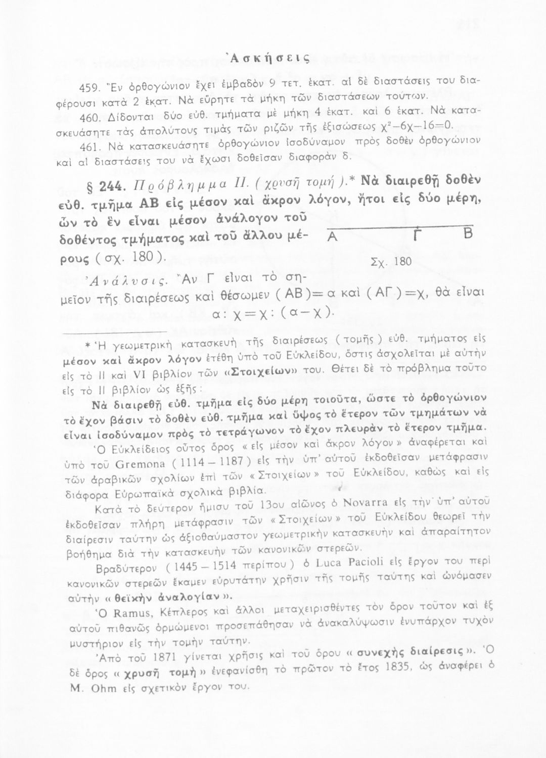 Σχολικό εγχειρίδιο Γεωμετρίας για τις Γ΄, Δ΄, Ε΄, ΣΤ΄ Γυμνασίου που περιλαμβάνει θεωρία και ασκήσεις και είναι χωρισμένο σε Επιπεδομετρία και Στερεομετρία. Φέρει το σύμβολο της δικτατορίας.