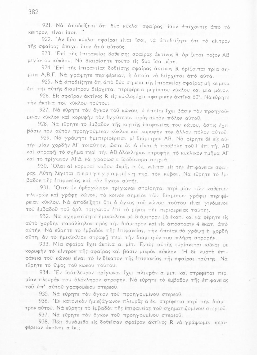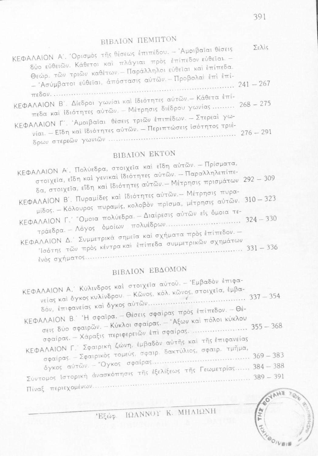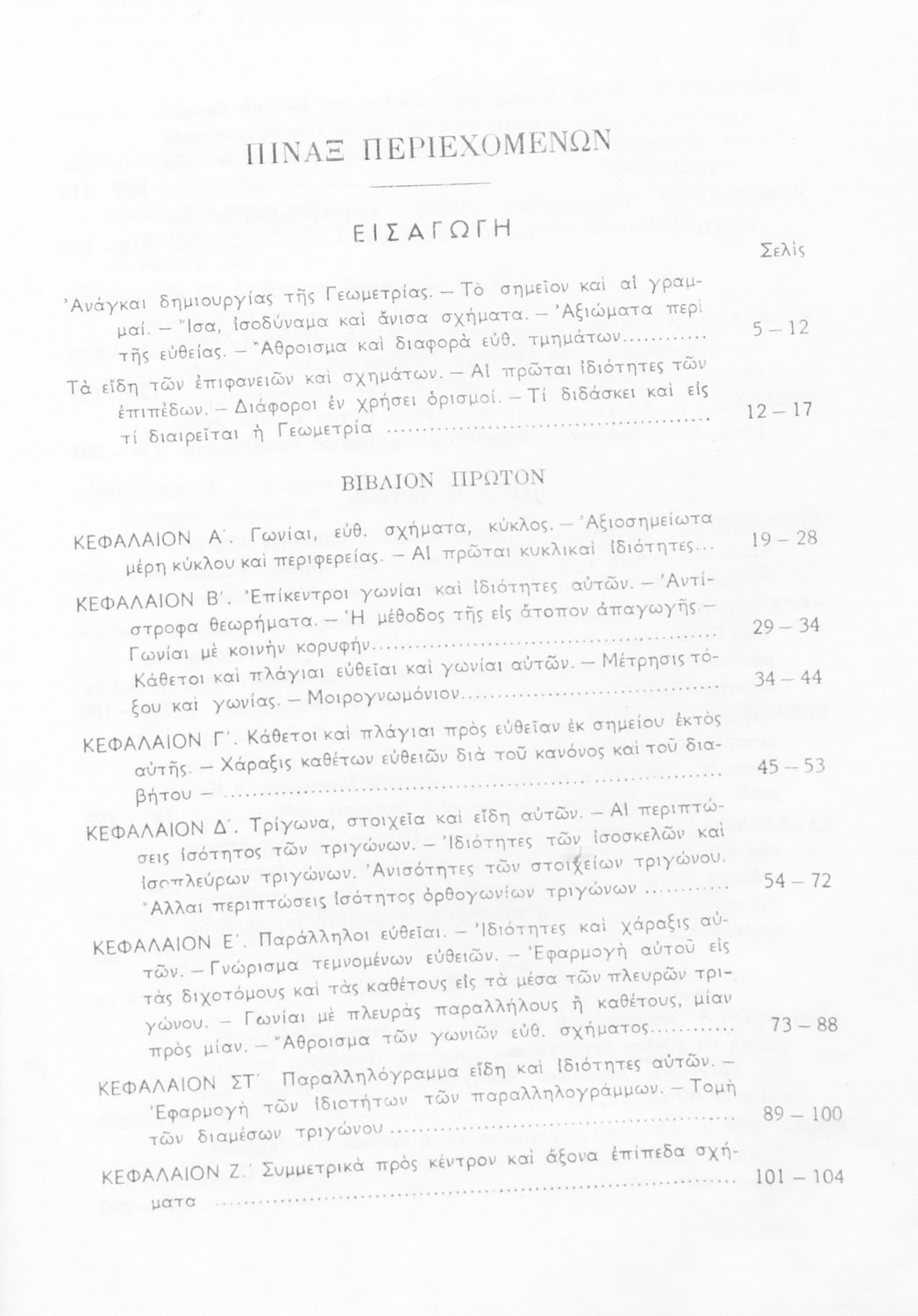 Σχολικό εγχειρίδιο Γεωμετρίας για τις Γ΄, Δ΄, Ε΄, ΣΤ΄ Γυμνασίου που περιλαμβάνει θεωρία και ασκήσεις και είναι χωρισμένο σε Επιπεδομετρία και Στερεομετρία. Φέρει το σύμβολο της δικτατορίας.