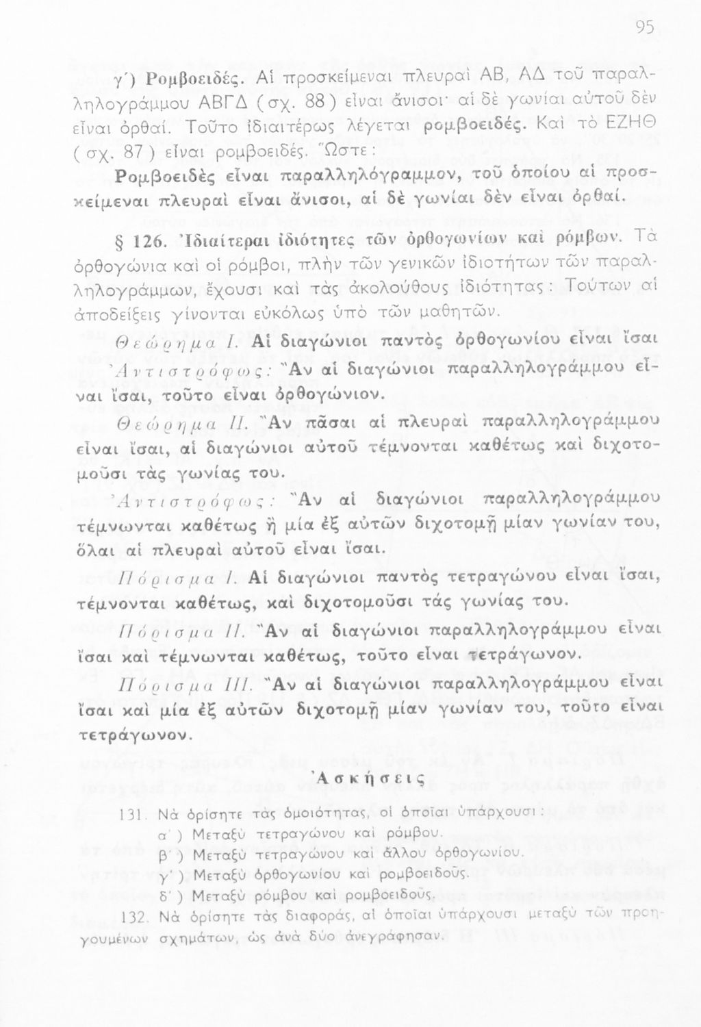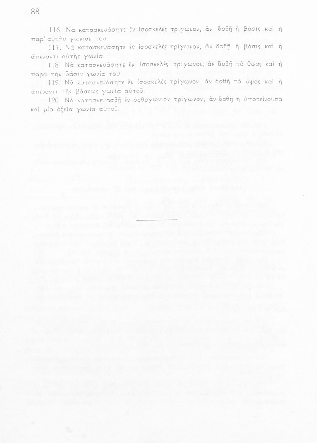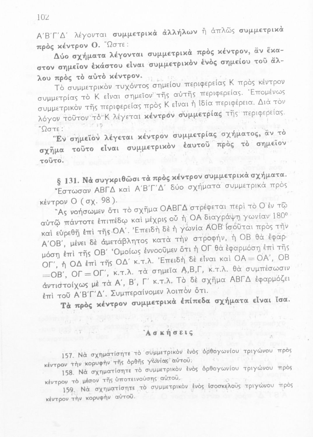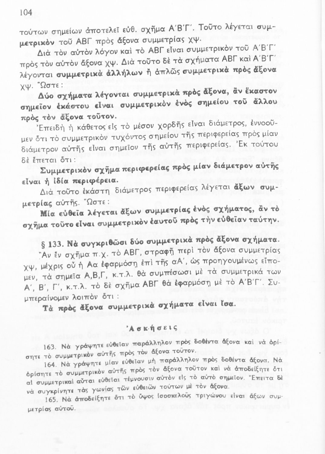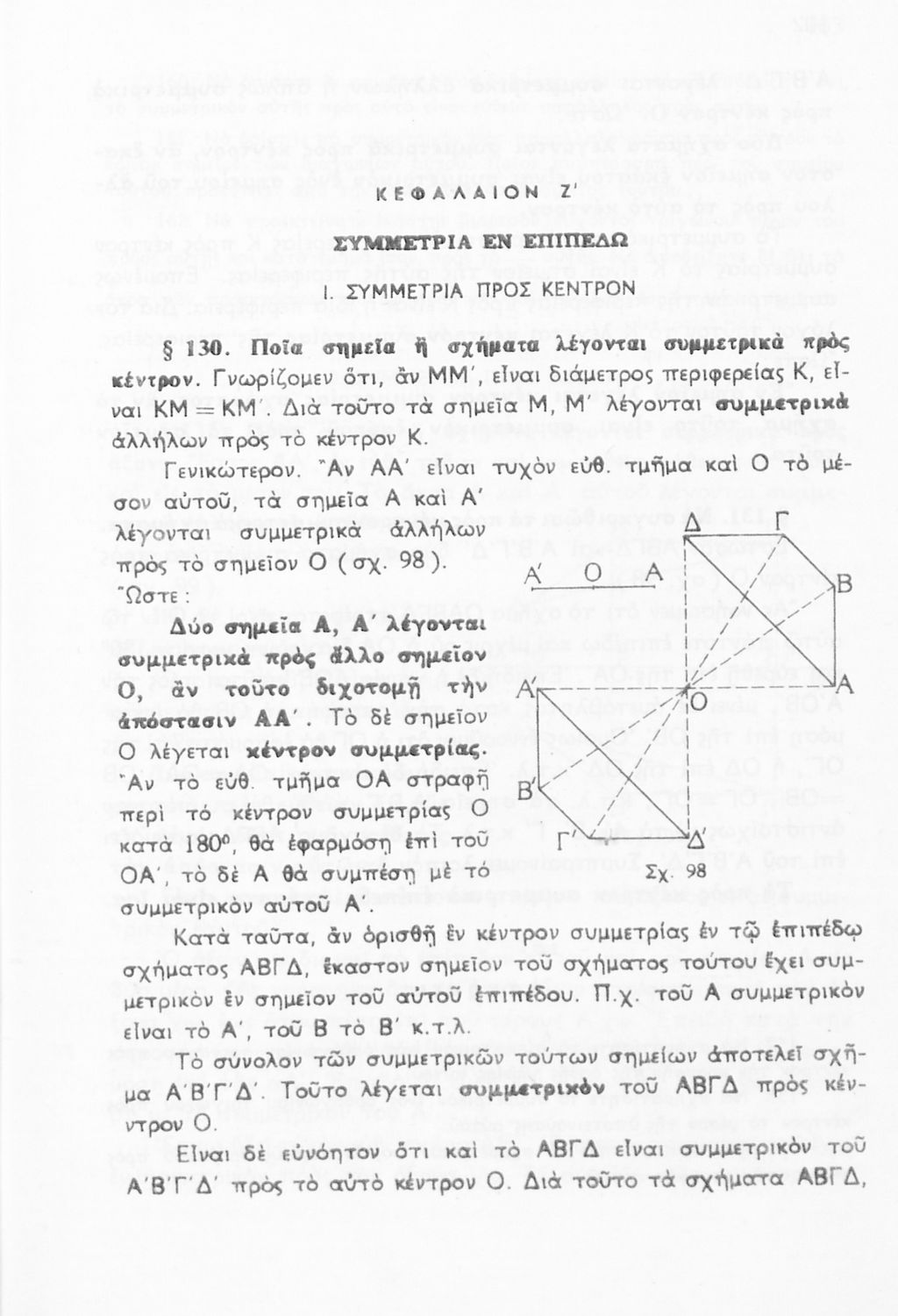 Σχολικό εγχειρίδιο Γεωμετρίας για τις Γ΄, Δ΄, Ε΄, ΣΤ΄ Γυμνασίου που εστιάζει στα βασικά θεωρήματα και ιδιότητες των γεωμετρικών σχημάτων. Φέρει το σύμβολο της δικτατορίας.