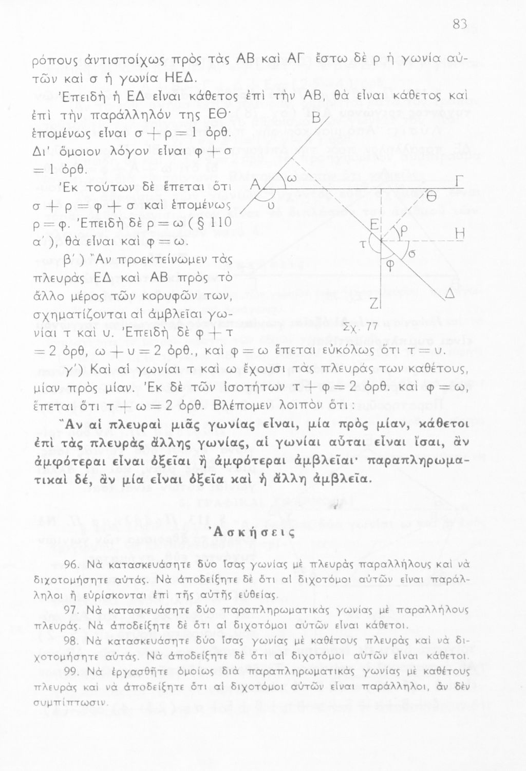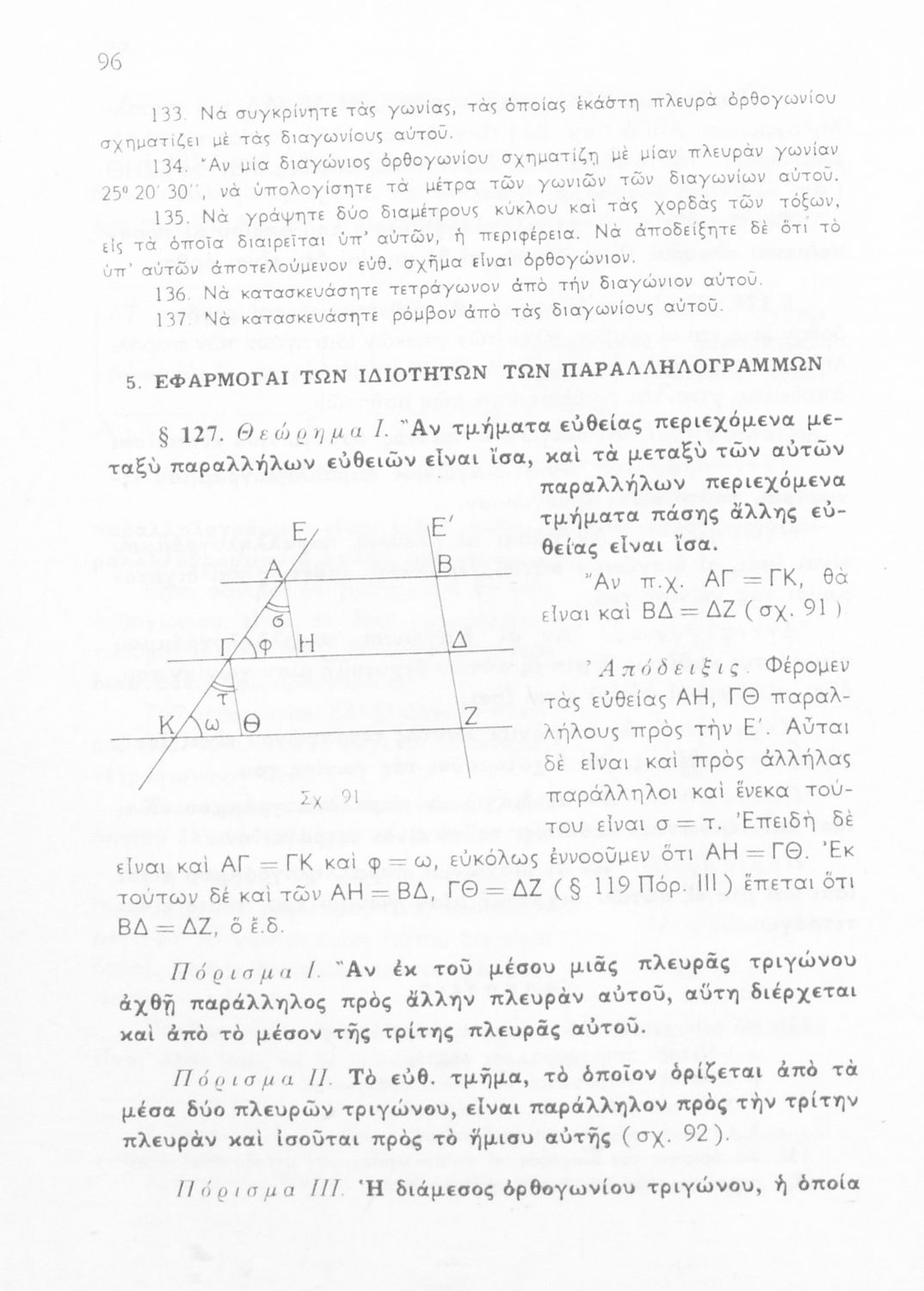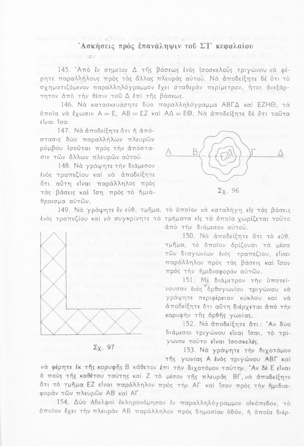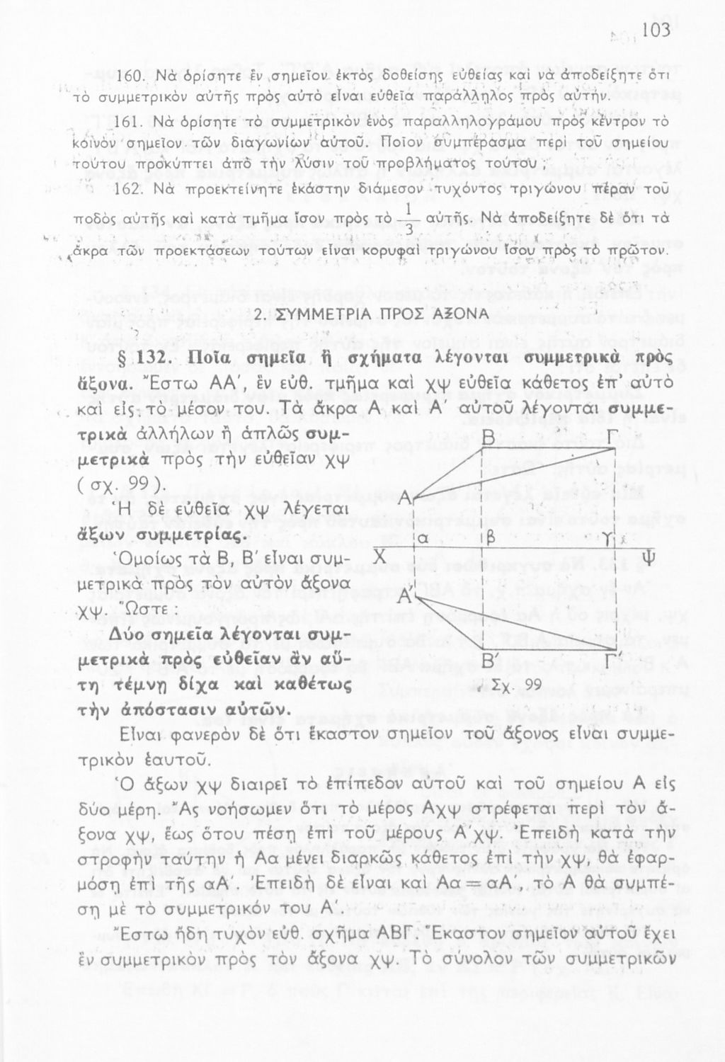 Σχολικό εγχειρίδιο Γεωμετρίας για τις Γ΄, Δ΄, Ε΄, ΣΤ΄ Γυμνασίου που εστιάζει στα βασικά θεωρήματα και ιδιότητες των γεωμετρικών σχημάτων. Φέρει το σύμβολο της δικτατορίας.