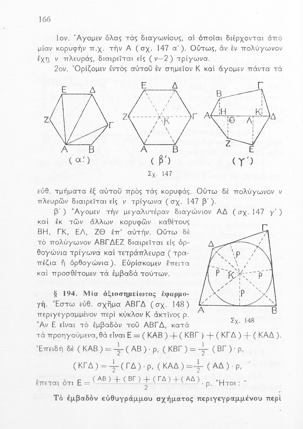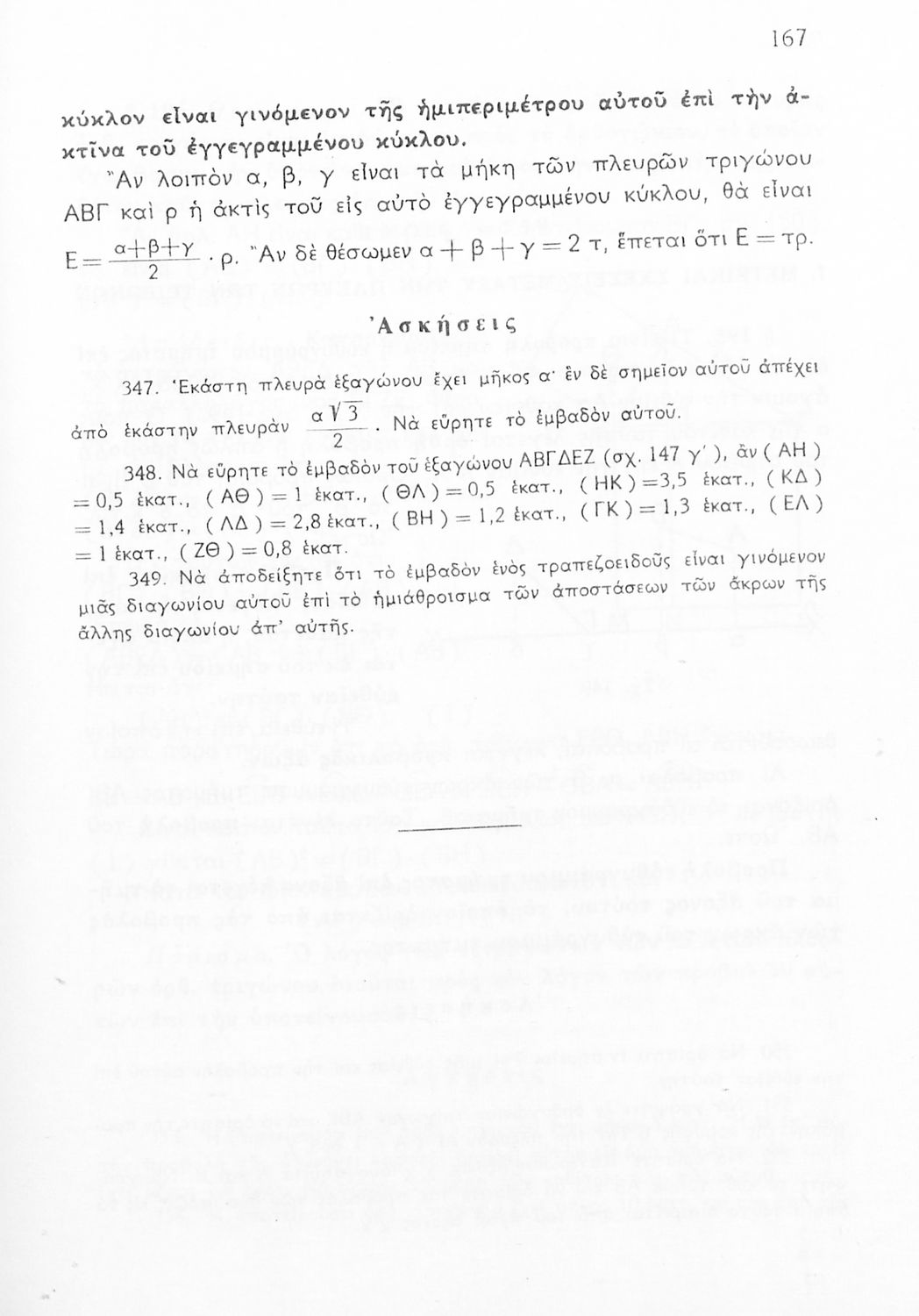 Σχολικό εγχειρίδιο Γεωμετρίας για τις Γ΄, Δ΄, Ε΄, ΣΤ΄ Γυμνασίου που περιλαμβάνει θεωρία και ασκήσεις και είναι χωρισμένο σε Επιπεδομετρία και Στερεομετρία. Φέρει το σύμβολο της δικτατορίας.