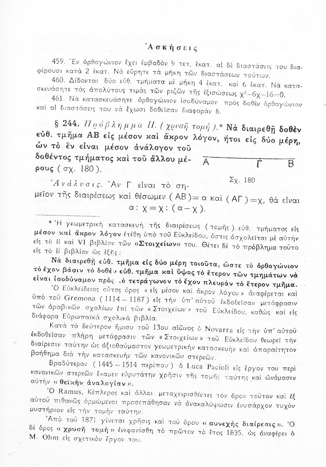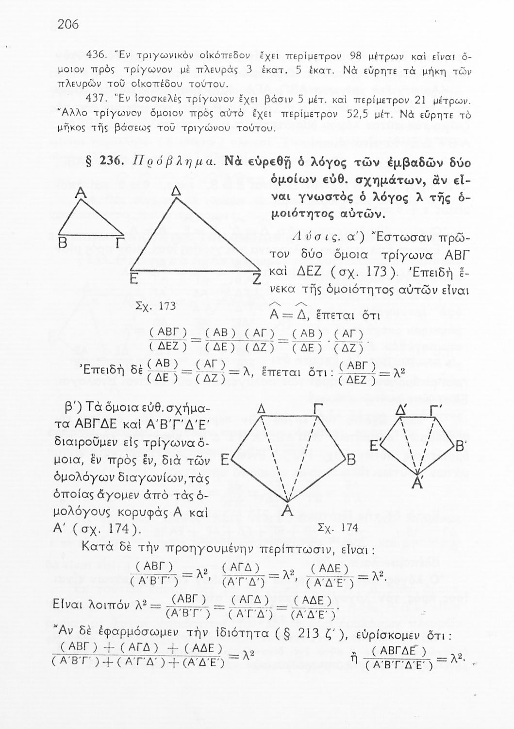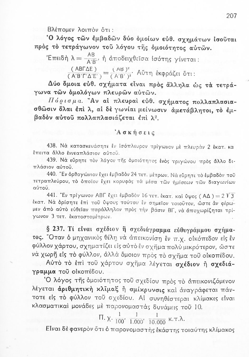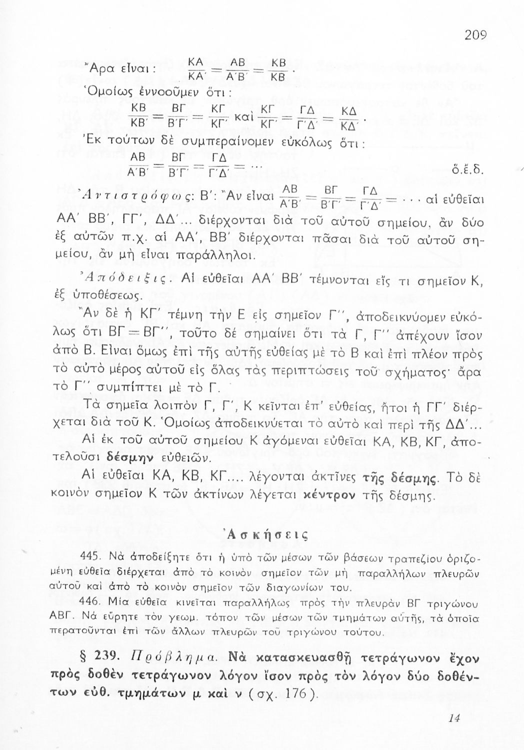 Σχολικό εγχειρίδιο Γεωμετρίας για τις Γ΄, Δ΄, Ε΄, ΣΤ΄ Γυμνασίου που περιλαμβάνει θεωρία και ασκήσεις και είναι χωρισμένο σε Επιπεδομετρία και Στερεομετρία. Φέρει το σύμβολο της δικτατορίας.