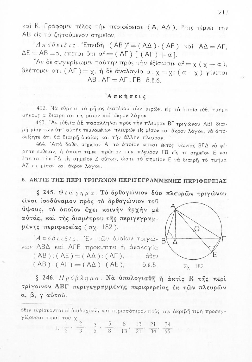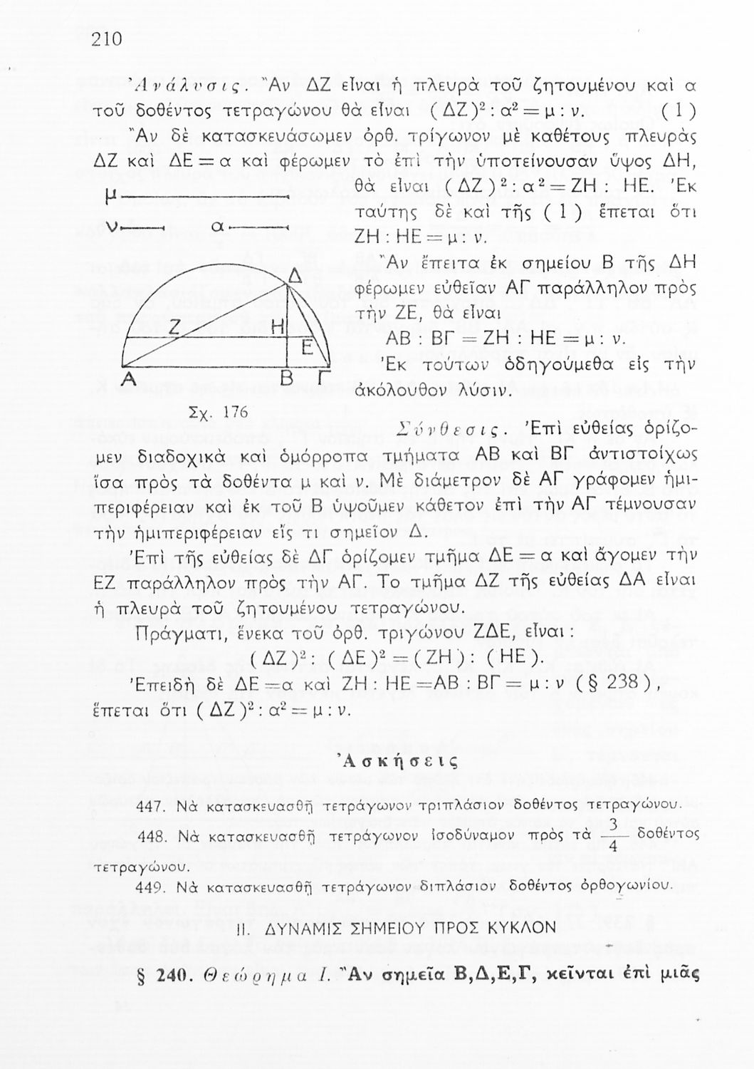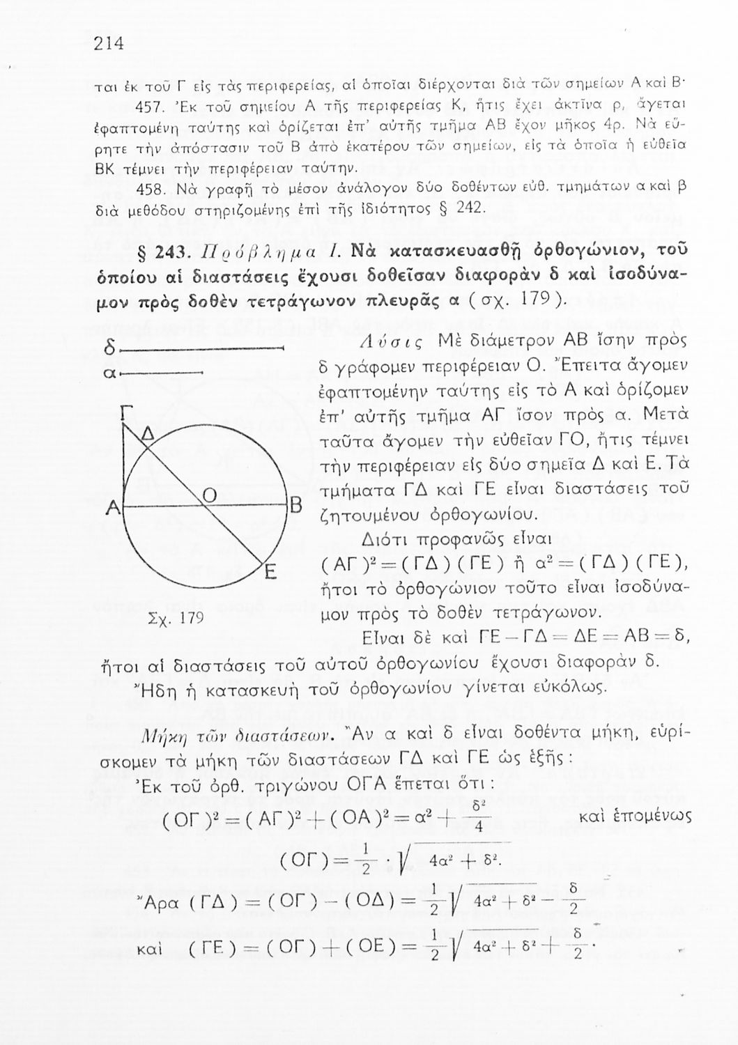 Σχολικό εγχειρίδιο Γεωμετρίας για τις Γ΄, Δ΄, Ε΄, ΣΤ΄ Γυμνασίου που εστιάζει στα βασικά θεωρήματα και ιδιότητες των γεωμετρικών σχημάτων. Φέρει το σύμβολο της δικτατορίας.