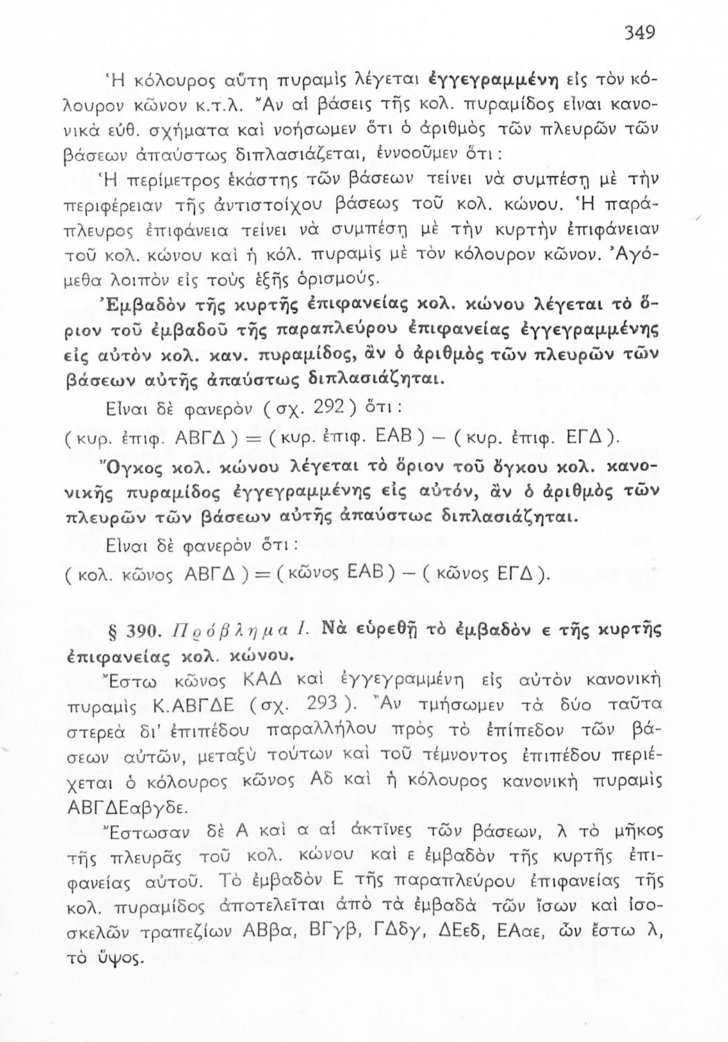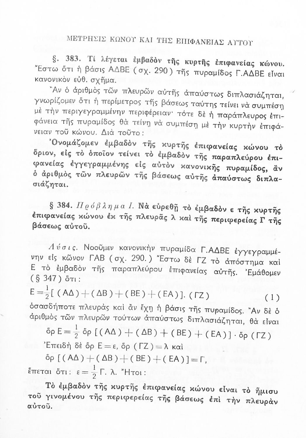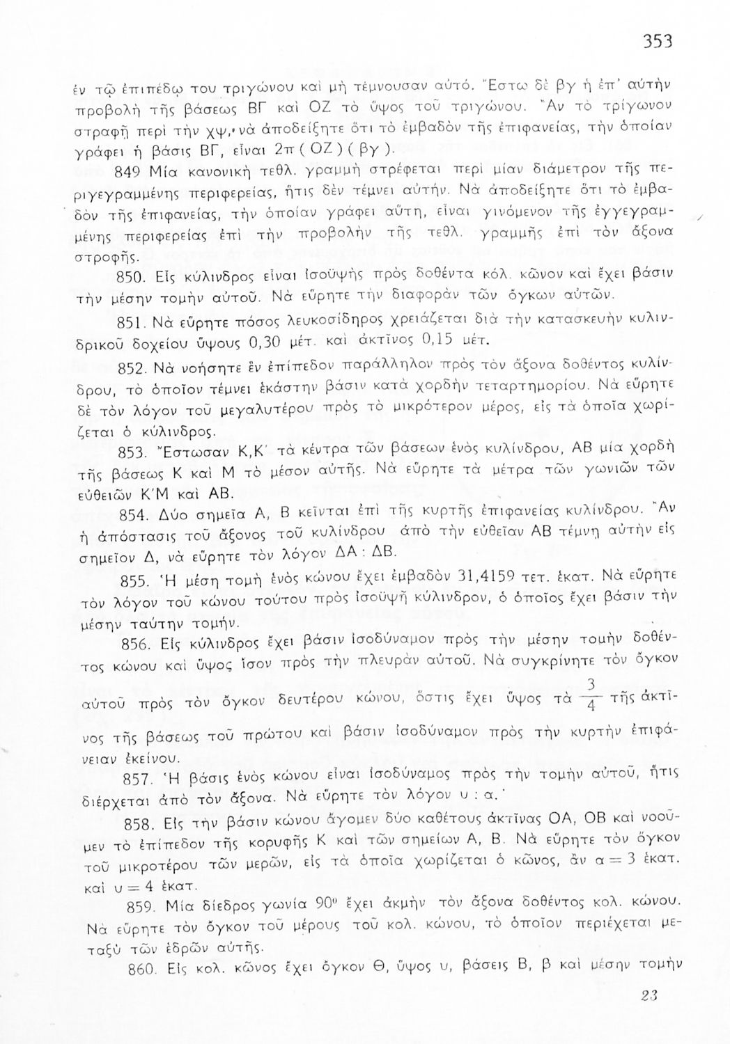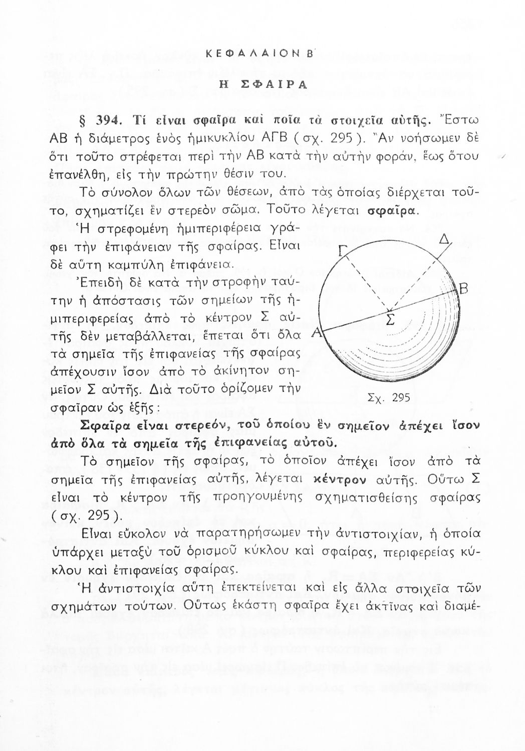 Σχολικό εγχειρίδιο Γεωμετρίας για τις Γ΄, Δ΄, Ε΄, ΣΤ΄ Γυμνασίου που περιλαμβάνει θεωρία και ασκήσεις και είναι χωρισμένο σε Επιπεδομετρία και Στερεομετρία. Φέρει το σύμβολο της δικτατορίας.