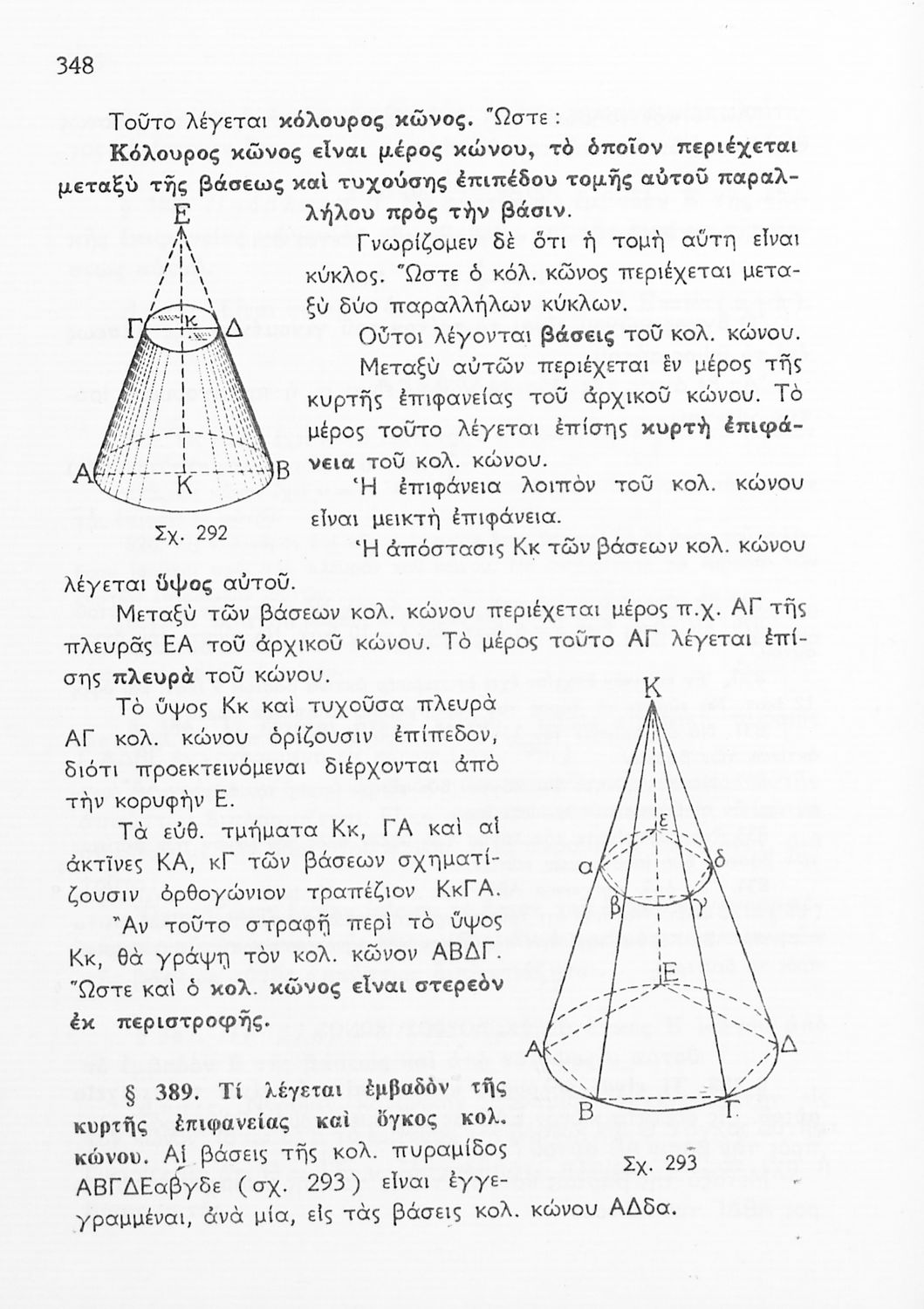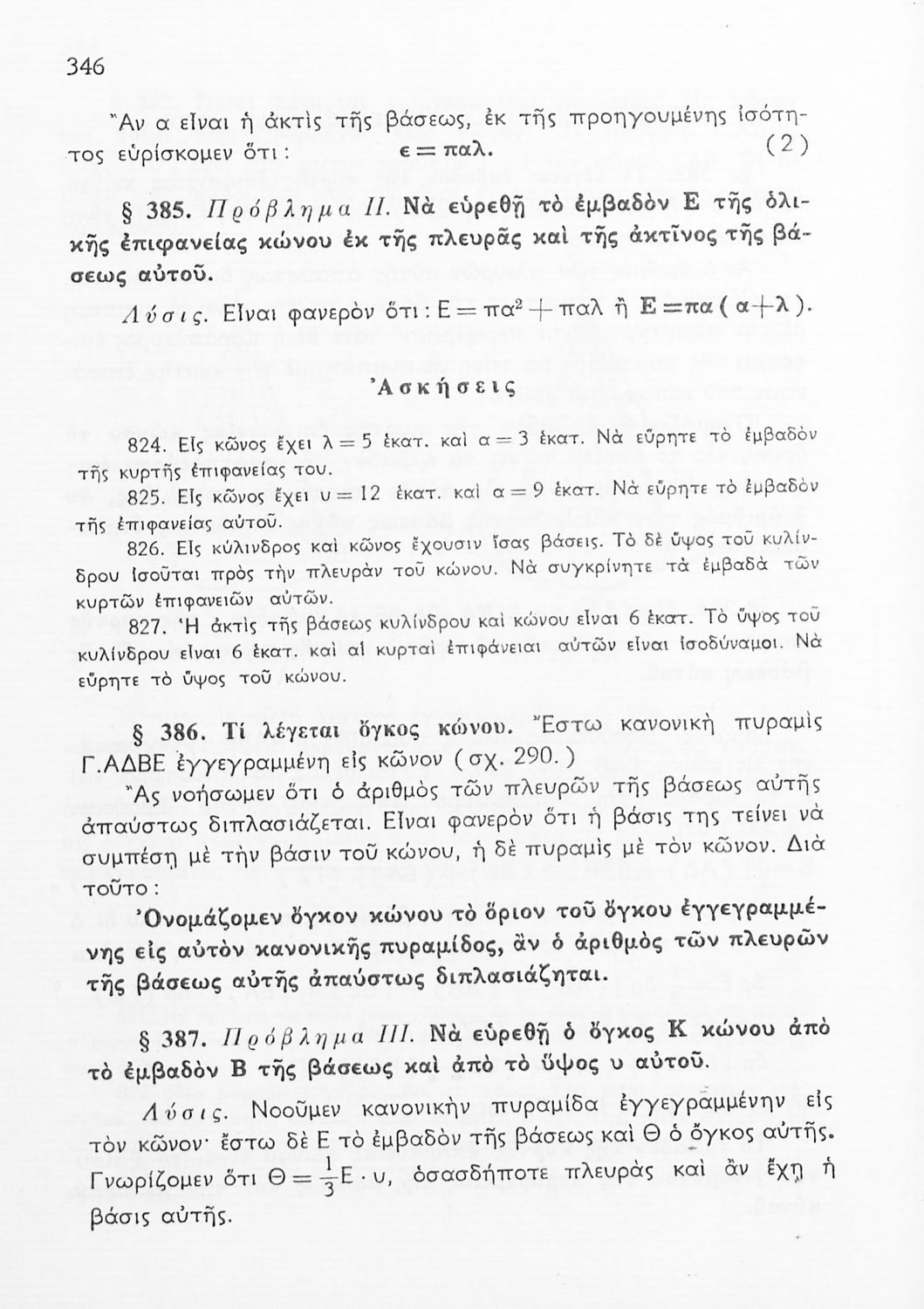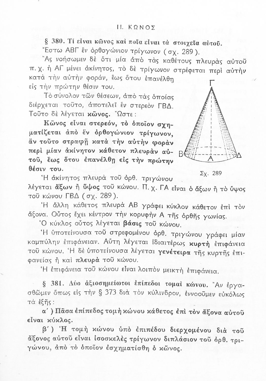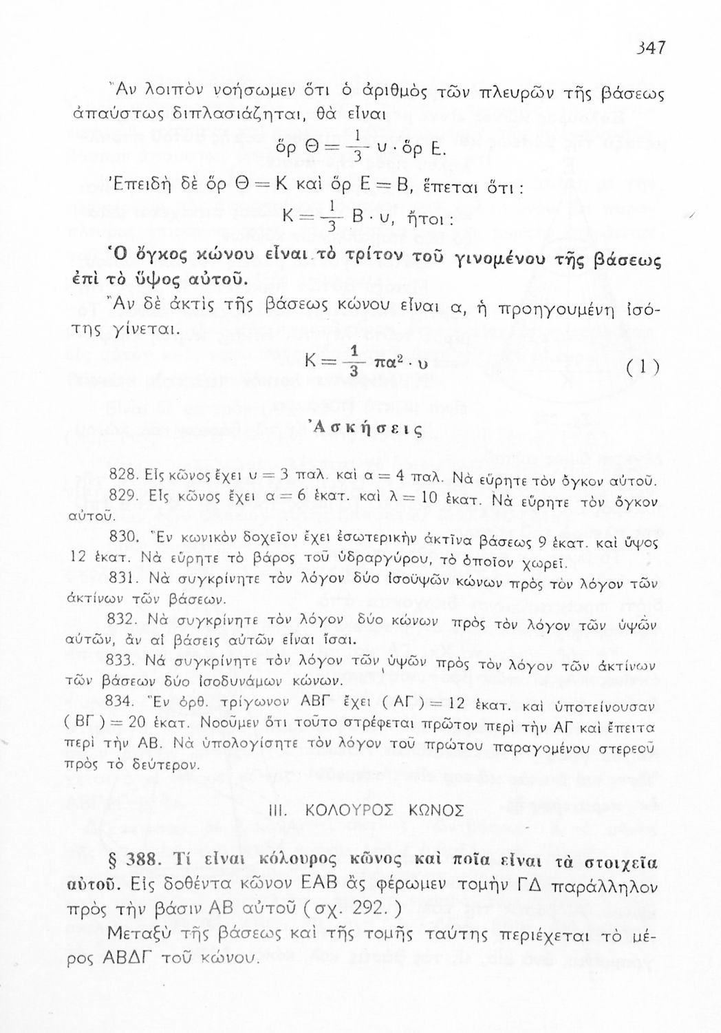 Σχολικό εγχειρίδιο Γεωμετρίας για τις Γ΄, Δ΄, Ε΄, ΣΤ΄ Γυμνασίου που περιλαμβάνει θεωρία και ασκήσεις και είναι χωρισμένο σε Επιπεδομετρία και Στερεομετρία. Φέρει το σύμβολο της δικτατορίας.