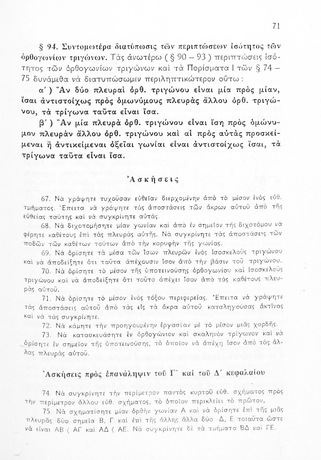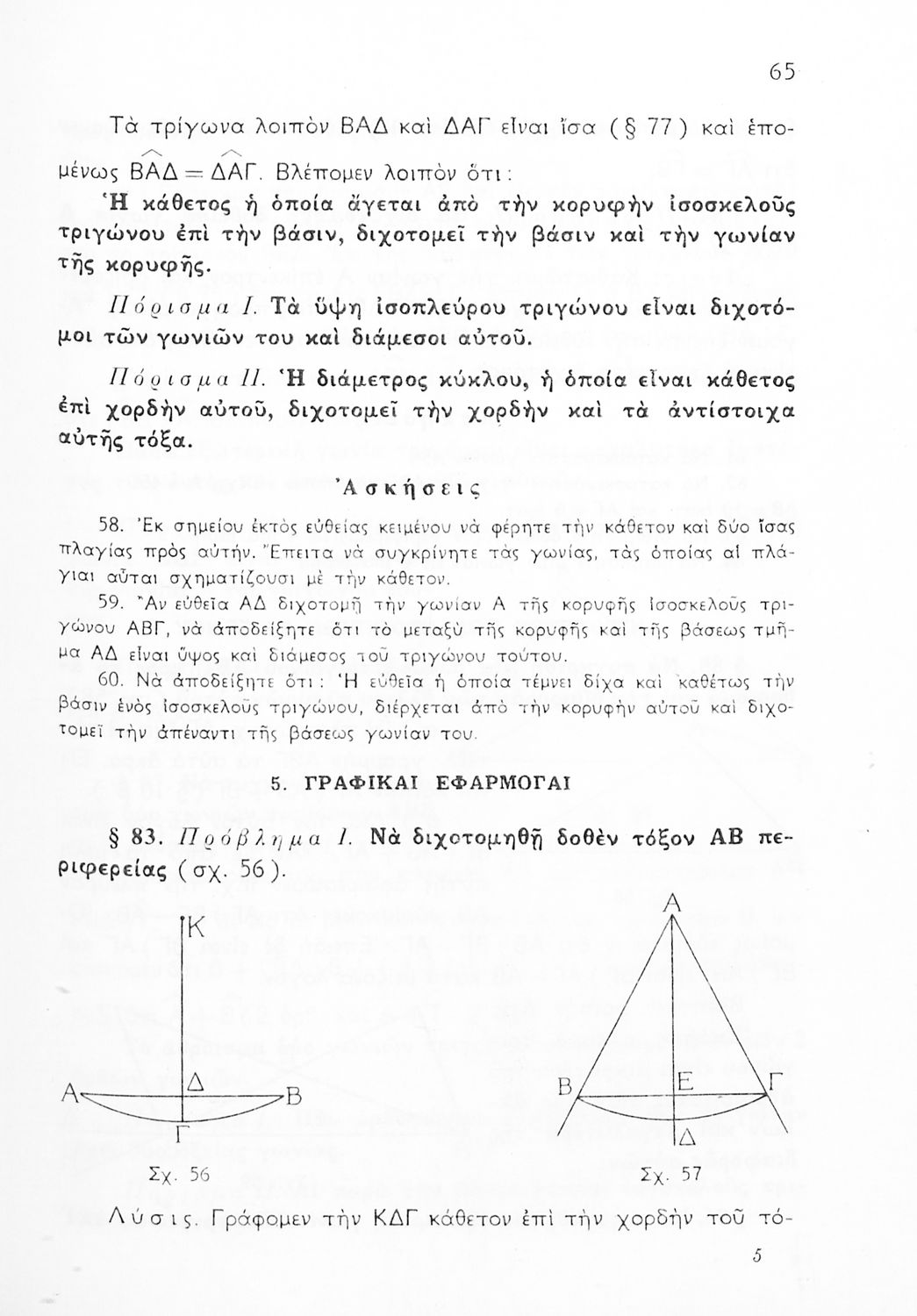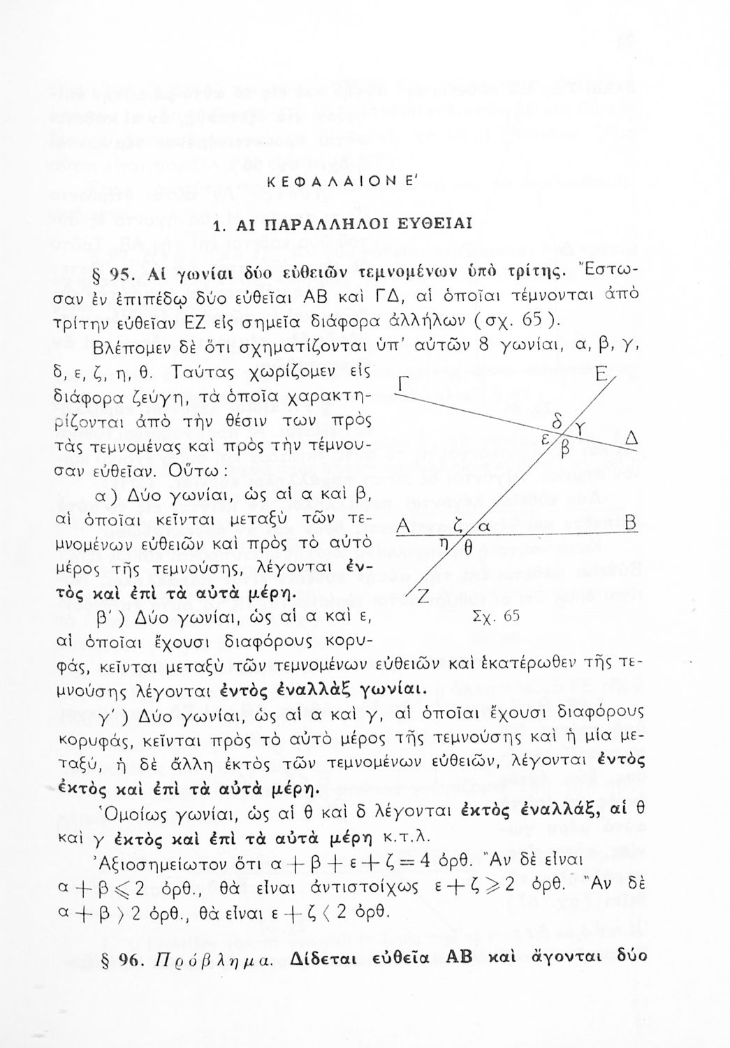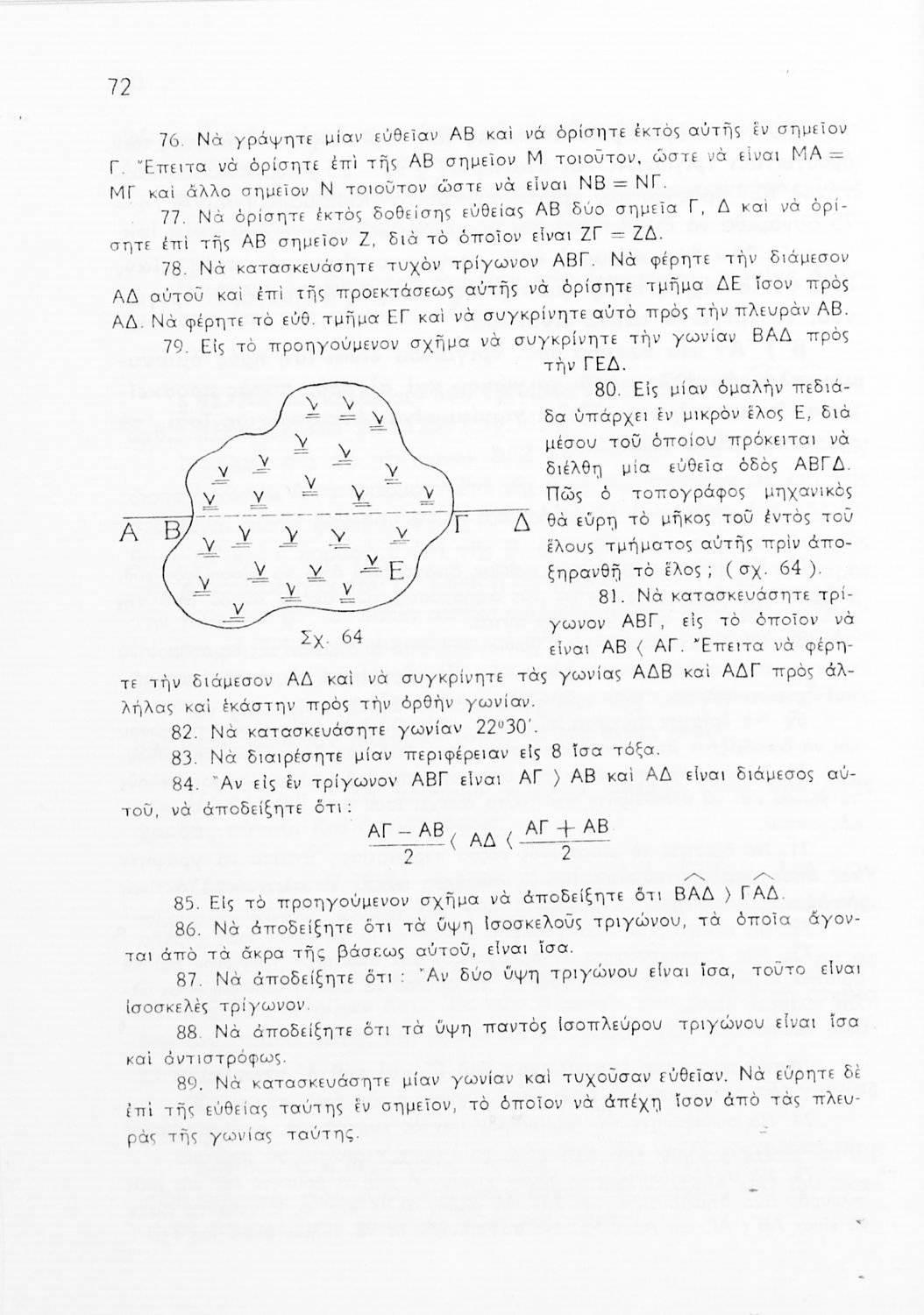 Σχολικό εγχειρίδιο Γεωμετρίας για τις Γ΄, Δ΄, Ε΄, ΣΤ΄ Γυμνασίου που εστιάζει στα βασικά θεωρήματα και ιδιότητες των γεωμετρικών σχημάτων. Φέρει το σύμβολο της δικτατορίας.