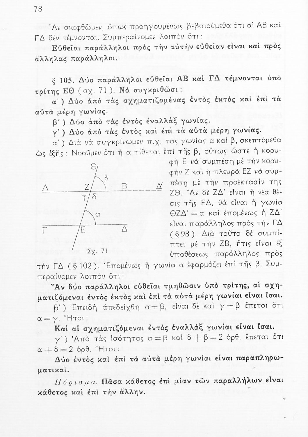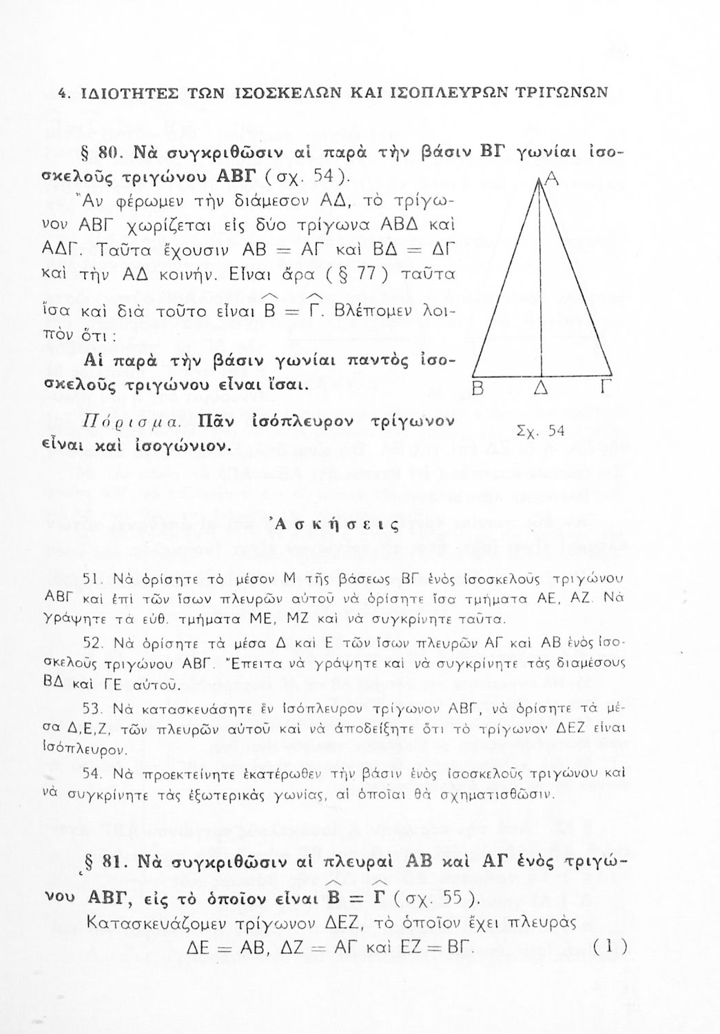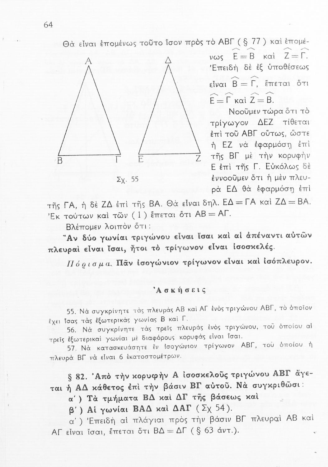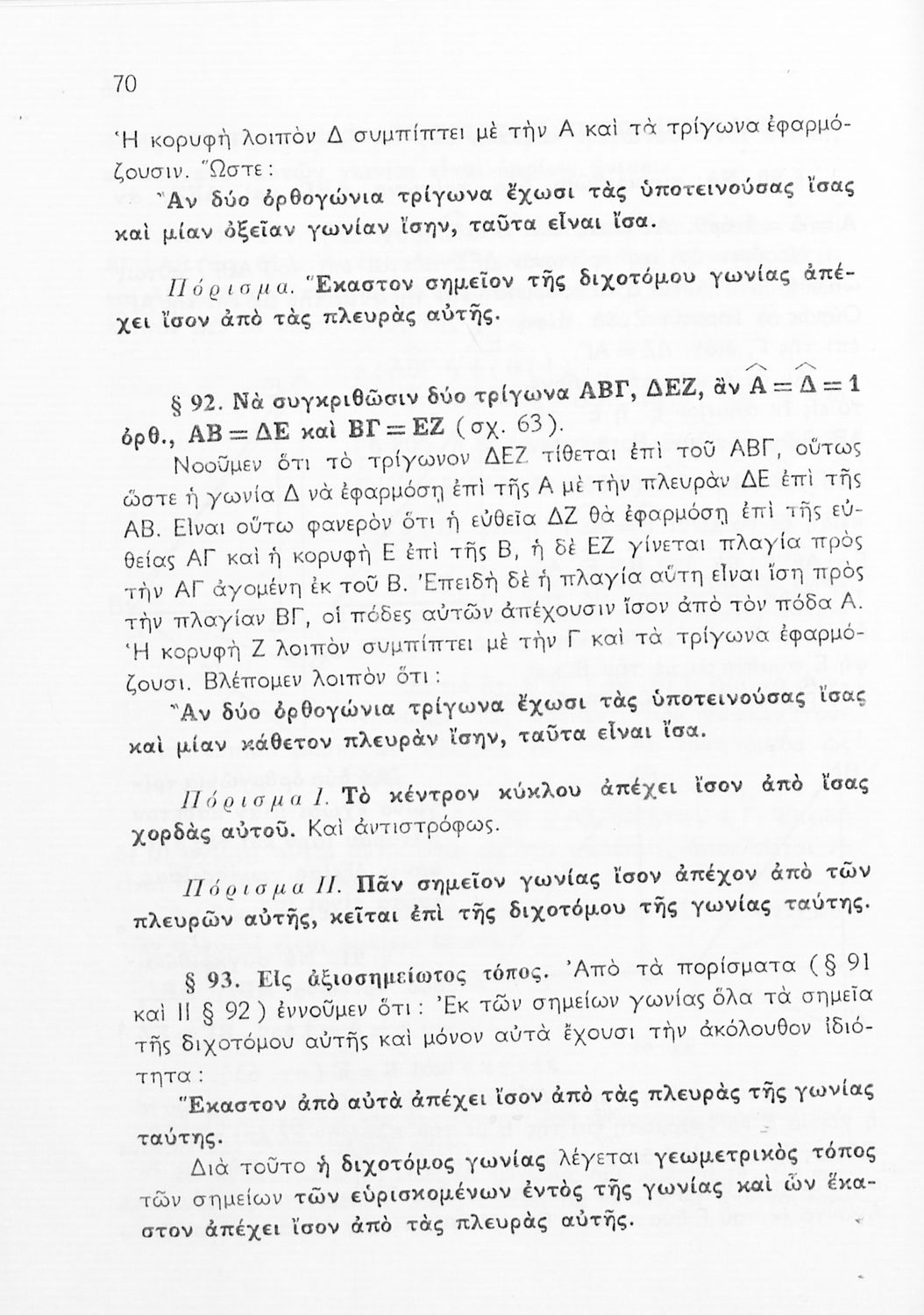 Σχολικό εγχειρίδιο Γεωμετρίας για τις Γ΄, Δ΄, Ε΄, ΣΤ΄ Γυμνασίου που εστιάζει στα βασικά θεωρήματα και ιδιότητες των γεωμετρικών σχημάτων. Φέρει το σύμβολο της δικτατορίας.