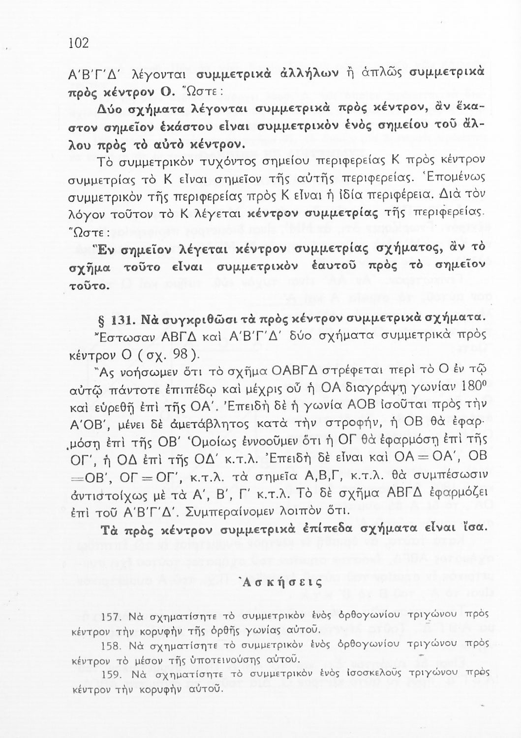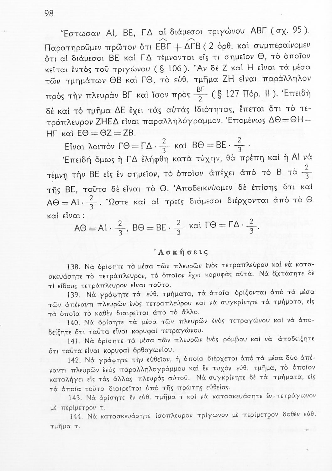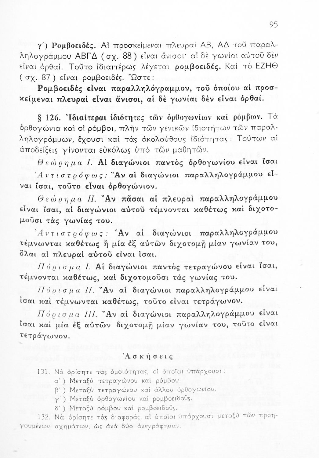 Σχολικό εγχειρίδιο Γεωμετρίας για τις Γ΄, Δ΄, Ε΄, ΣΤ΄ Γυμνασίου που περιλαμβάνει θεωρία και ασκήσεις και είναι χωρισμένο σε Επιπεδομετρία και Στερεομετρία.