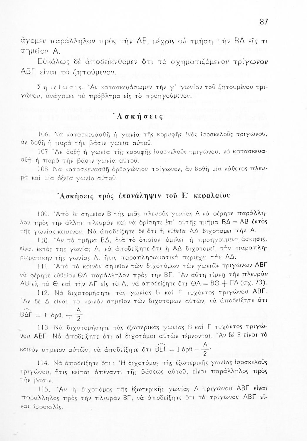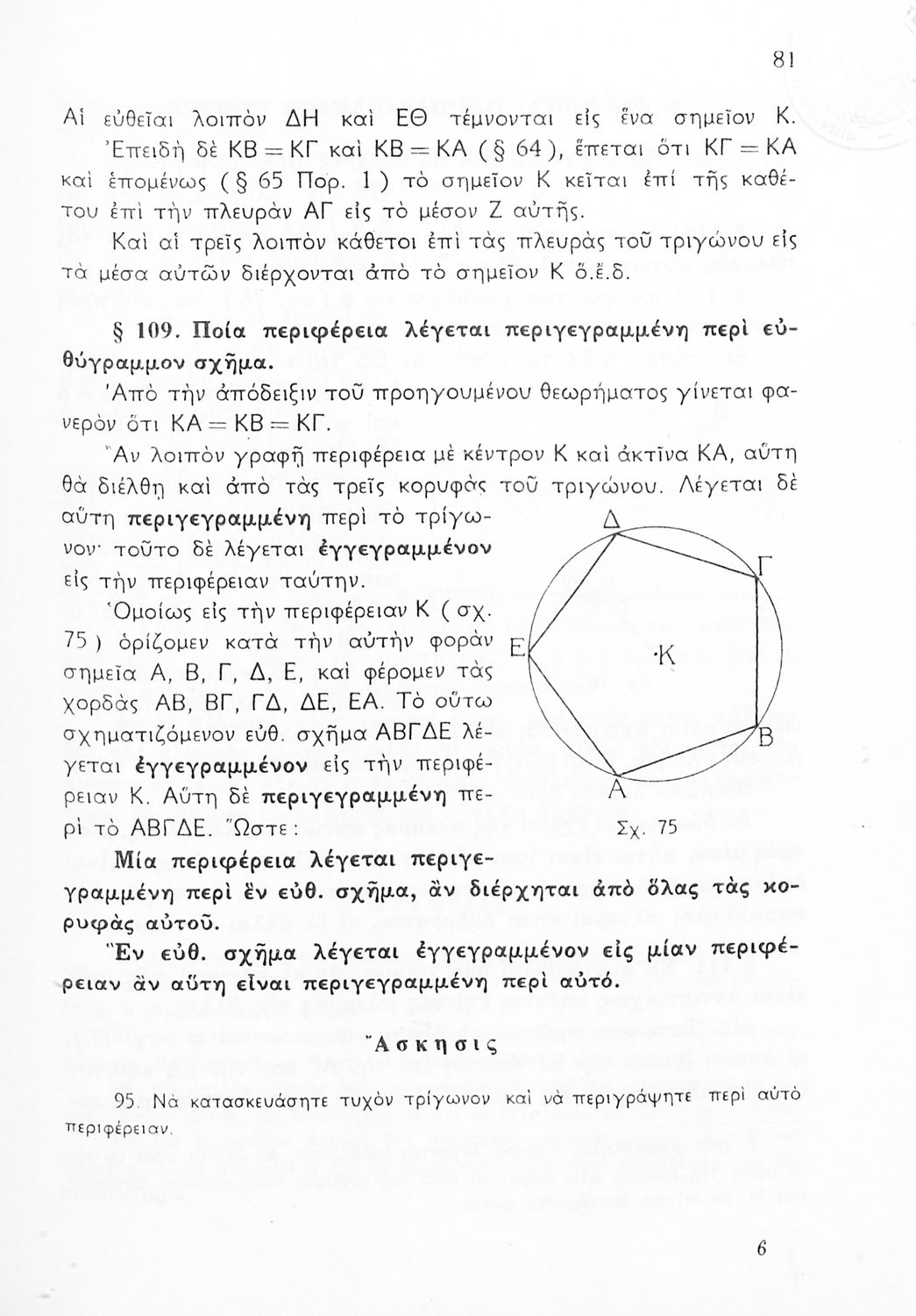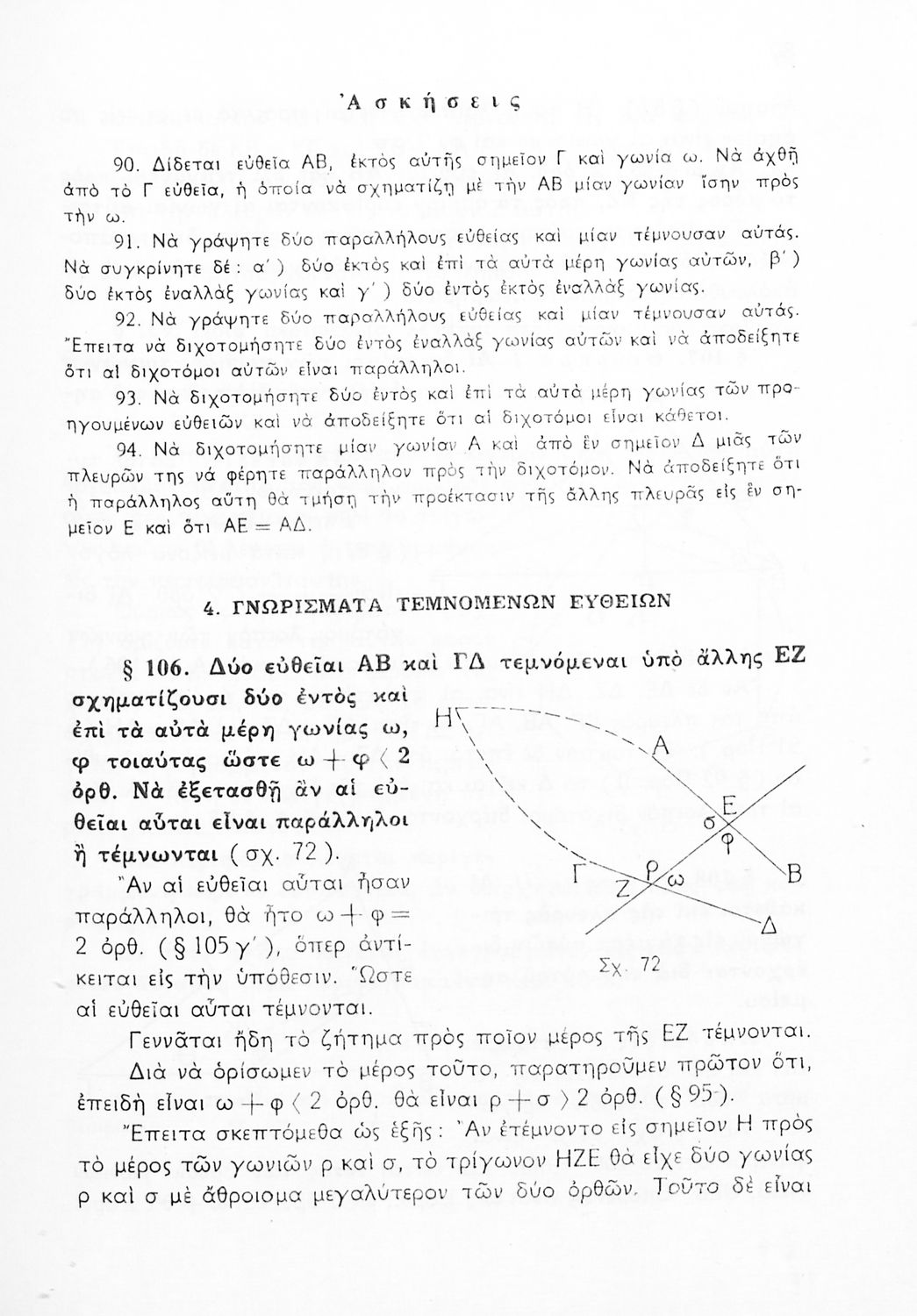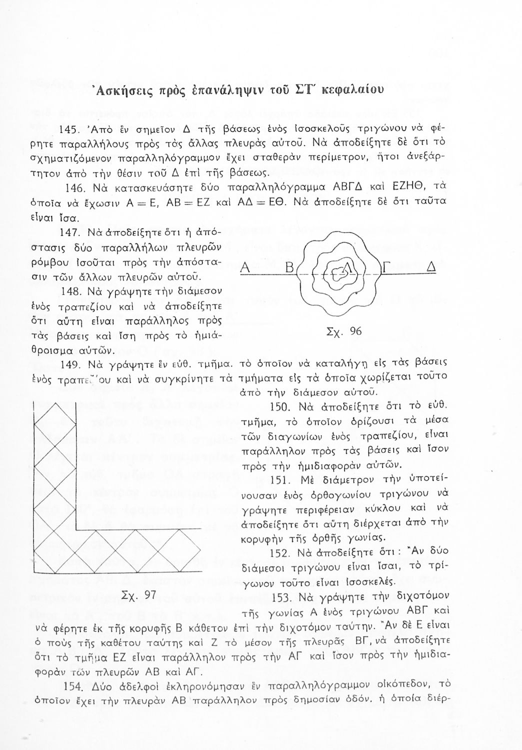 Σχολικό εγχειρίδιο Γεωμετρίας για τις Γ΄, Δ΄, Ε΄, ΣΤ΄ Γυμνασίου που εστιάζει στα βασικά θεωρήματα και ιδιότητες των γεωμετρικών σχημάτων. Φέρει το σύμβολο της δικτατορίας.