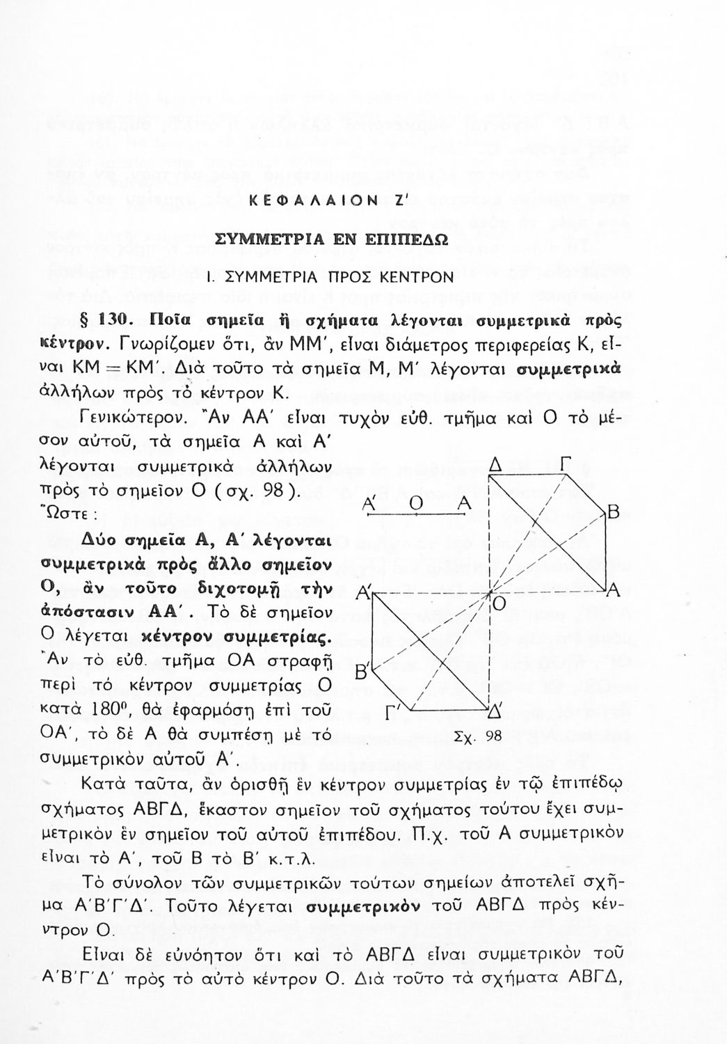 Σχολικό εγχειρίδιο Γεωμετρίας για τις Γ΄, Δ΄, Ε΄, ΣΤ΄ Γυμνασίου που περιλαμβάνει θεωρία και ασκήσεις και είναι χωρισμένο σε Επιπεδομετρία και Στερεομετρία. Φέρει το σύμβολο της δικτατορίας.