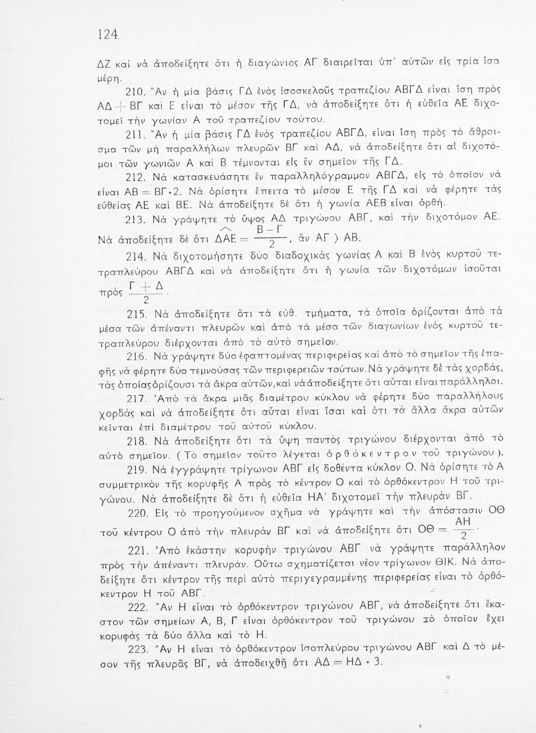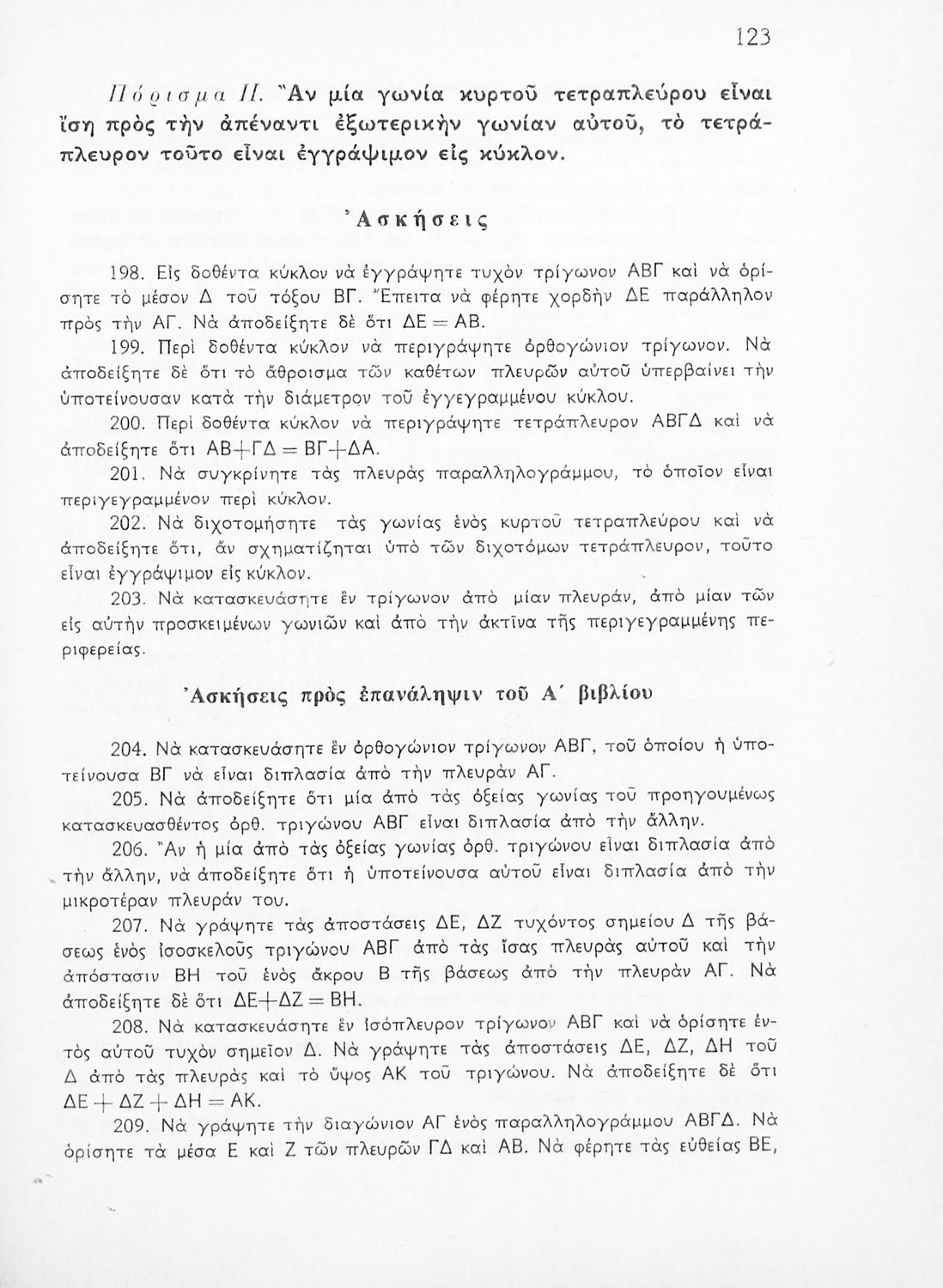 Σχολικό εγχειρίδιο Γεωμετρίας Γυμνασίου που είναι χωρισμένο σε θεωρήματα και ασκήσεις και εστιάζει στα βασικά θεωρήματα και ιδιότητες των γεωμετρικών σχημάτων. .