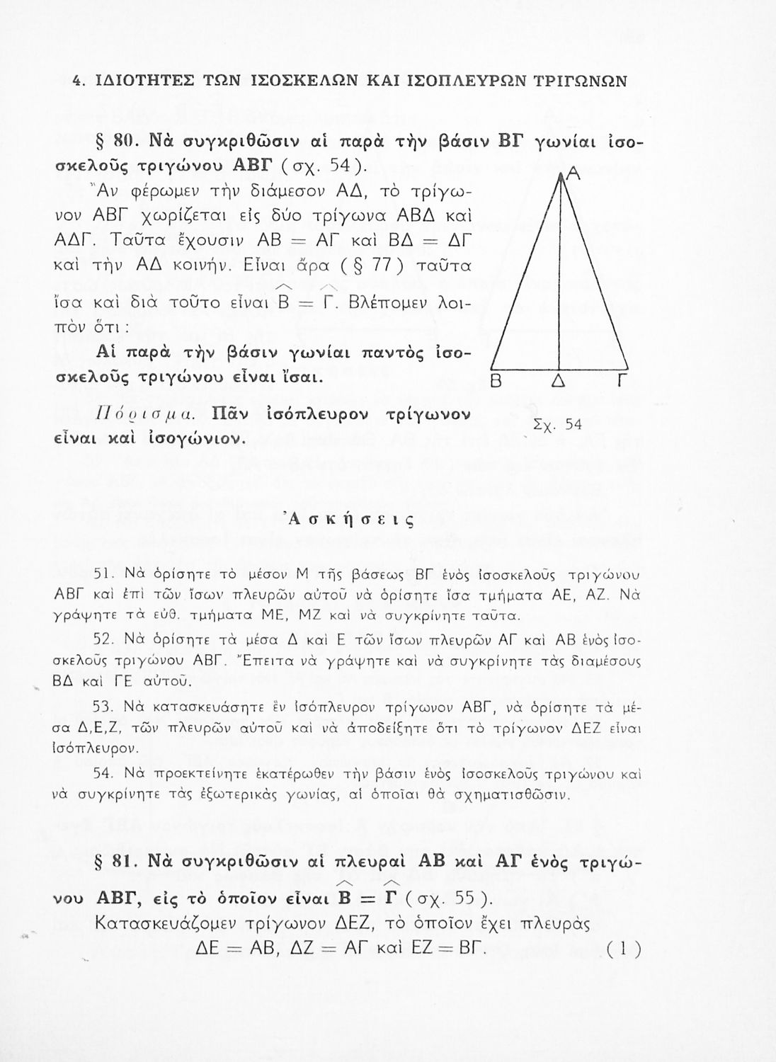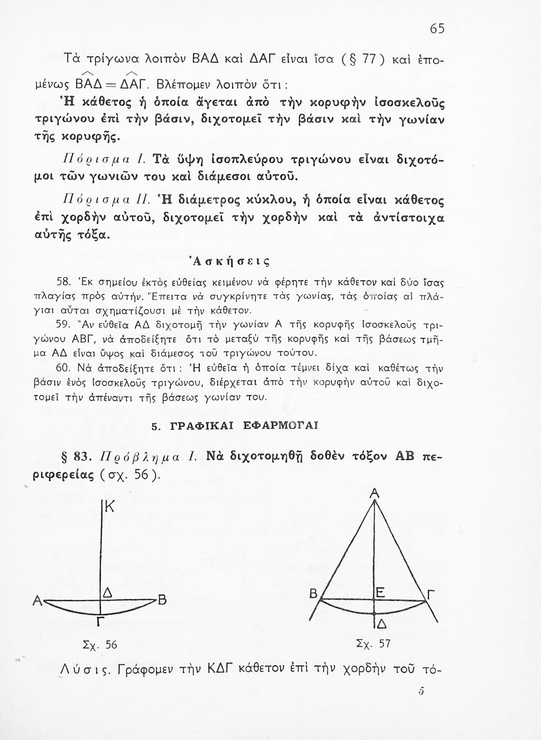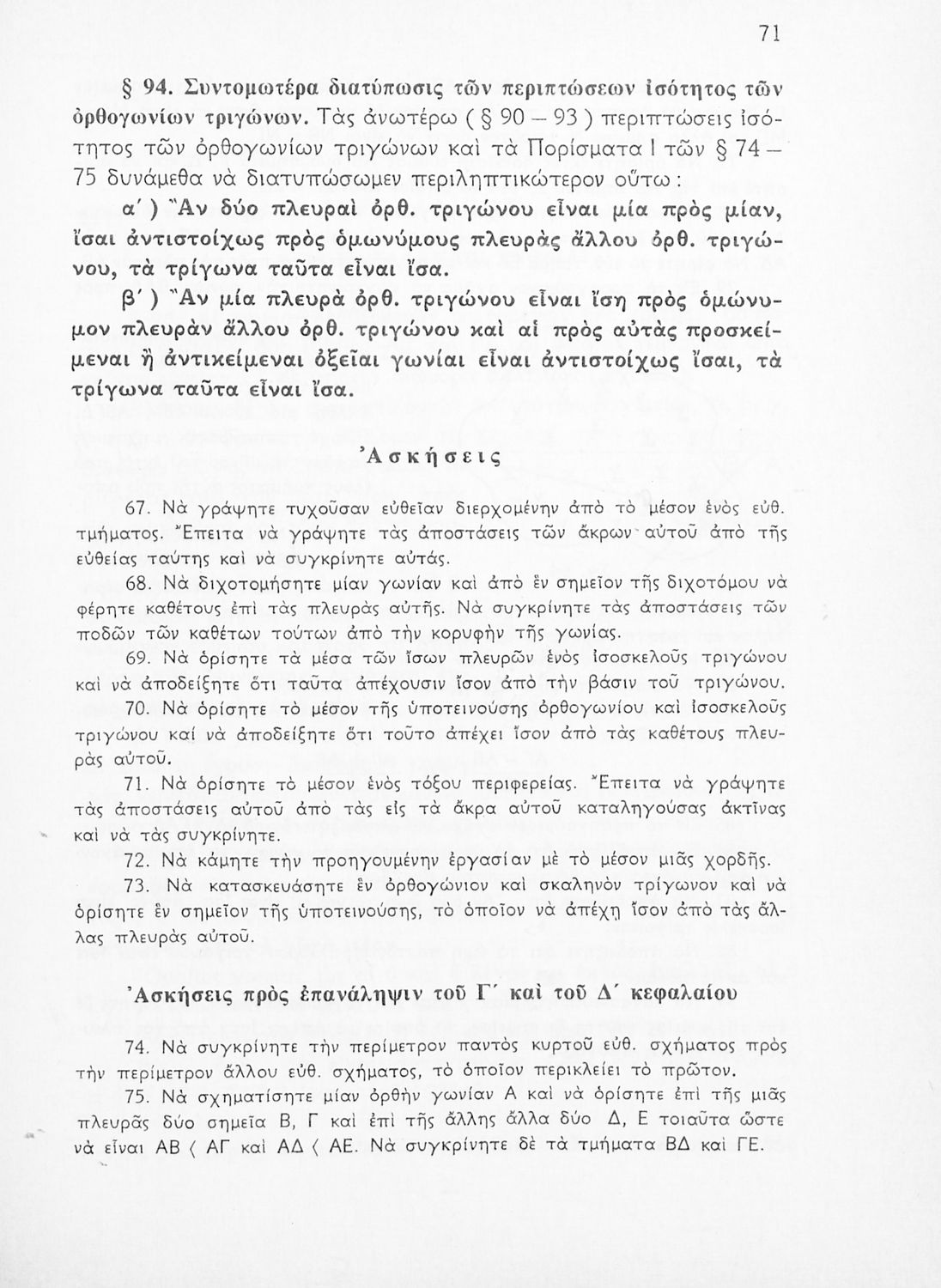 Σχολικό εγχειρίδιο Γεωμετρίας Γυμνασίου που είναι χωρισμένο σε θεωρήματα και ασκήσεις και εστιάζει στα βασικά θεωρήματα και ιδιότητες των γεωμετρικών σχημάτων. .