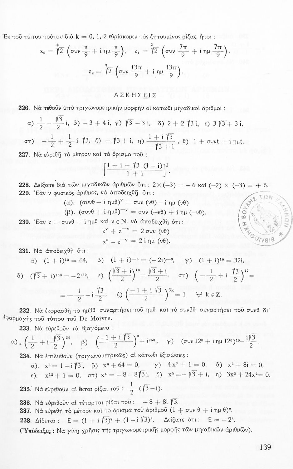 Σχολικό εγχειρίδιο Μαθηματικών για την Ε΄ Γυμνασίου, χωρισμένο σε προβλήματα, εφαρμογές και ασκήσεις, που εστιάζει στην Τριγωνομετρία. Φέρει το σύμβολο της δικτατορίας.