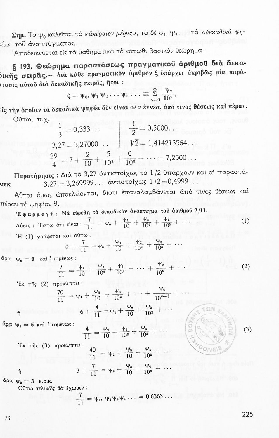 Σχολικό εγχειρίδιο Μαθηματικών Δ΄ και Ε΄ Γυμνασίου που είναι χωρισμένο σε θεωρήματα και ασκήσεις και εστιάζει στη Γεωμετρία. Φέρει το σύμβολο της δικτατορίας.