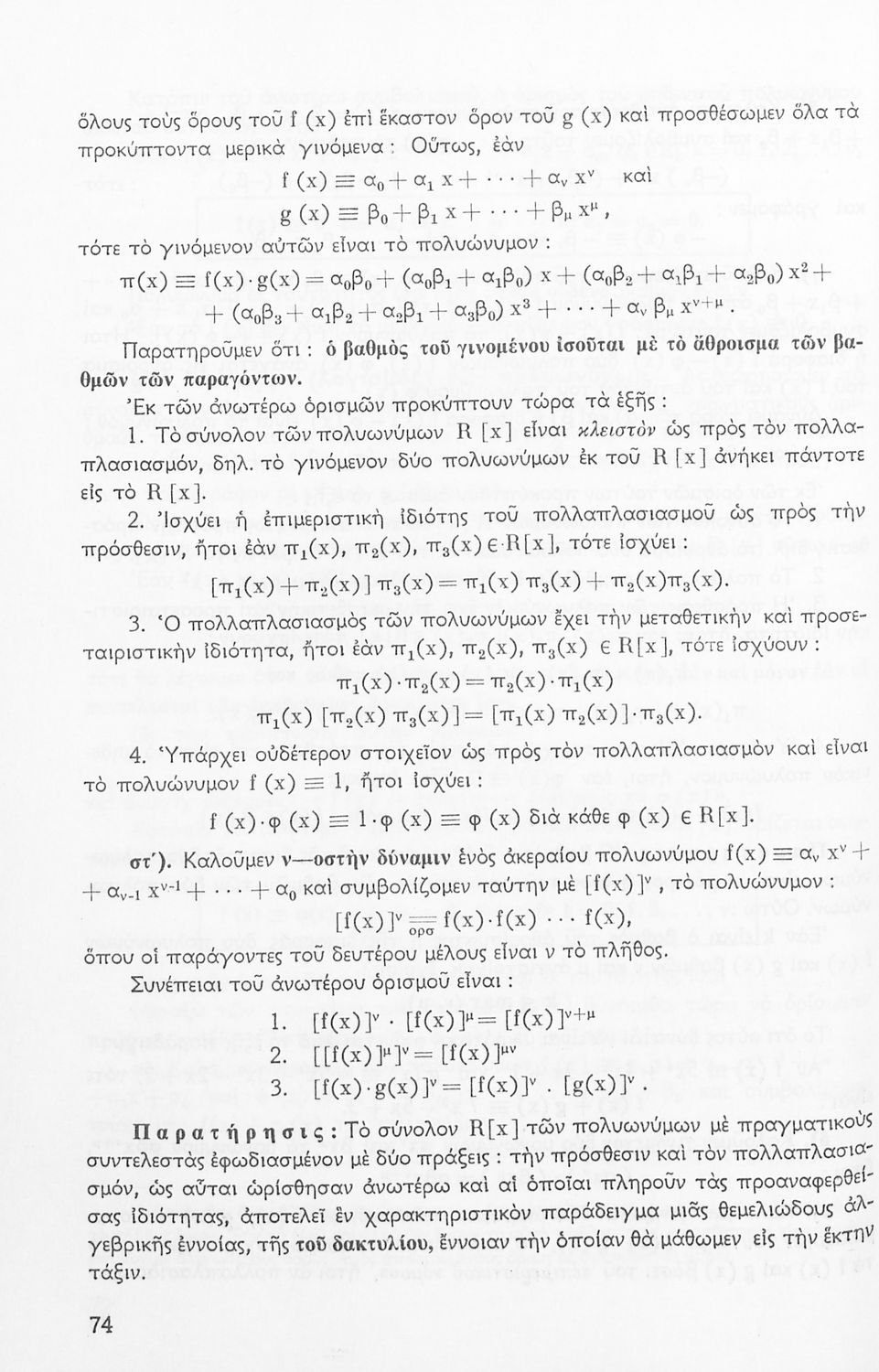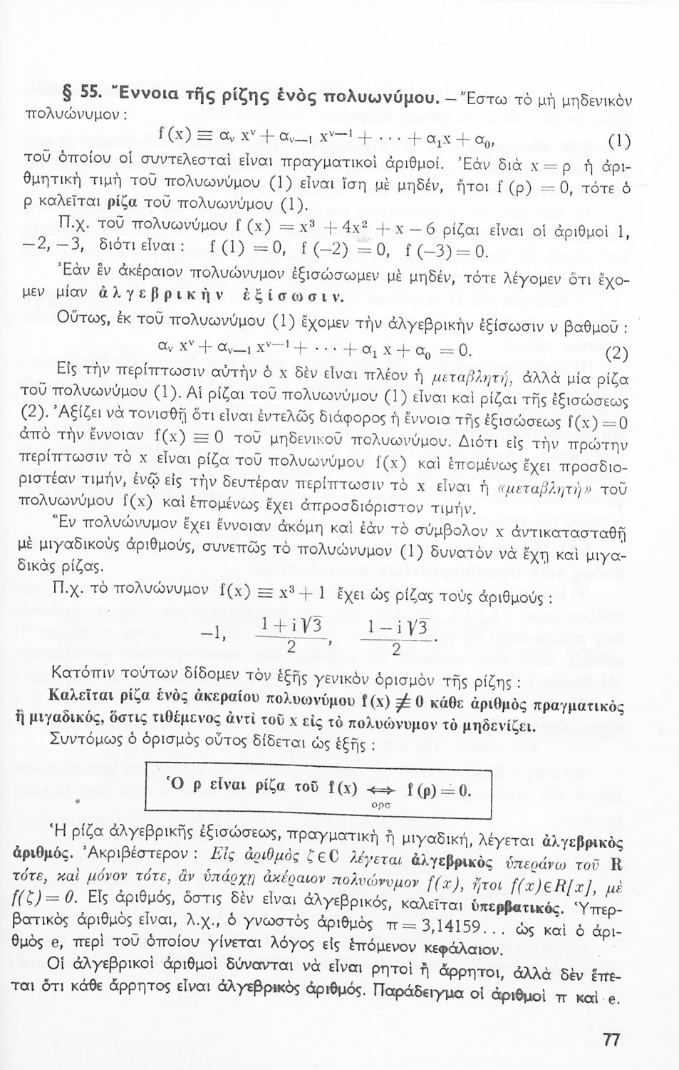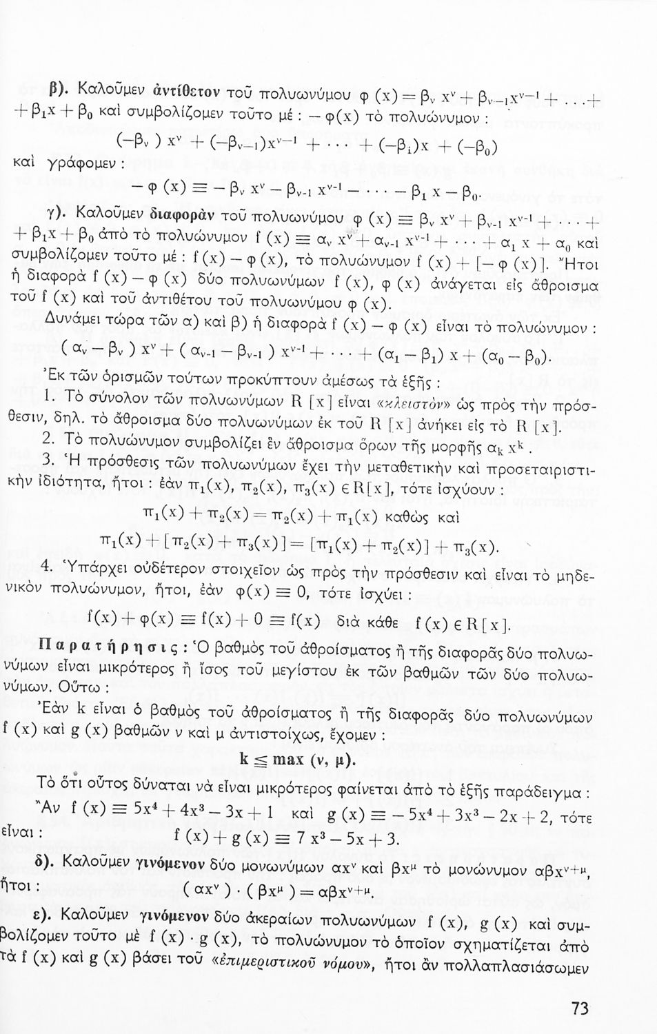 Σχολικό εγχειρίδιο Μαθηματικών Ε' Γυμνασίου που εστιάζει στη θεωρίας των συνόλων, τα ακέραια πολυώνυμα, τους πραγματικούς αριθμούς και τις πιθανότητες. Φέρει το σύμβολο της δικτατορίας.