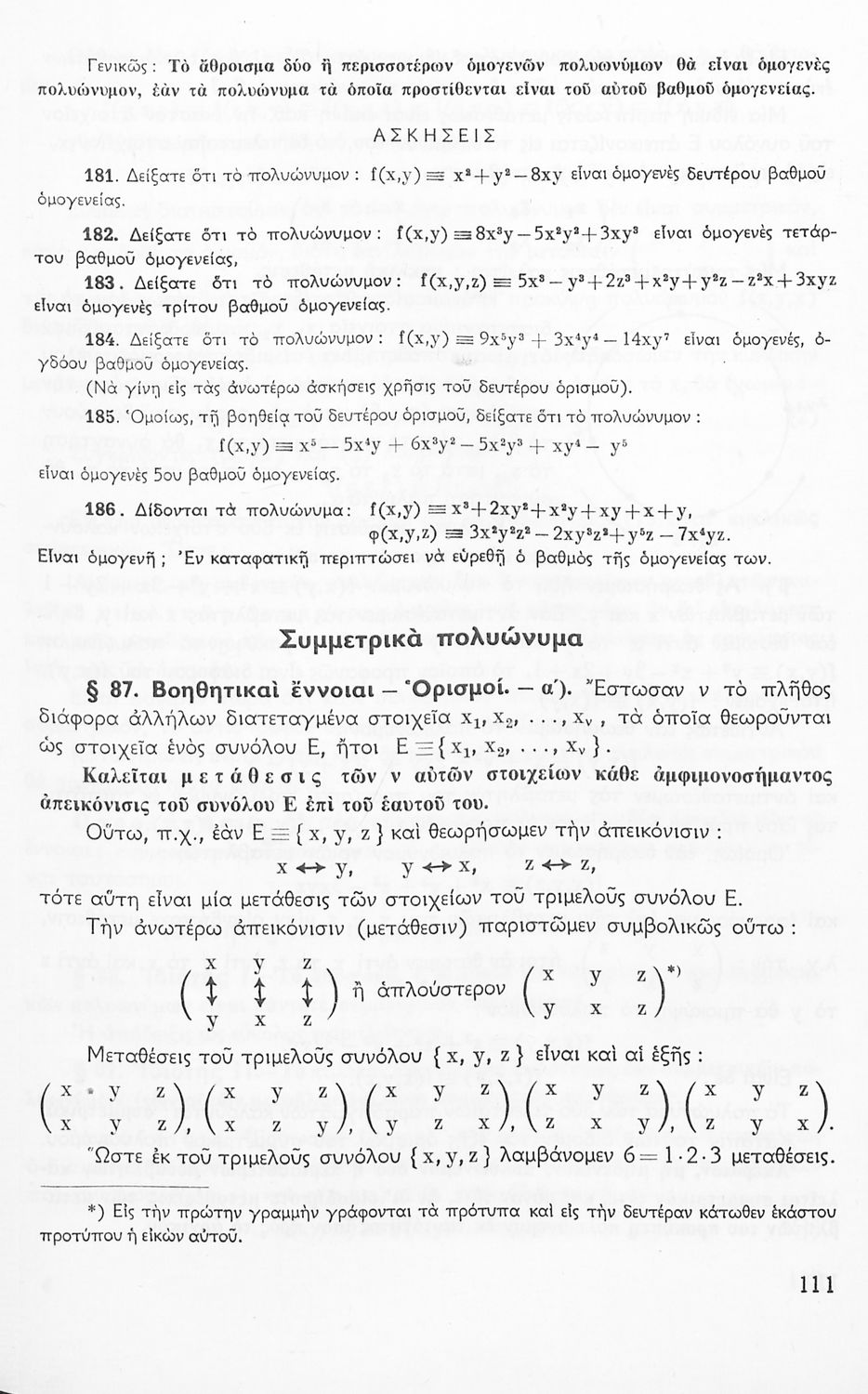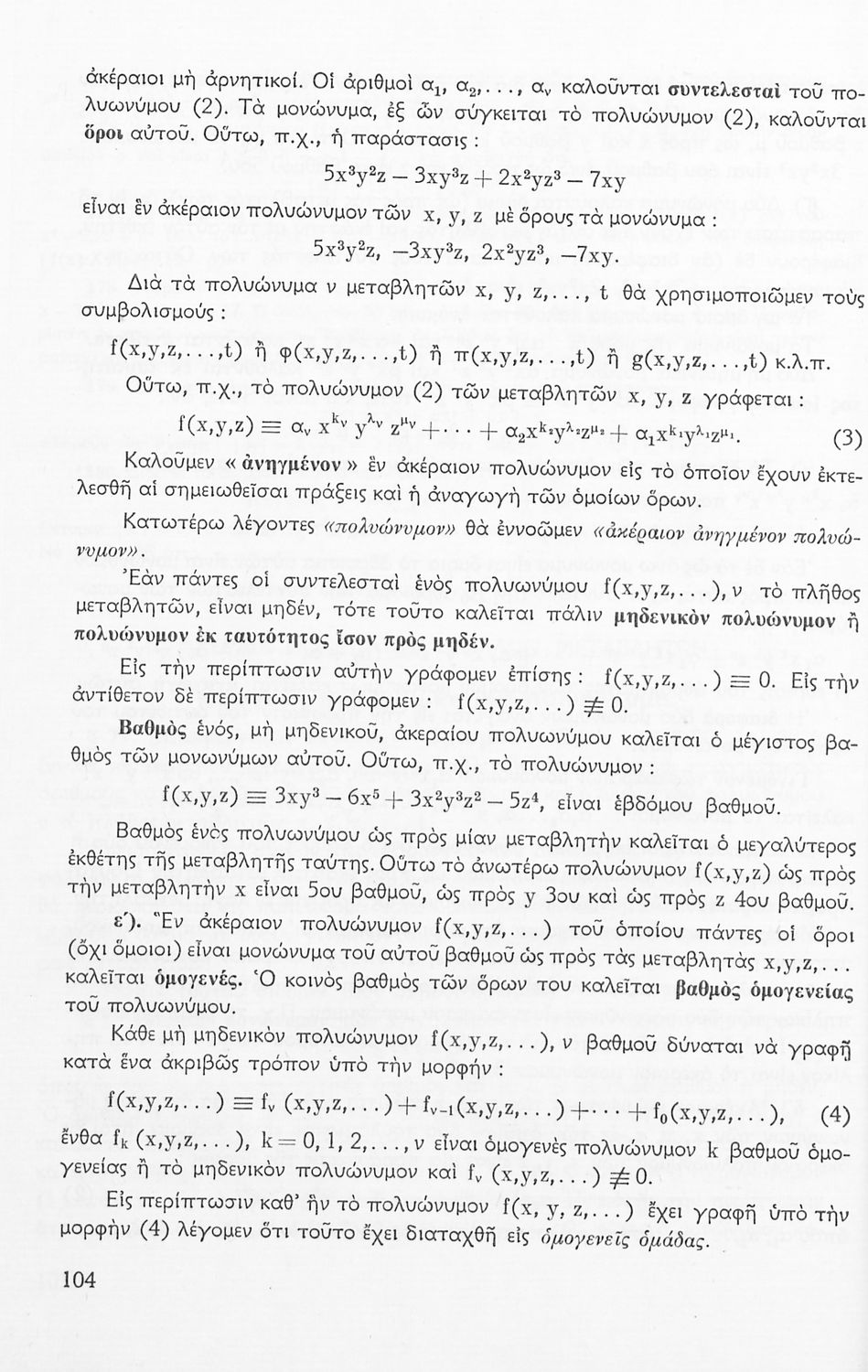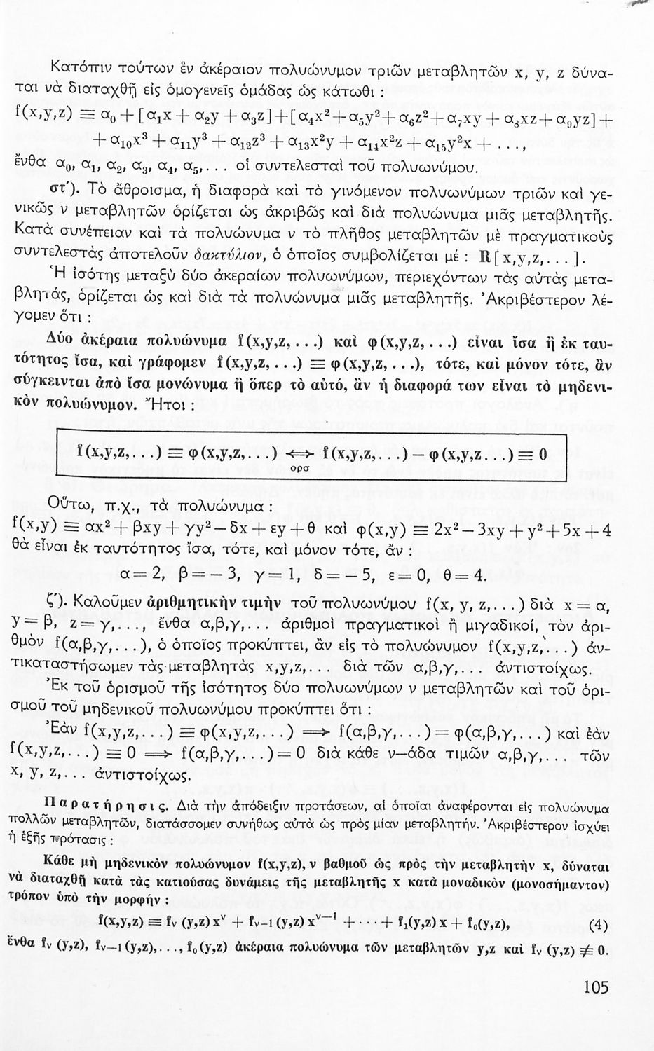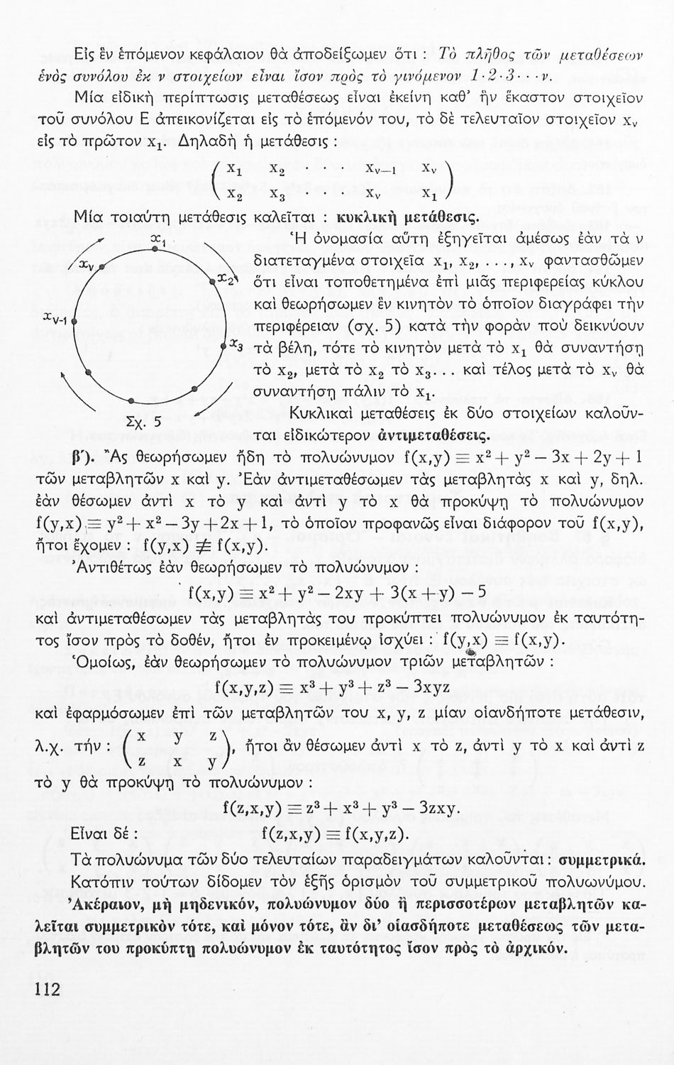 Σχολικό εγχειρίδιο Μαθηματικών Ε' Γυμνασίου που εστιάζει στη θεωρίας των συνόλων, τα ακέραια πολυώνυμα, τους πραγματικούς αριθμούς και τις πιθανότητες. Φέρει το σύμβολο της δικτατορίας.