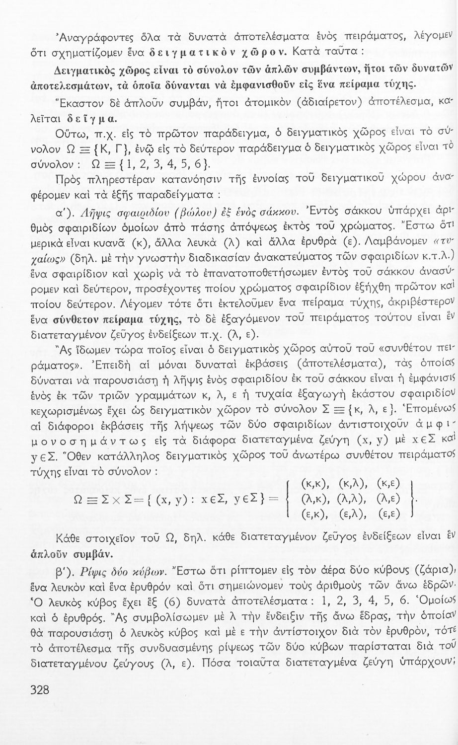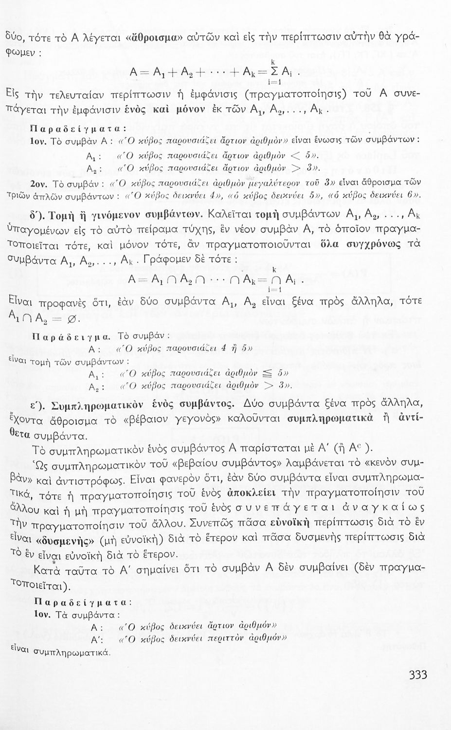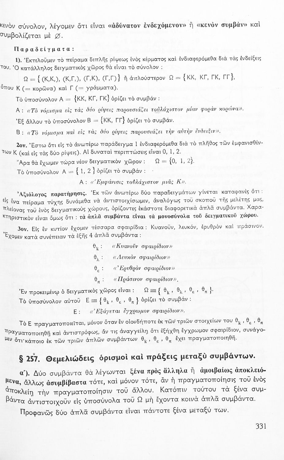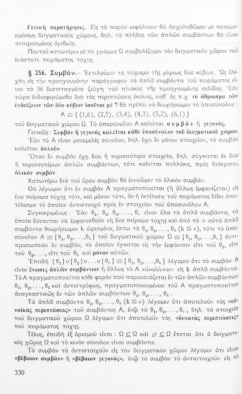 Σχολικό εγχειρίδιο Μαθηματικών Ε' Γυμνασίου που εστιάζει στη θεωρίας των συνόλων, τα ακέραια πολυώνυμα, τους πραγματικούς αριθμούς και τις πιθανότητες. Φέρει το σύμβολο της δικτατορίας.