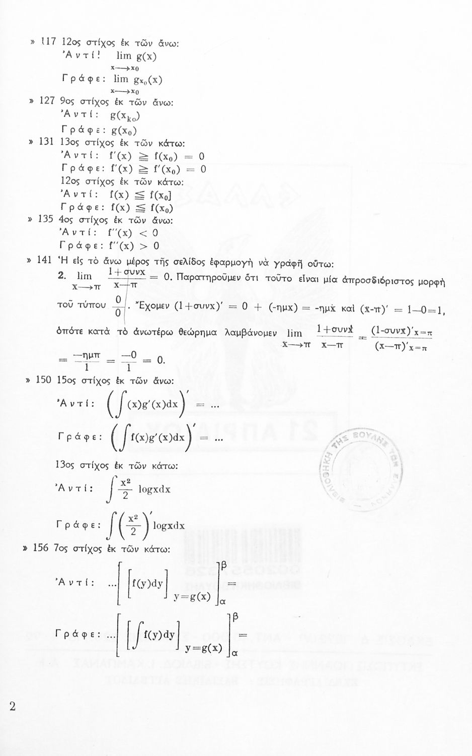 LDR 01346 2200217 4500 035 ## _a03-20557326 040 ## _aΒιβλιοθήκη της Βουλής των Ελλήνων 041 ## _ael 100 ## _aΒασίλειος Στάϊκος 110 ## _a20557326 245 0# _aΜαθηματικά ΣΤ΄ Γυμνασίου (θετικής κατευθύνσεως) Τόμος Πρώτος 250 ## _a4η Έκδοση 260 ## _aΑθήνα _bΟργανισμός Εκδόσεως Διδακτικών Βιβλίων _c1972 300 ## _a168 _bΣχήματα (ασπρόμαυρα) 520 ## _aΤο σύγγραμμα ήταν σχολικό εγχειρίδιο για το μάθημα των Μαθηματικών στο Γυμνάσιο. Περιέχει βασικές γνώσεις 'Άλγεβρας, σύνολα, συναρτήσεις, ολοκληρώματα, λογάριθμους, παραγώγους συναρτήσεων. Εκτός από τη θεωρία το βιβλίο περιέχει και ασκήσεις. 521 ## _aΣΤ' Γυμνασίου 522 ## _aΕλλάδα 546 ## _aΑπλή καθαρεύουσα 563 ## _aΜαλακό Εξώφυλλο 583 ## _a2057/18-4-1972 _c1972 650 #4 _aΆλγεβρα _aΟλοκληρώματα _aΣύγκλιση συναρτήσεως _aΣυναρτήσεις