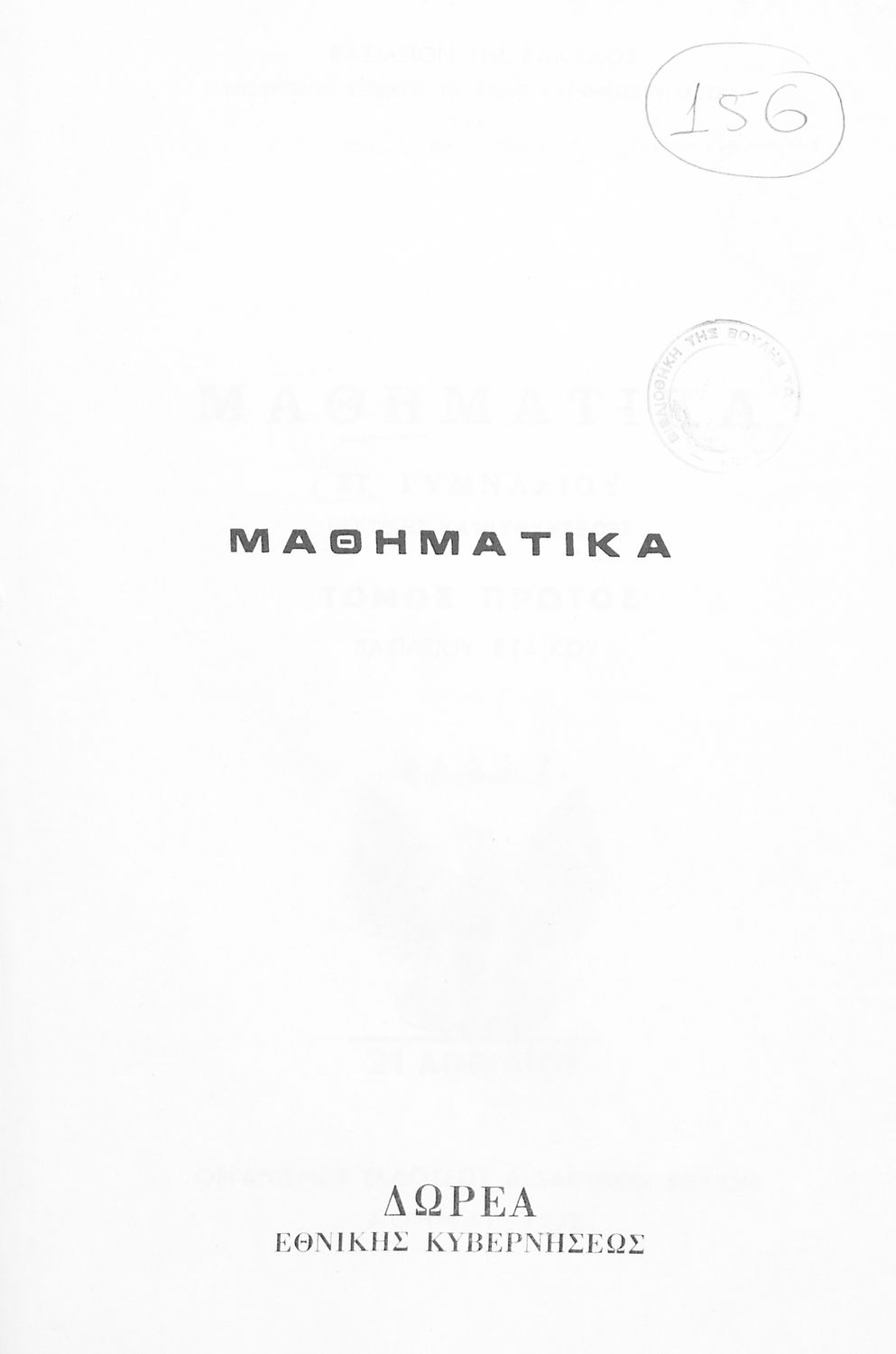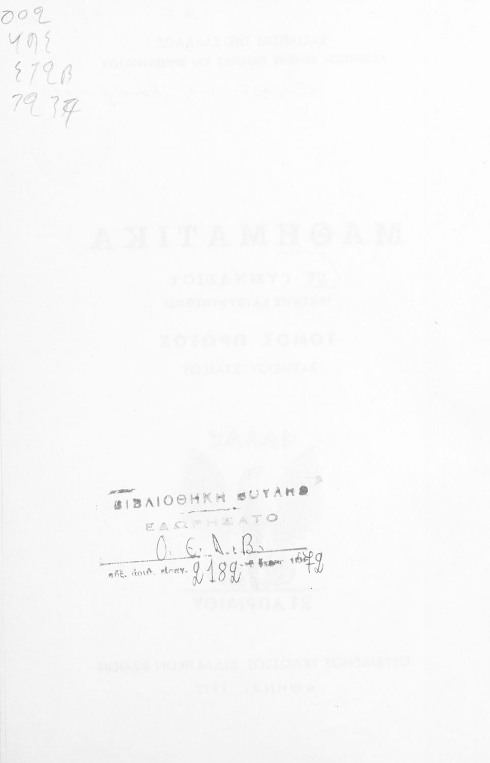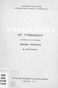 Βαθμίδα εκπαίδευσης: Δευτεροβάθμια Τάξη: ΣΤ' Γυμνασίου Μάθημα: Μαθηματικά Γλώσσα: Απλή καθαρεύουσα Παρουσίαση περιεχομένου: Το σύγγραμμα ήταν σχολικό εγχειρίδιο για το μάθημα των Μαθηματικών στο Γυμνάσιο. Περιέχει βασικές γνώσεις 'Άλγεβρας, σύνολα, συναρτήσεις, ολοκληρώματα, λογάριθμους, παραγώγους συναρτήσεων. Εκτός από τη θεωρία το βιβλίο περιέχει και ασκήσεις. |